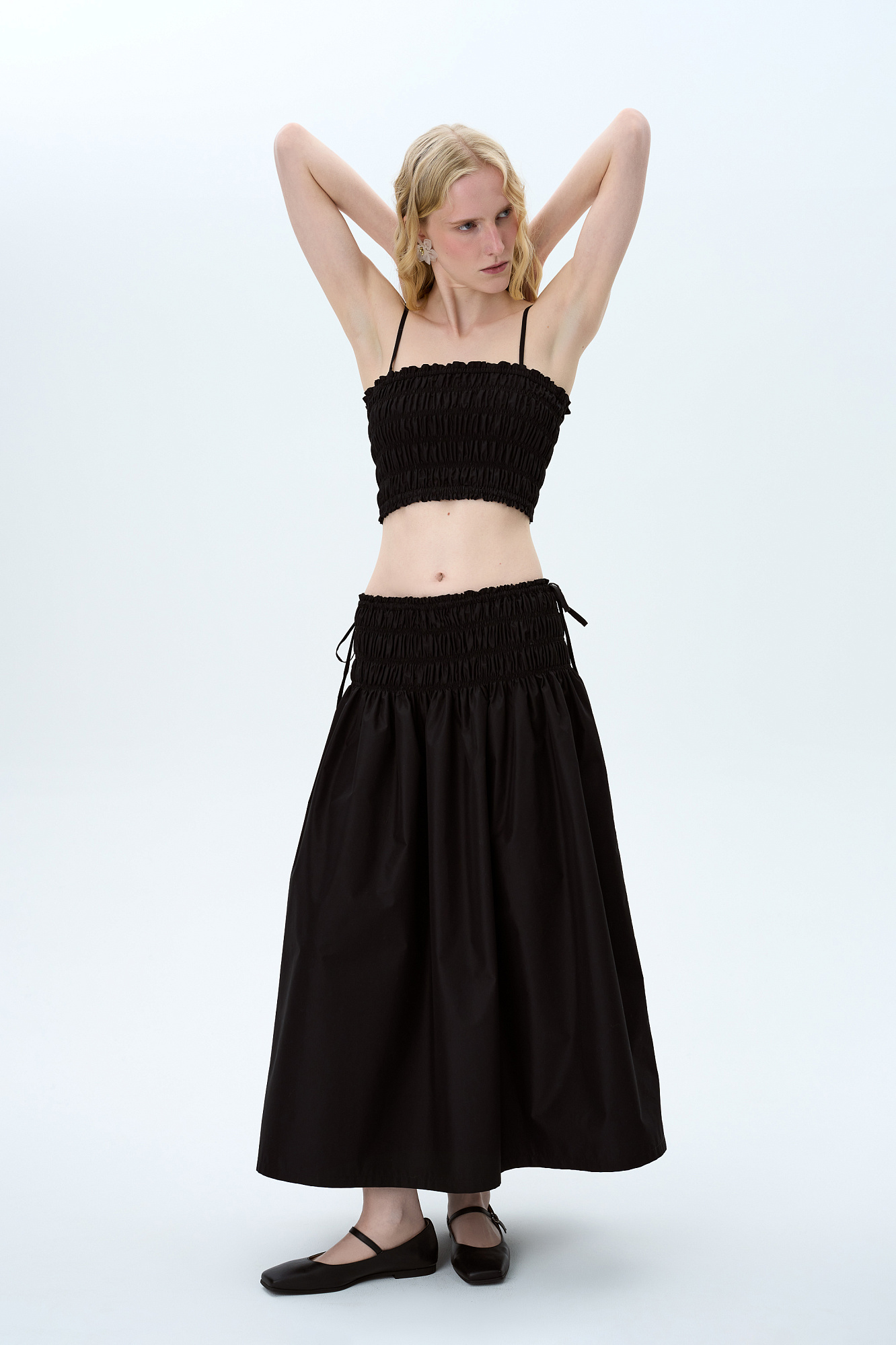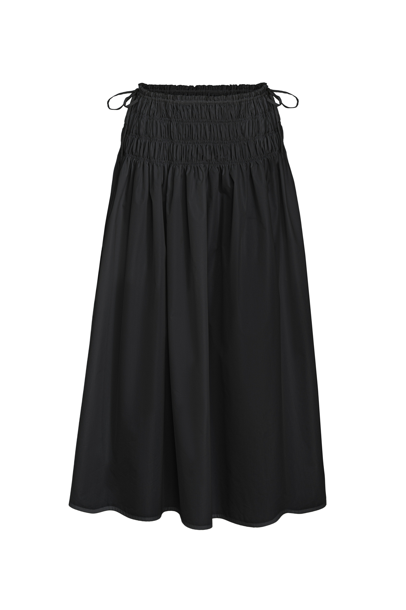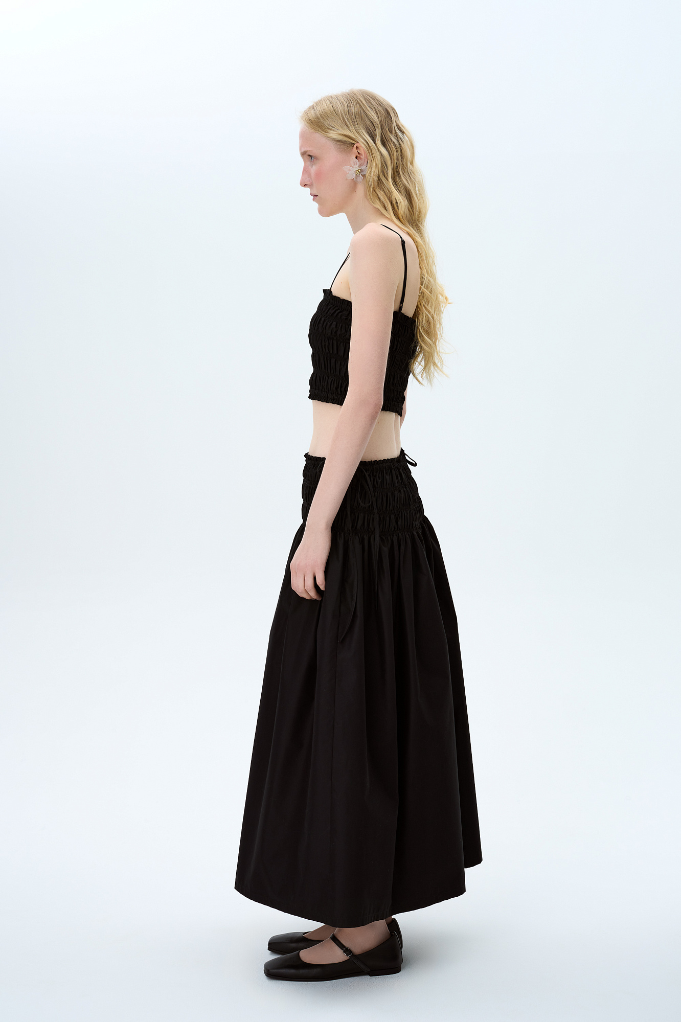 Юбка длины миди из хлопка. Модель свободного силуэта, с эластичными сборками и кулиской на поясе.