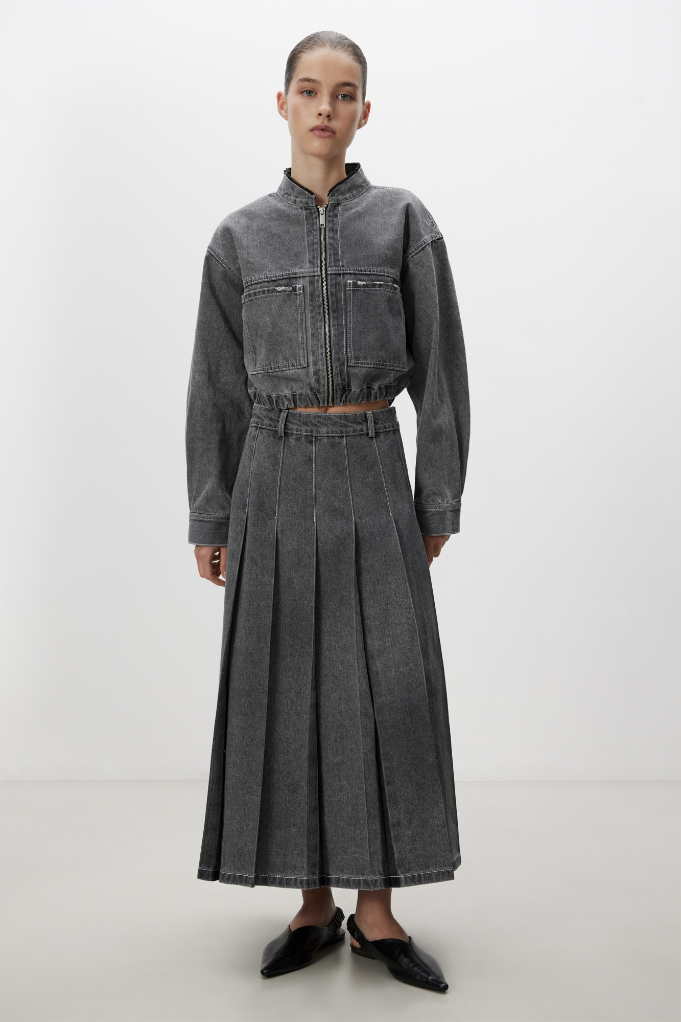 Джинсовая юбка плиссе из 100% хлопка. Модель расклешенного силуэта с боковой застежкой на молнию и пуговицу. Шлевки на поясе для ремня.