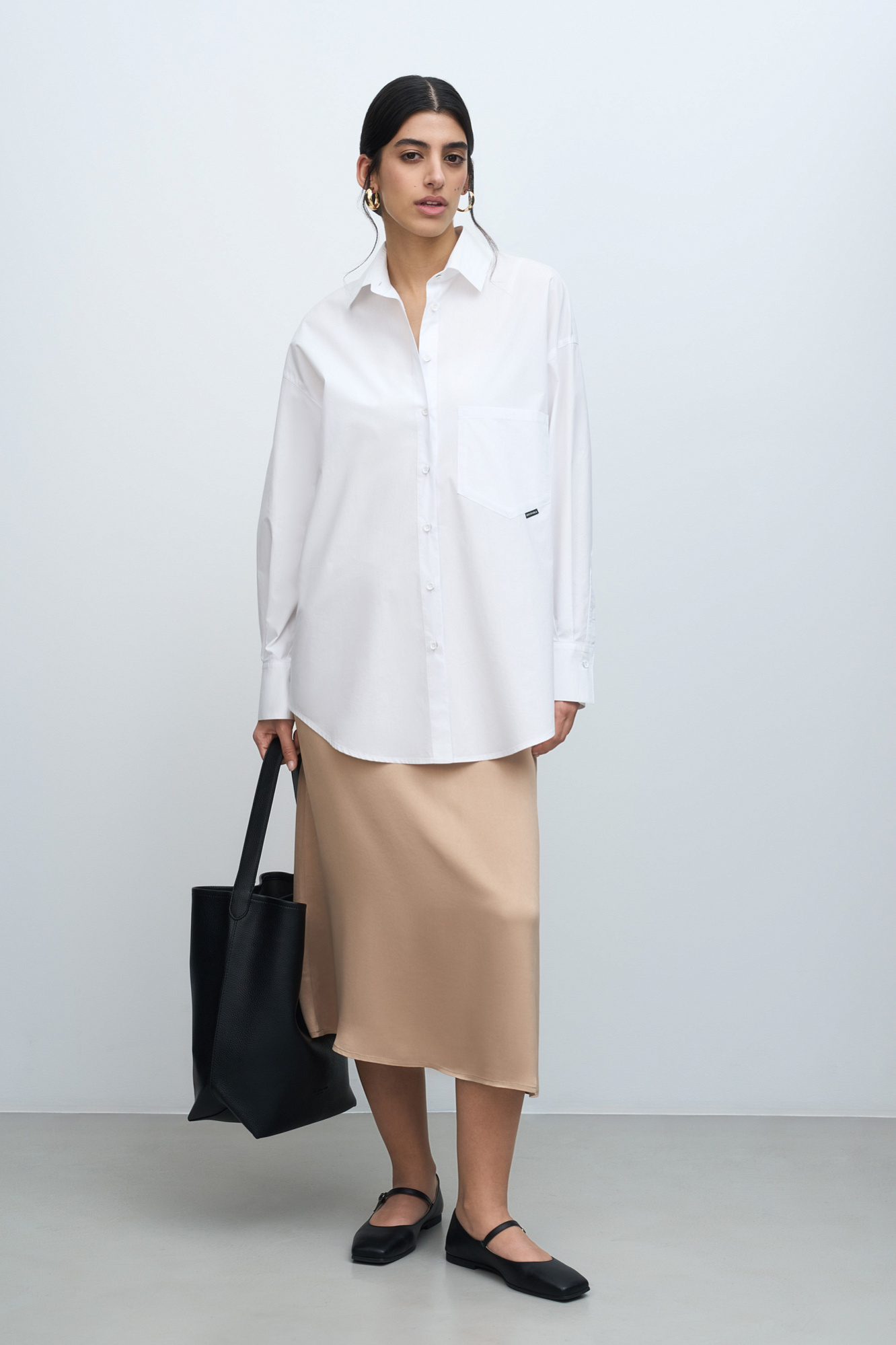 Атласная юбка миди с небольшим расклешением к низу. Состав - 100% вискоза. Застежка на потайную молнию сбоку. Сзади на поясе небольшая резинка.
