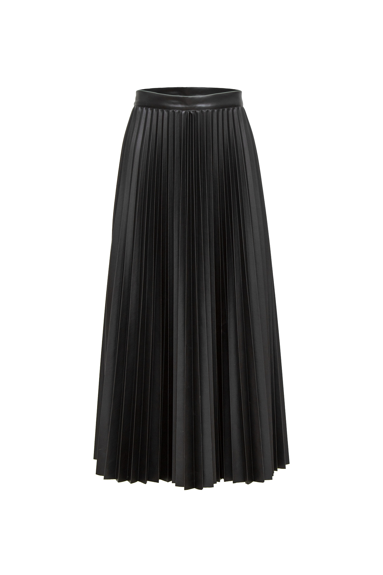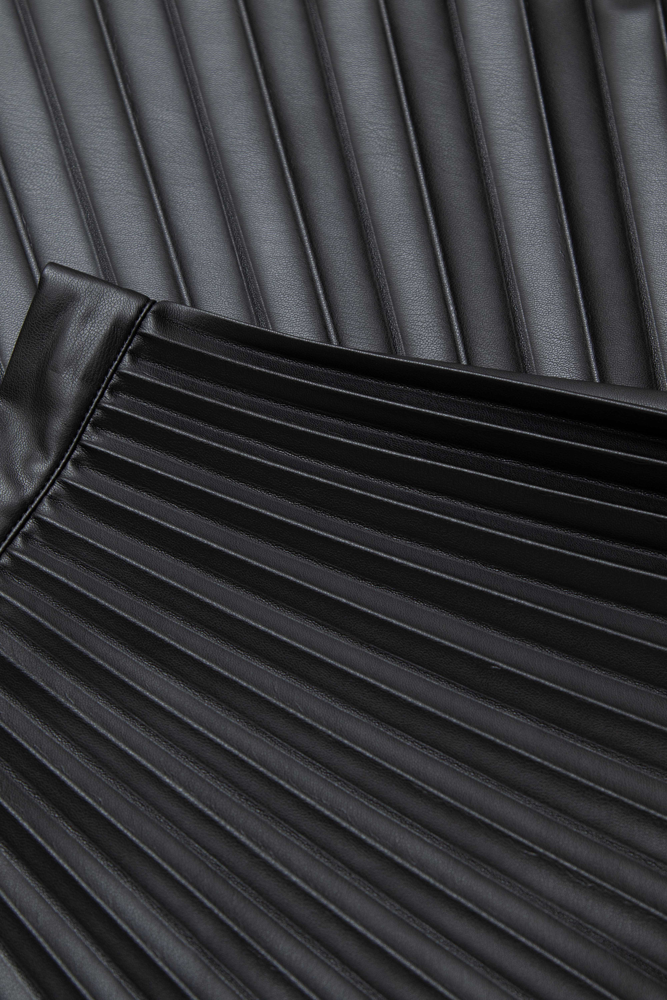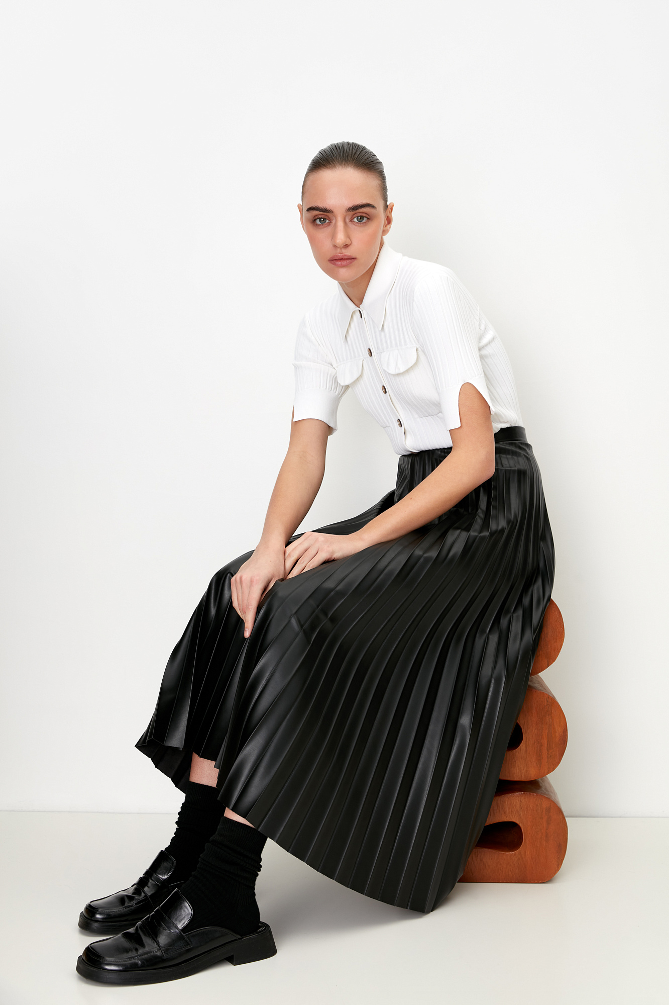 Плиссированная юбка миди из экокожи с эластичным поясом и застежкой на молнии.