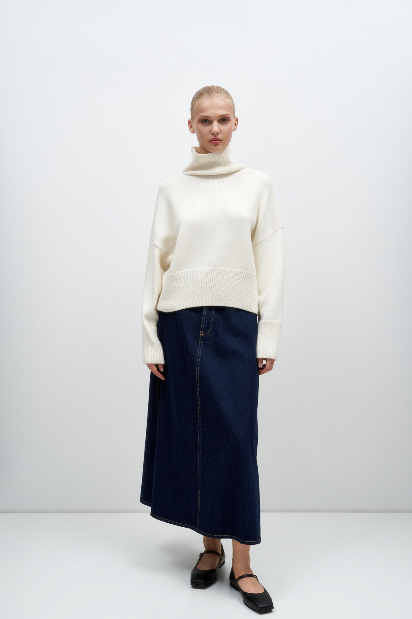 Джинсовая юбка длины миди из 100% хлопка. Модель А-силуэта. Пять карманов, застежка на молнию и пуговицу, паты на поясе для ремня.