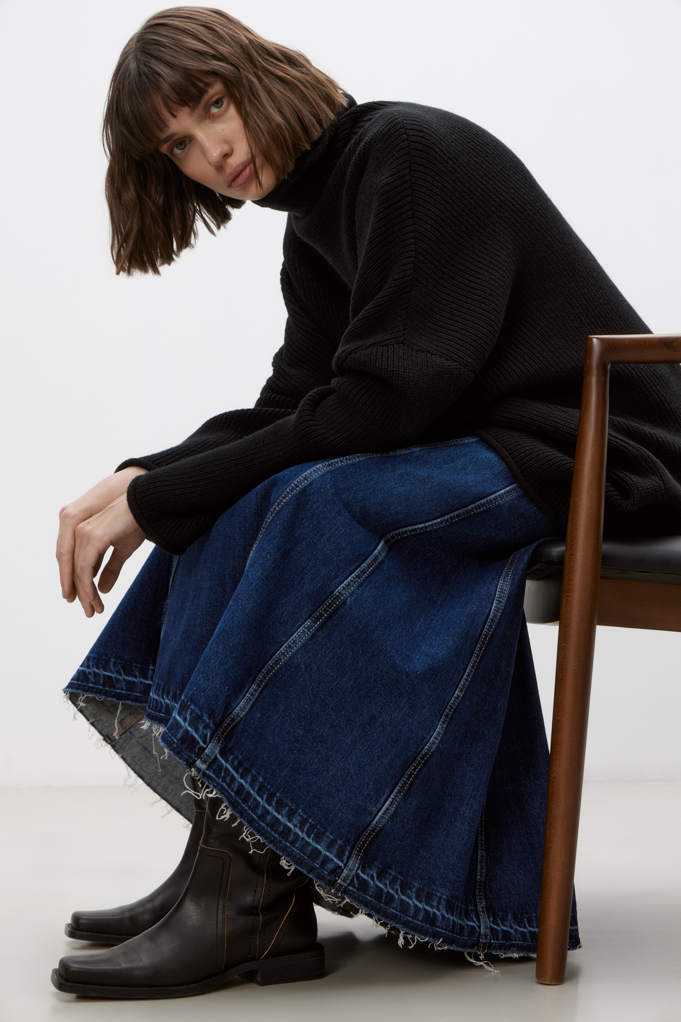 Юбка миди расклешенного кроя из денима. Рельефные швы. Застежка на молнию сзади.