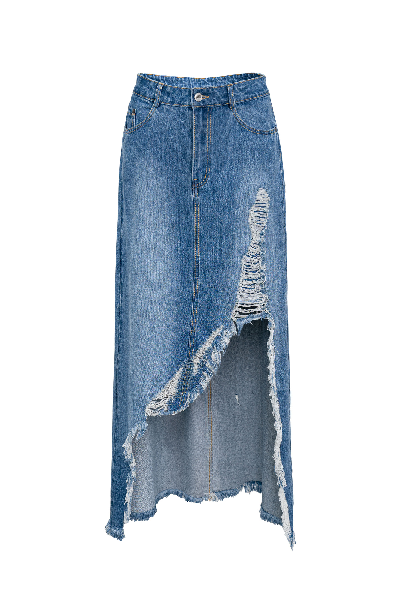 Джинсовая юбка из 100% хлопка в стиле гранж. Модель прямого кроя длины миди, со средней посадкой, пятью карманами и шлевками на поясе для ремня. Застежка на молнию и пуговицу. Изделие декорировано рваным разрезом от бедра, создающим асимметрию юбки.