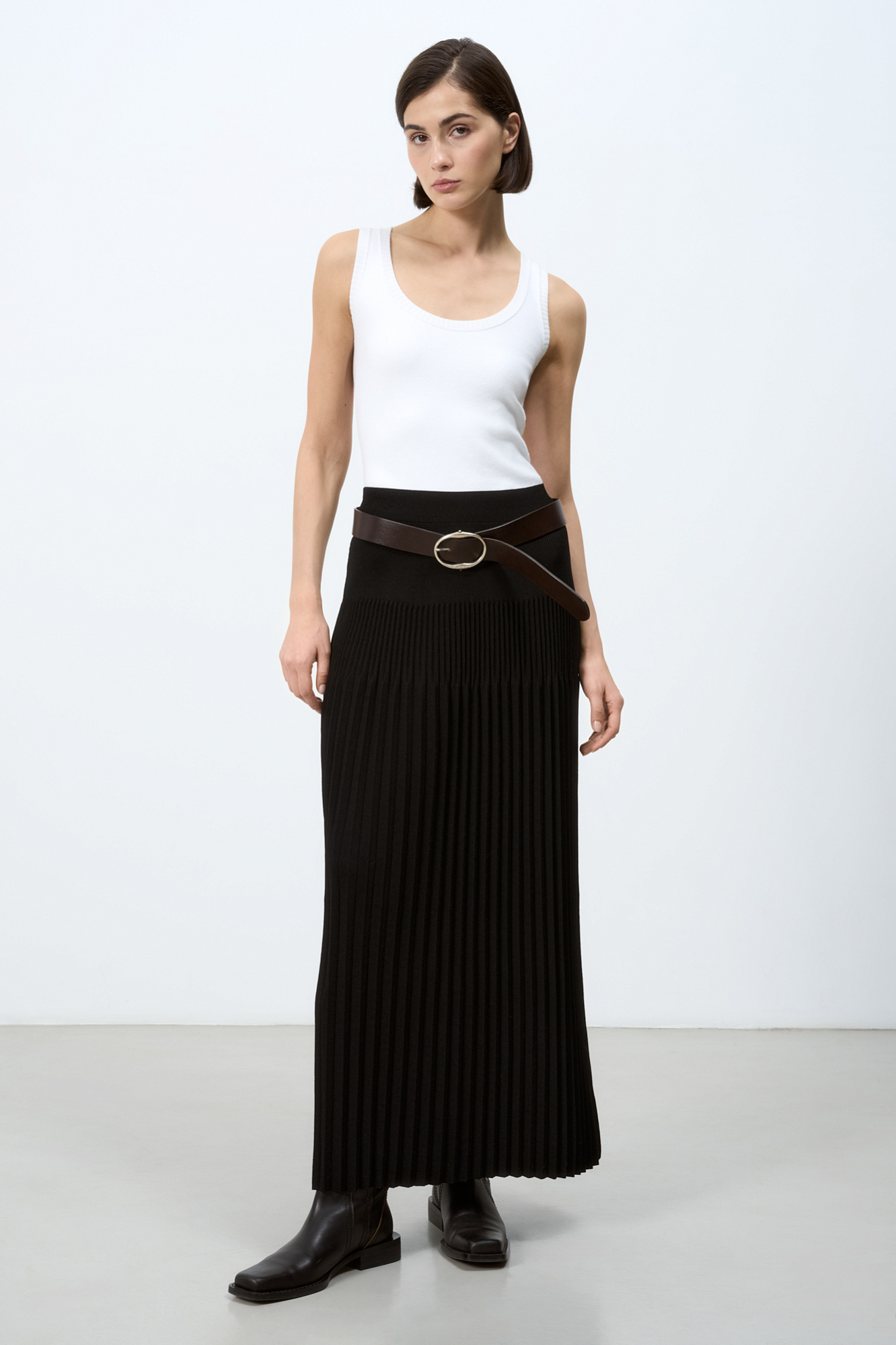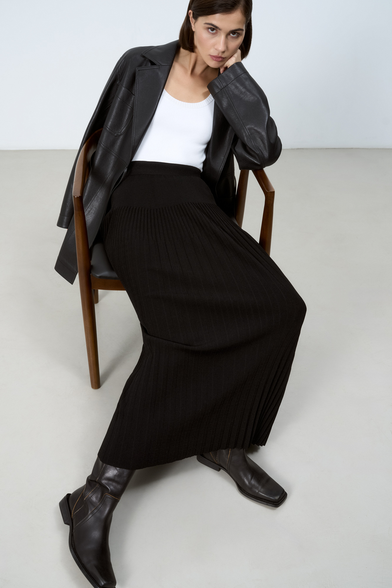 Трикотажная юбка плиссе длины миди из вискозы. Модель приталенного силуэта с эластичным поясом в рубчик.