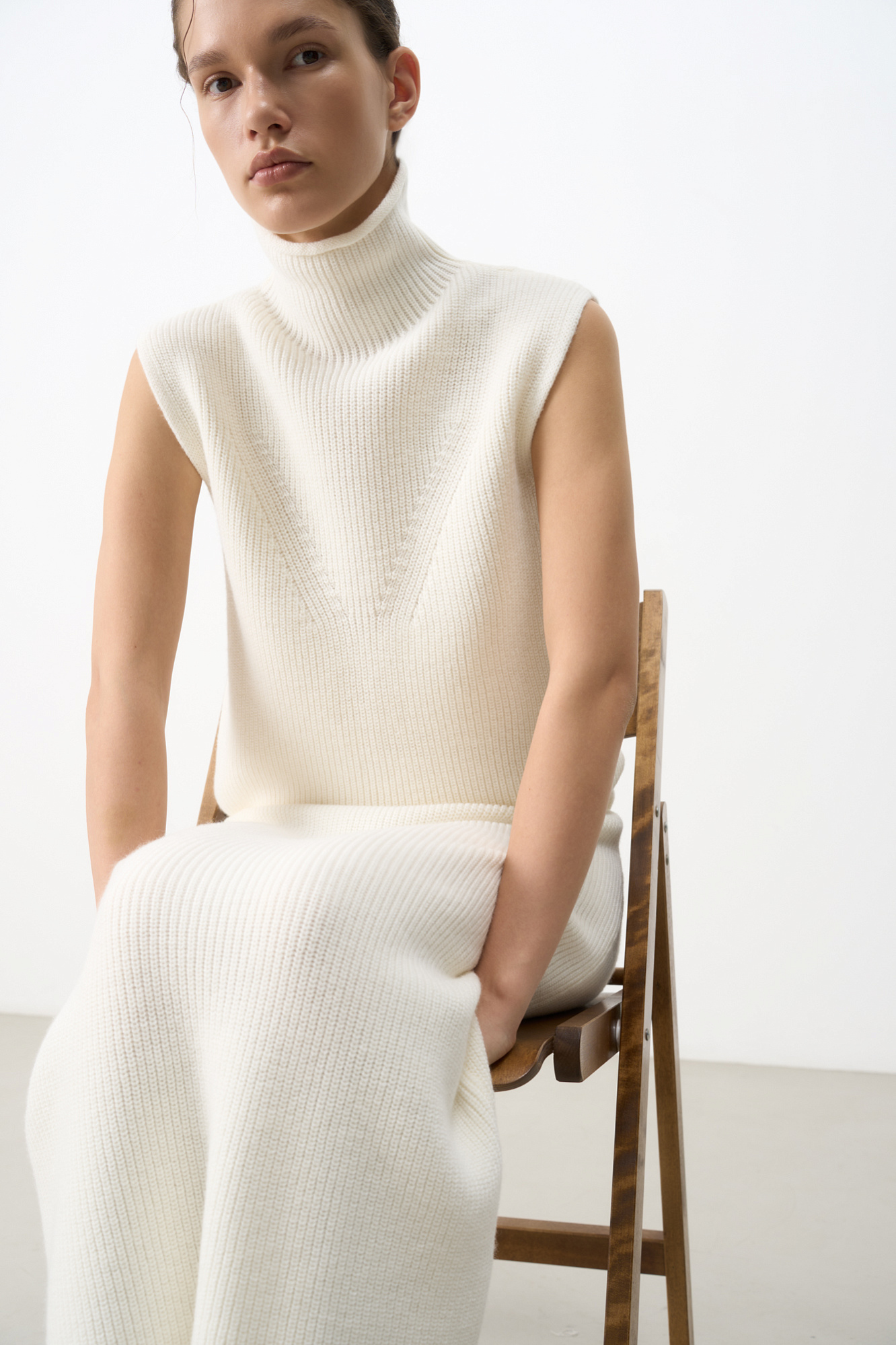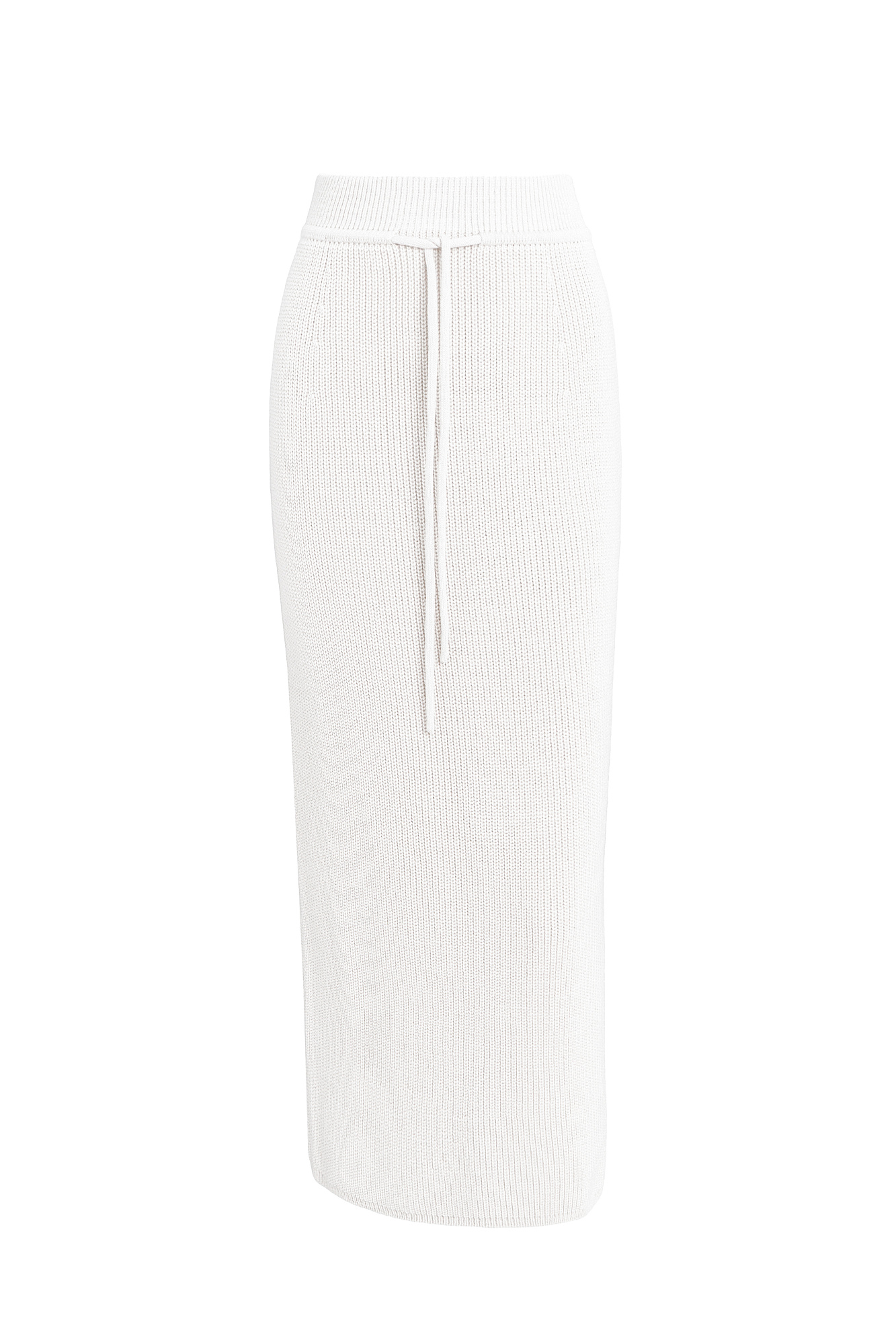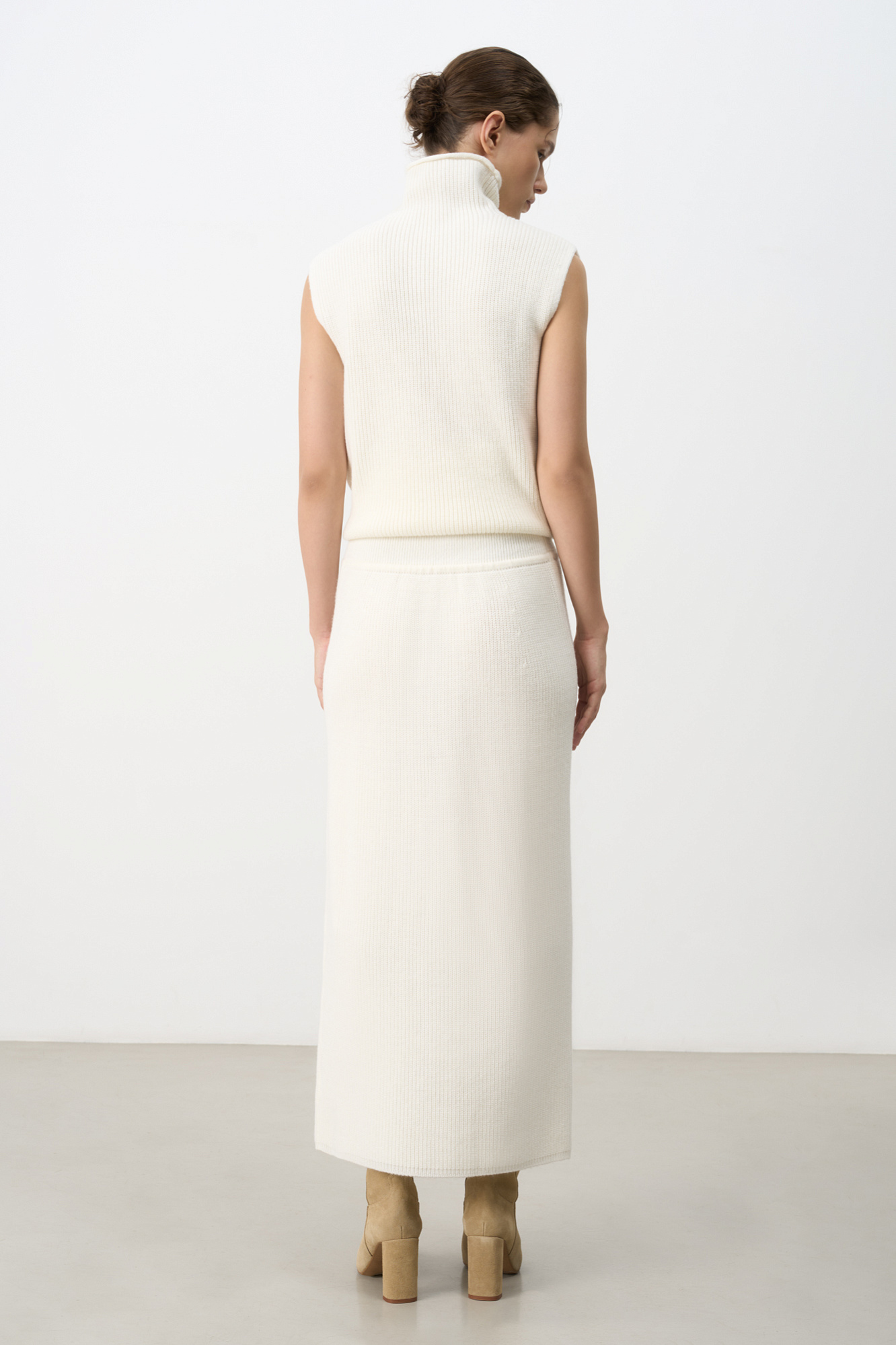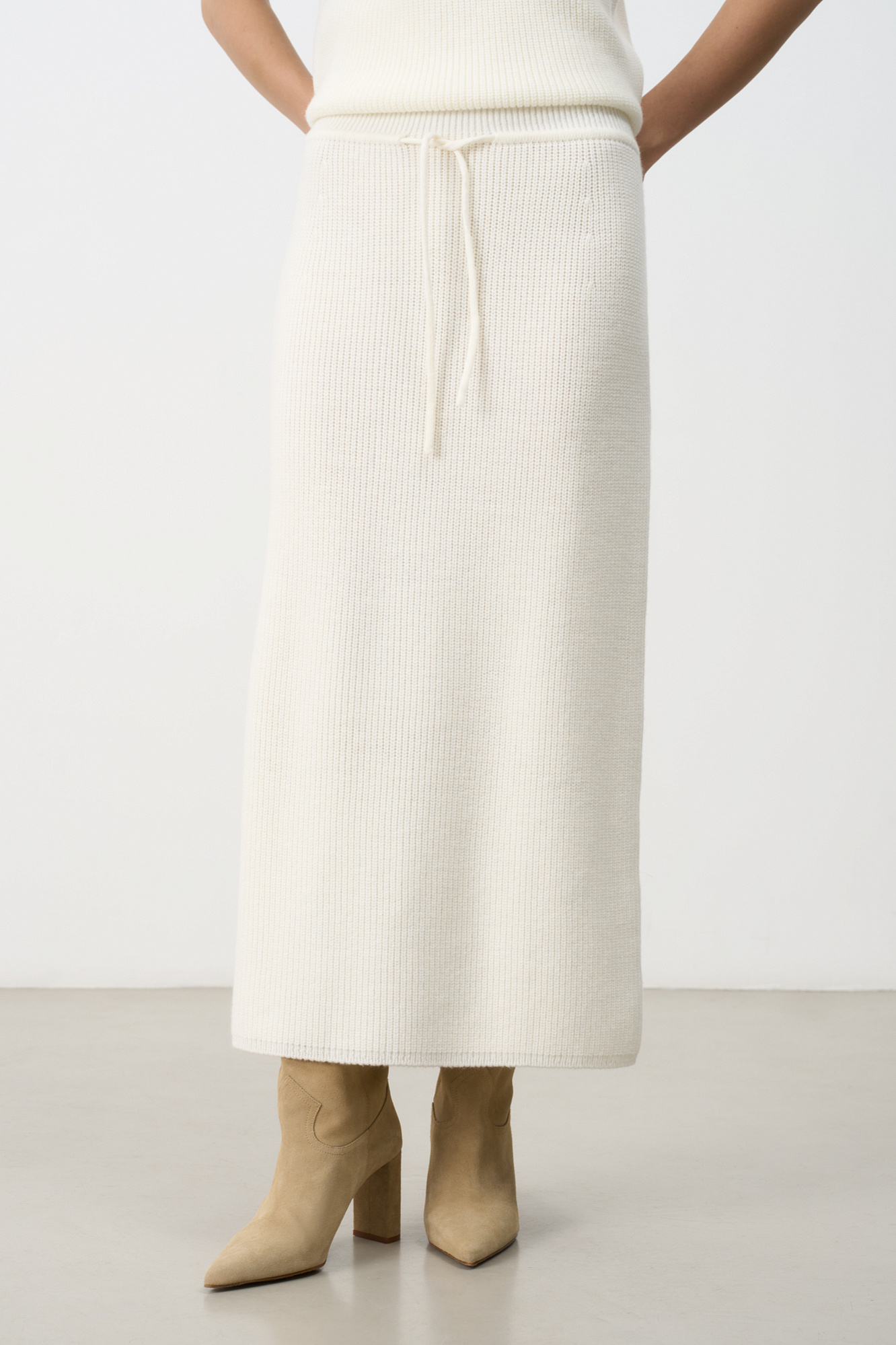 Трикотажная юбка длины миди. Модель прямого силуэта с эластичным поясом на кулиске. Дополнить образ можно жилетом в таком же стиле.