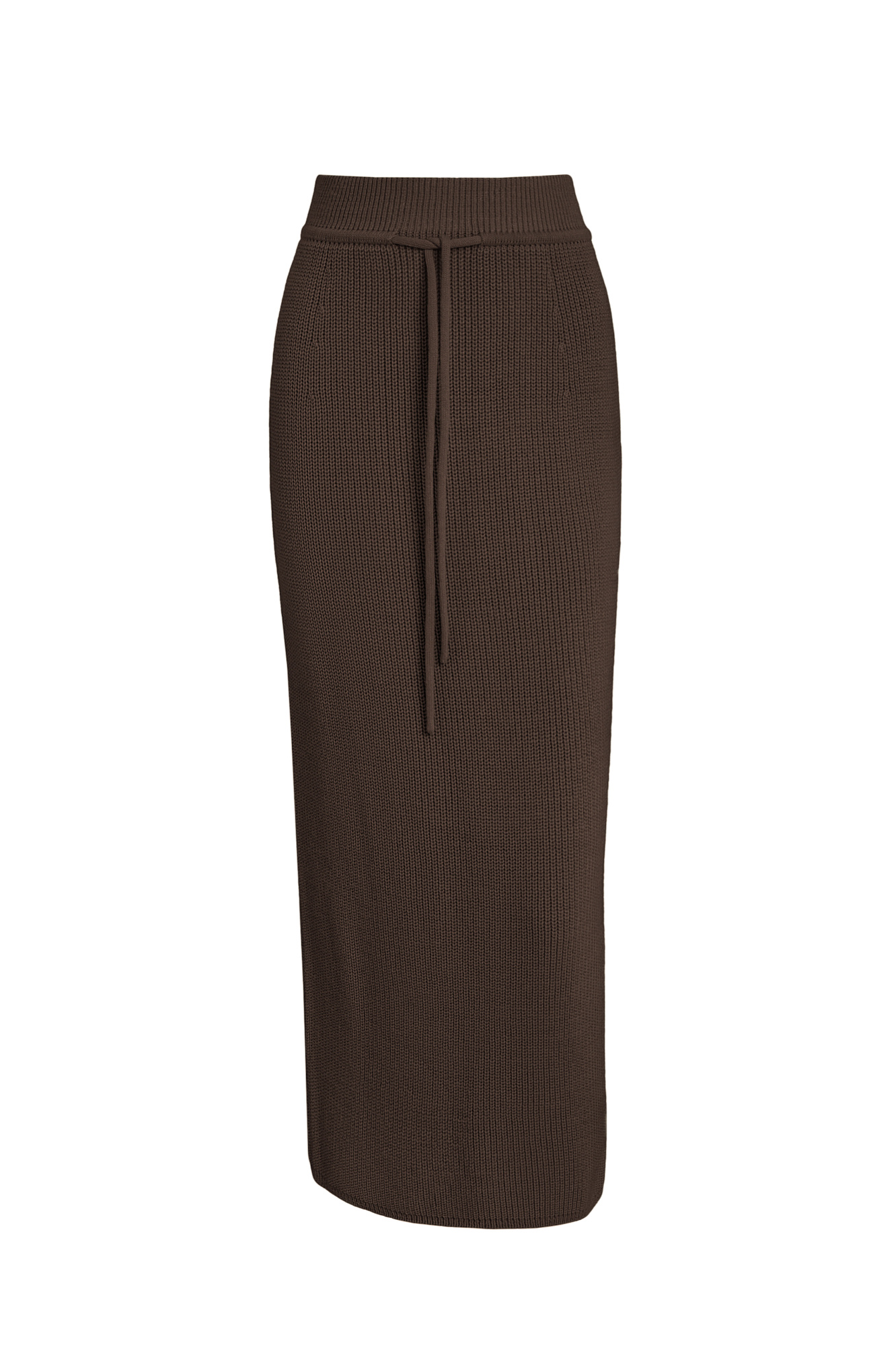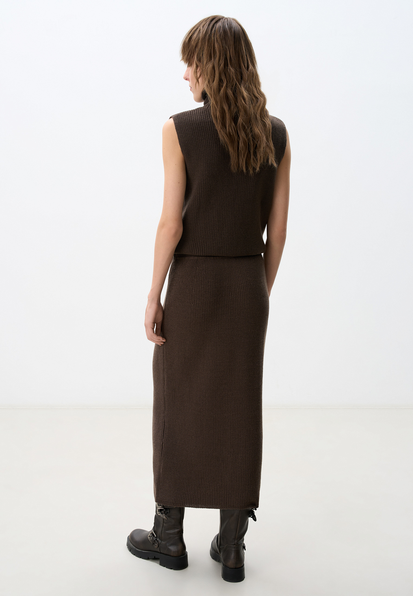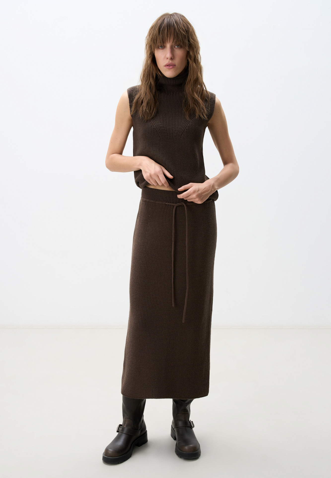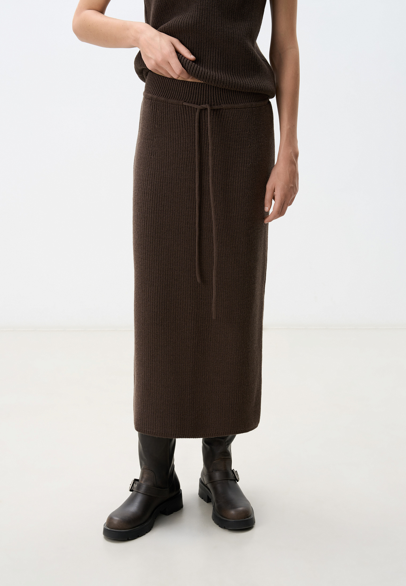 Трикотажная юбка длины миди. Модель прямого силуэта с эластичным поясом на кулиске. Дополнить образ можно жилетом в таком же стиле.