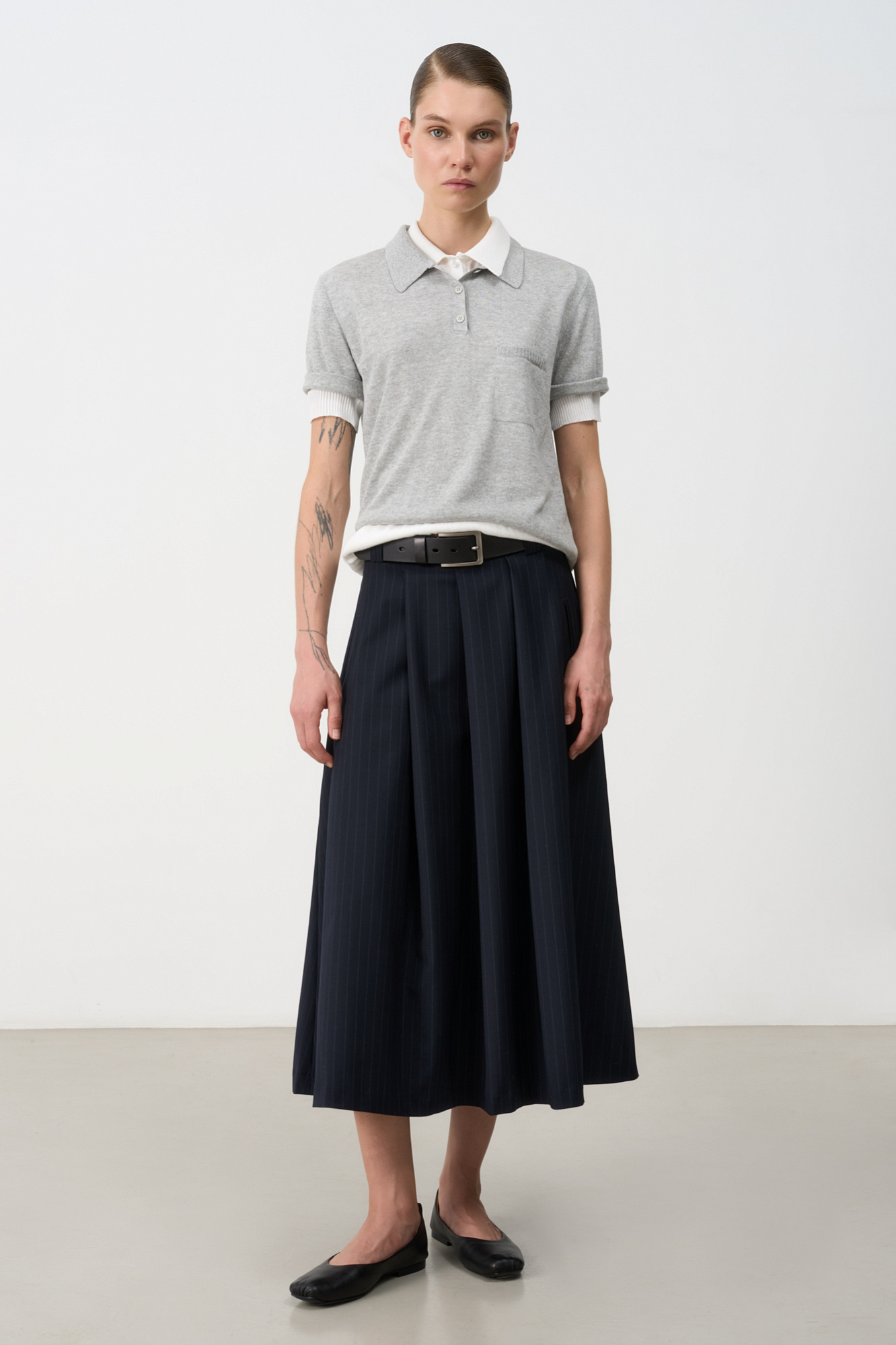 Юбка миди со складками. Модель свободного силуэта с застежкой на молнию и боковыми карманами.