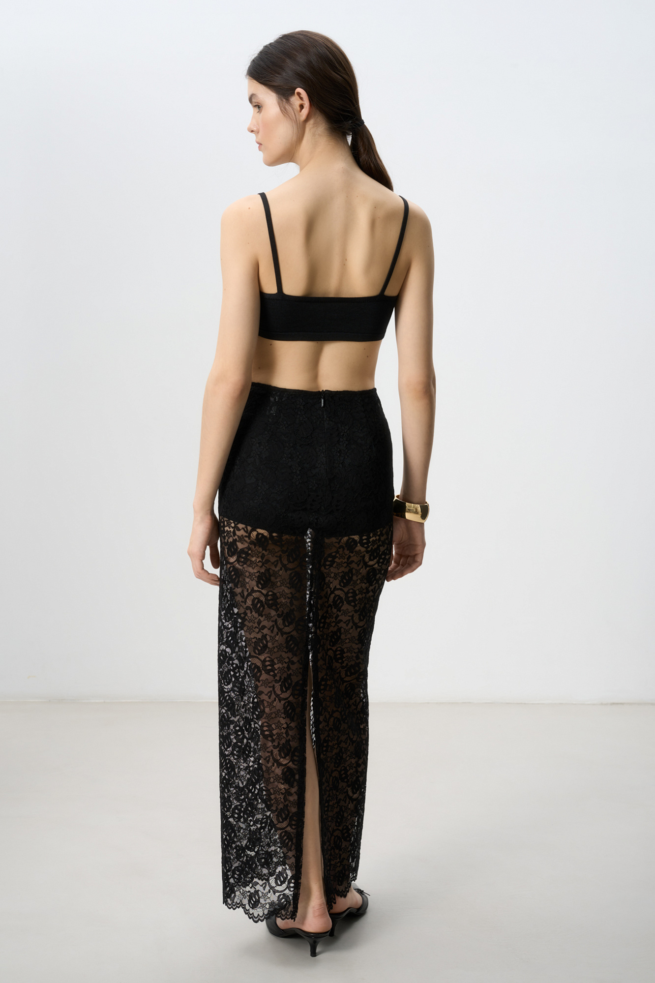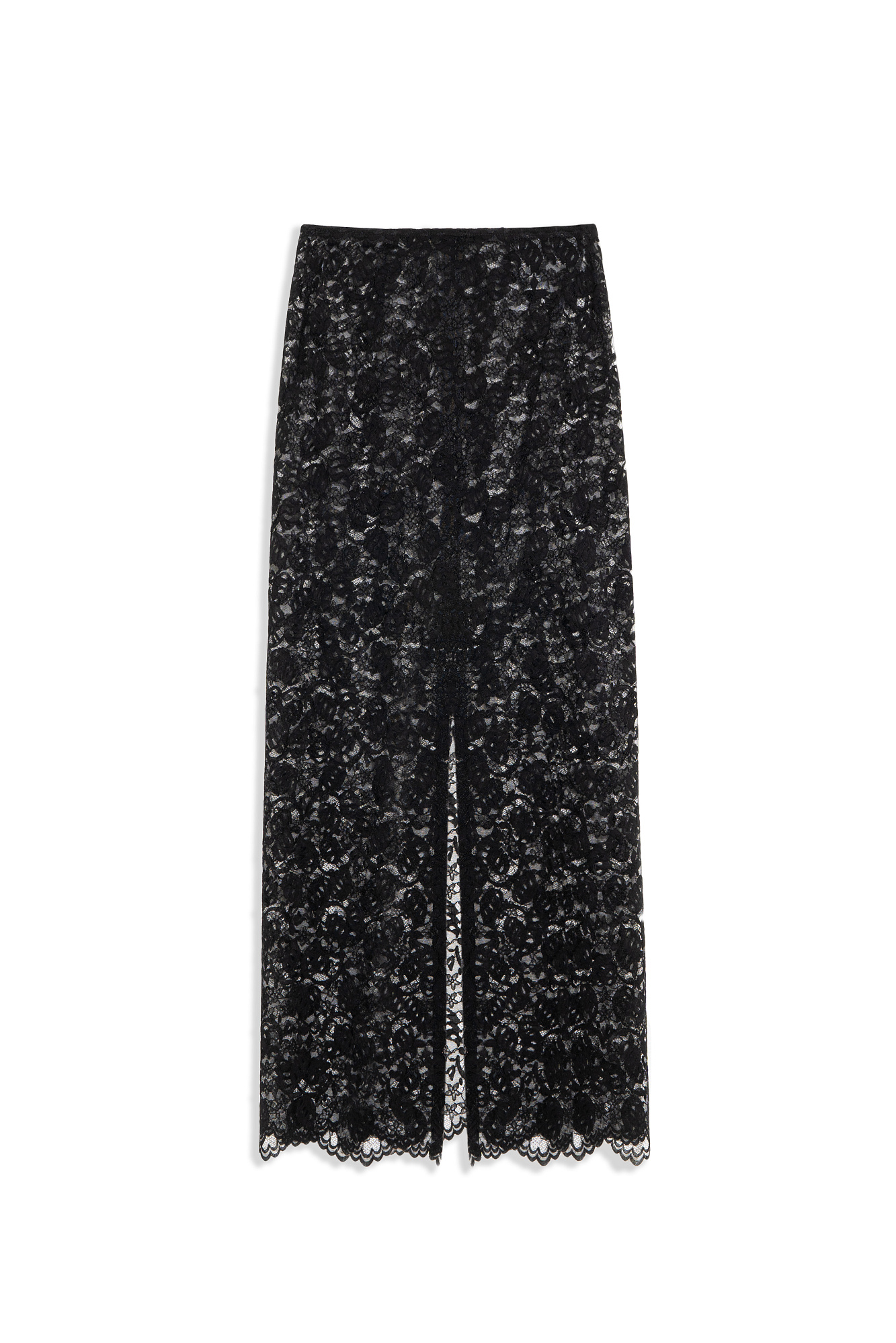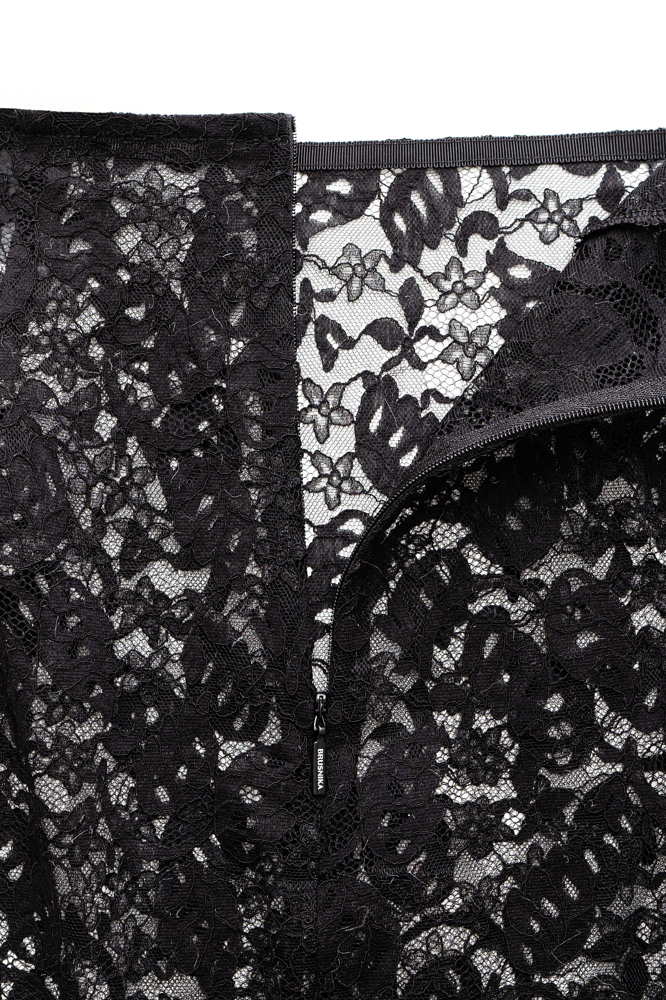 Юбка длины миди, выполненная из хлопкового кружева. Модель прямого силуэта с разрезом сзади и застежкой на молнию. Изделие без подкладки. Дополнить образ можно рубашкой в таком же стиле.