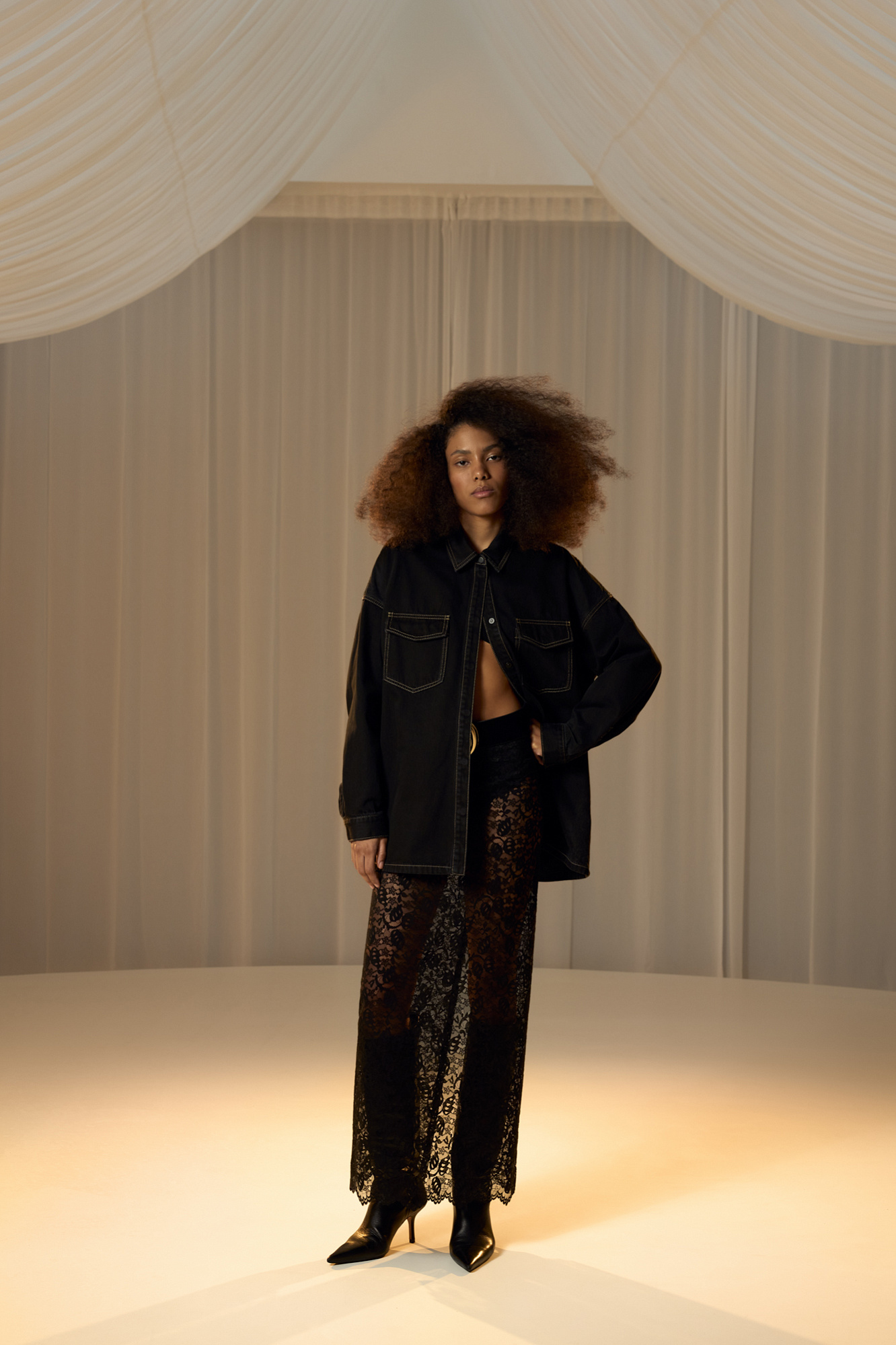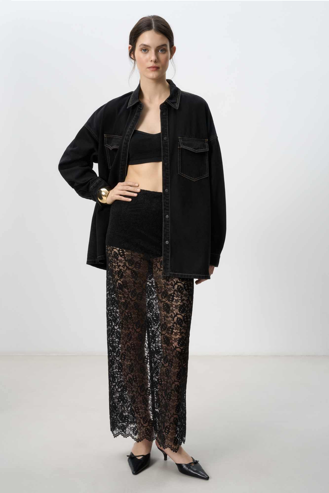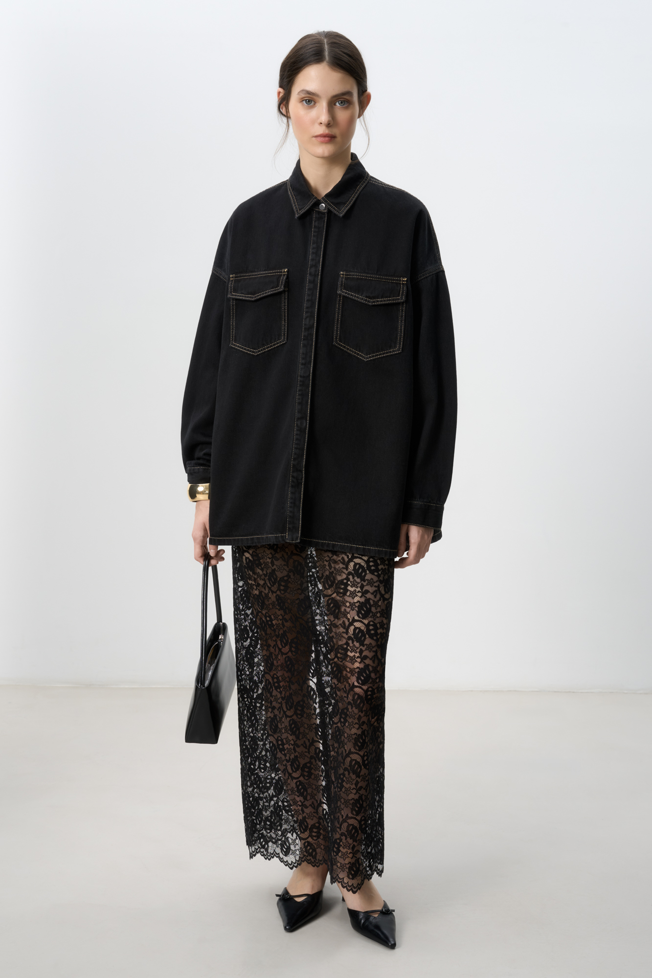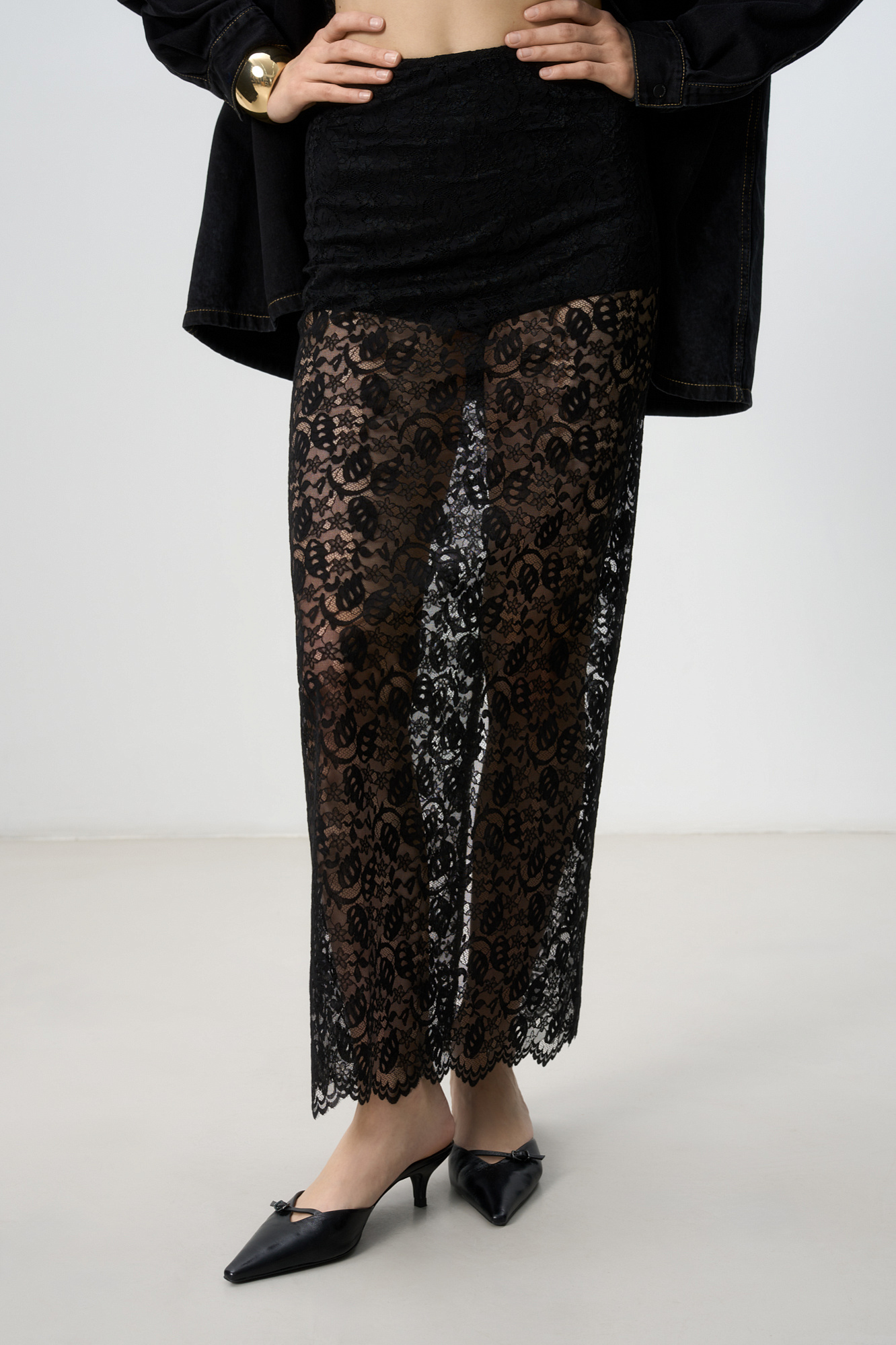 Юбка длины миди, выполненная из хлопкового кружева. Модель прямого силуэта с разрезом сзади и застежкой на молнию. Изделие без подкладки. Дополнить образ можно рубашкой в таком же стиле.