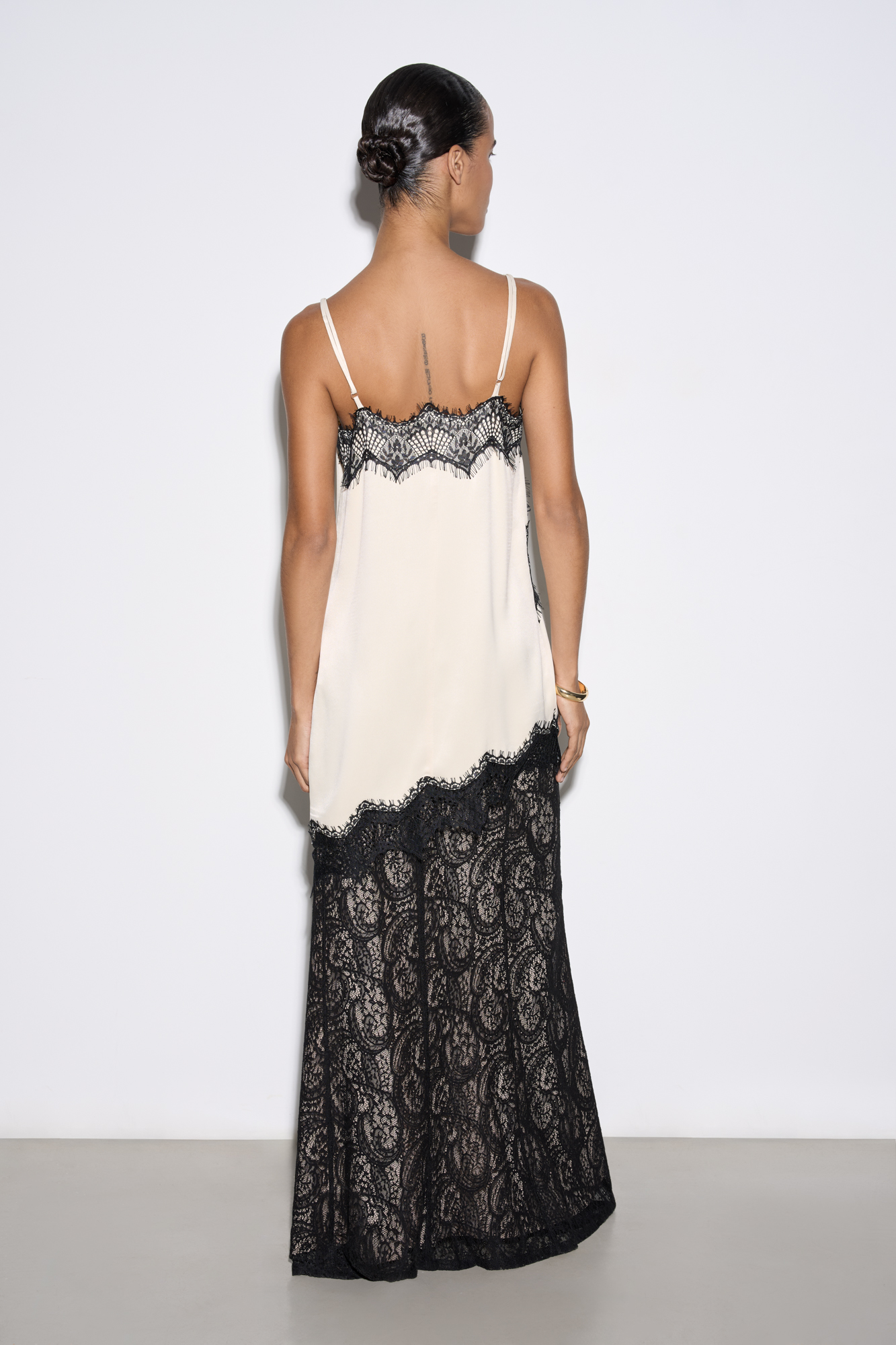 Юбка длины миди, выполненная из кружева на подкладке контрастного цвета. Модель прямого силуэта, с разрезом сзади и застежкой на молнию.