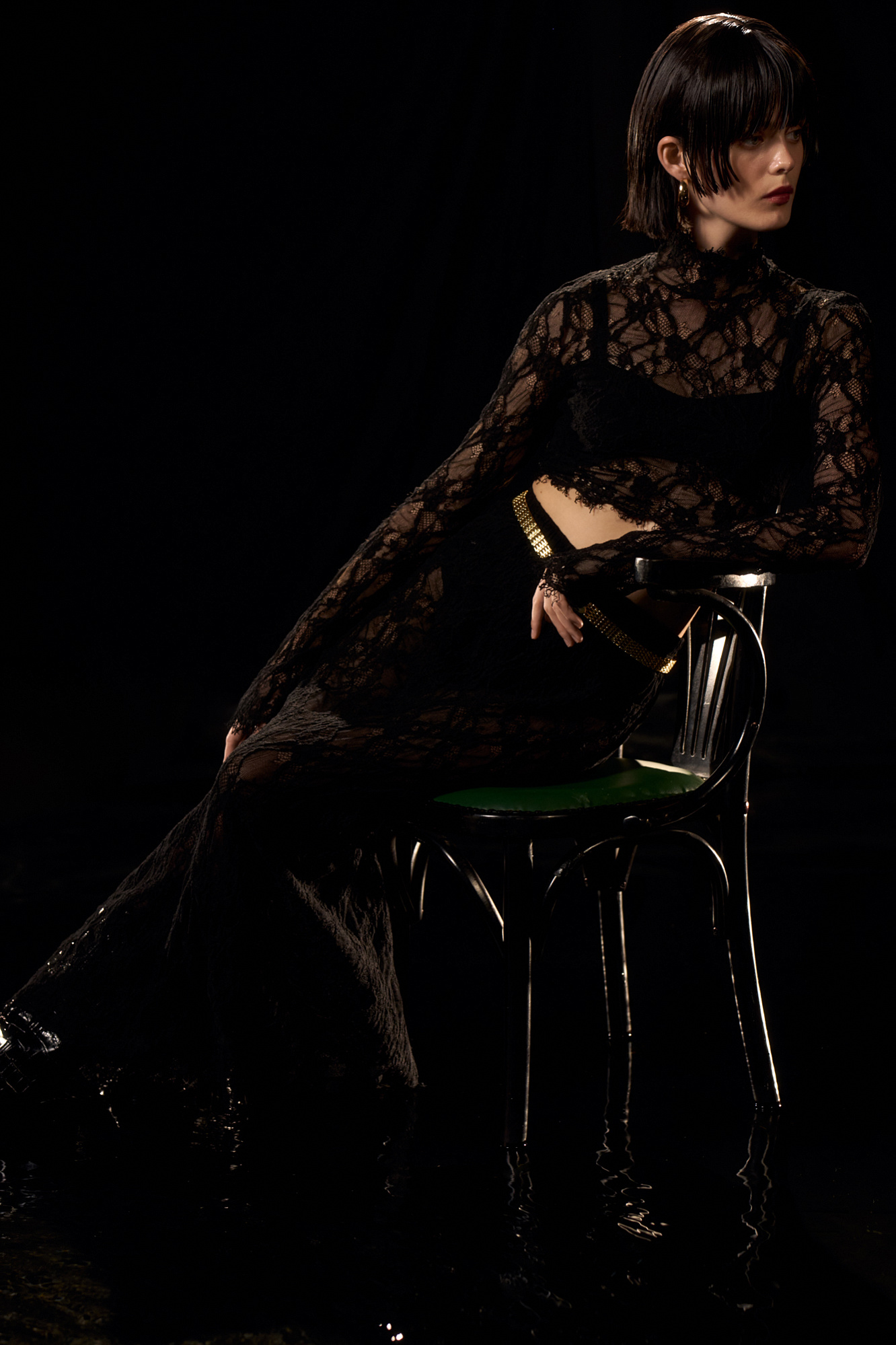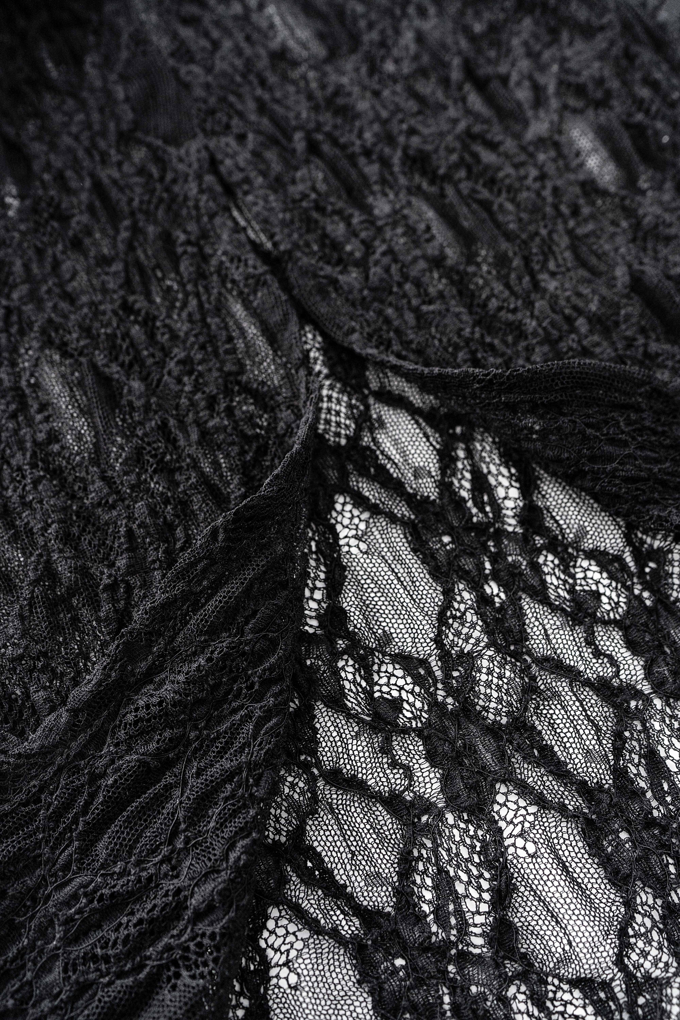 Юбка длины миди, выполненная из тонкого кружева. Модель прямого силуэта с разрезом сзади и застежкой на молнию. Изделие без подкладки. Дополнить образ можно лонгсливом в таком же стиле.