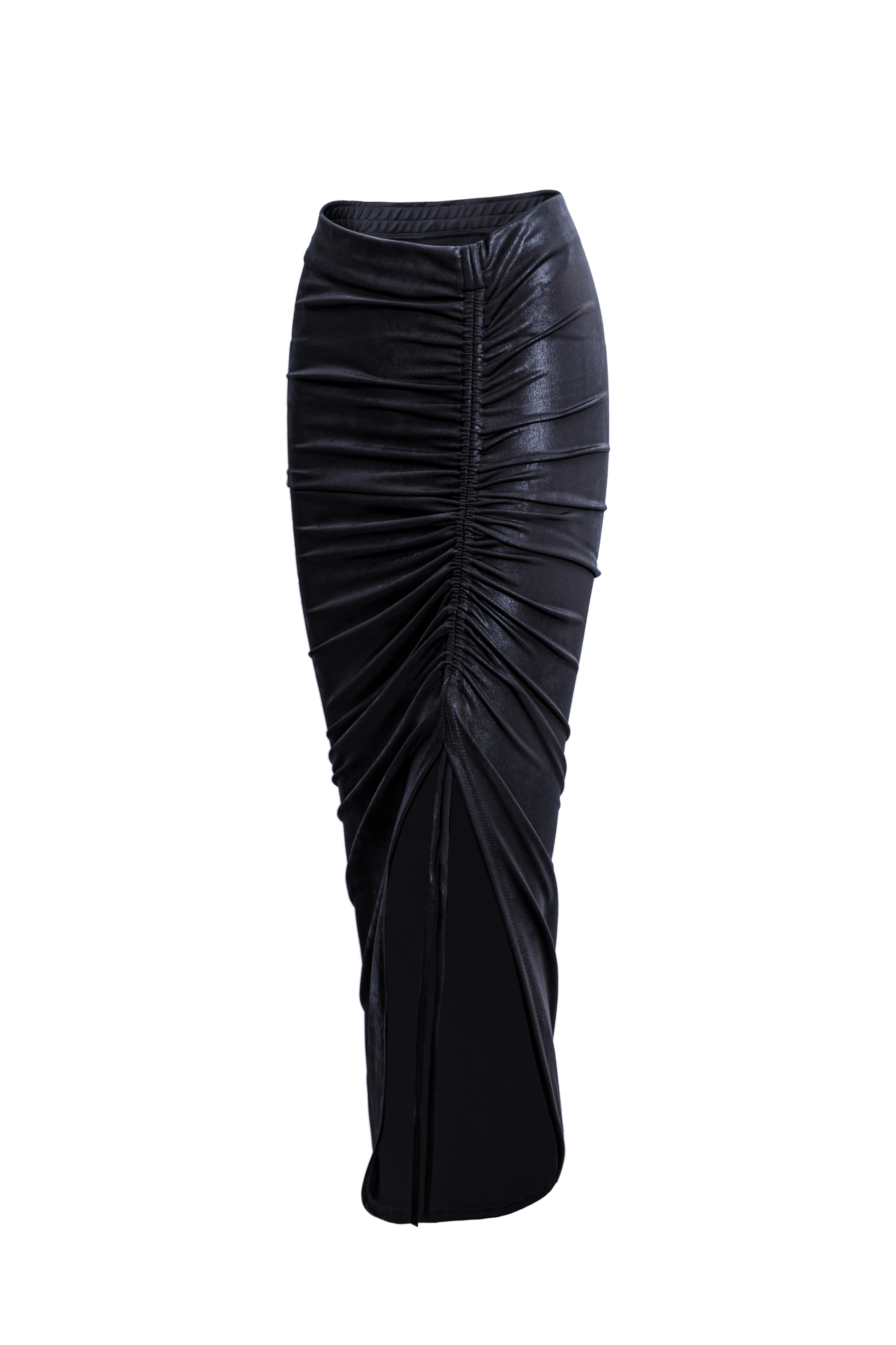 Юбка из нейлона длины миди на кулиске. Модель с асимметричным низом и сложной драпировкой. Дополнить образ можно топом в таком же стиле.
