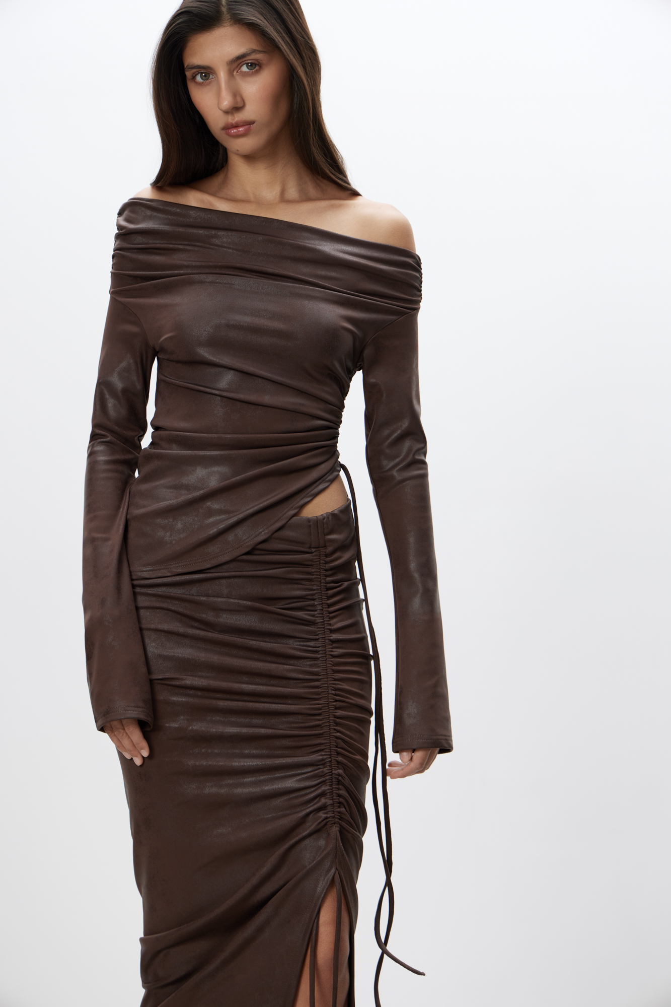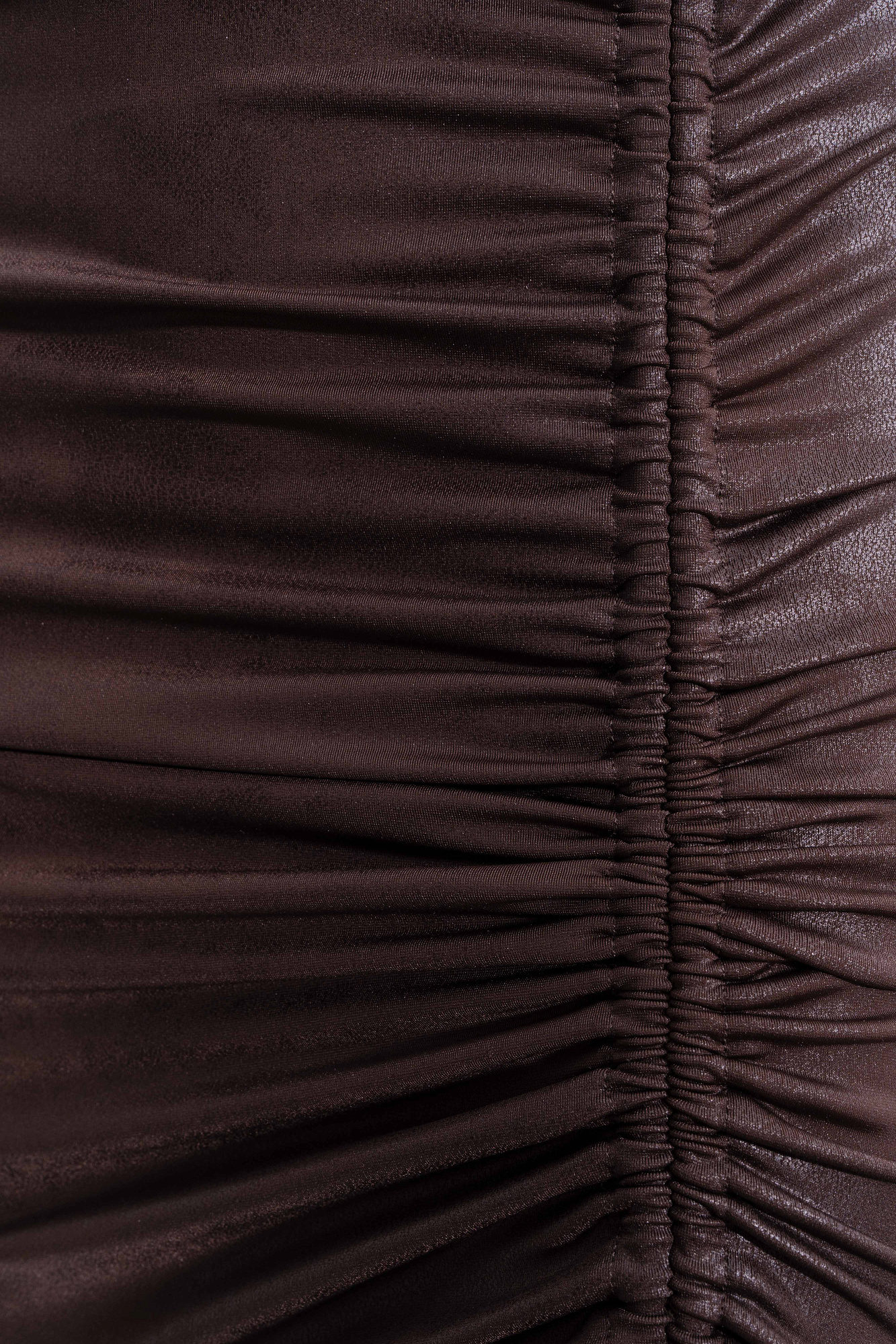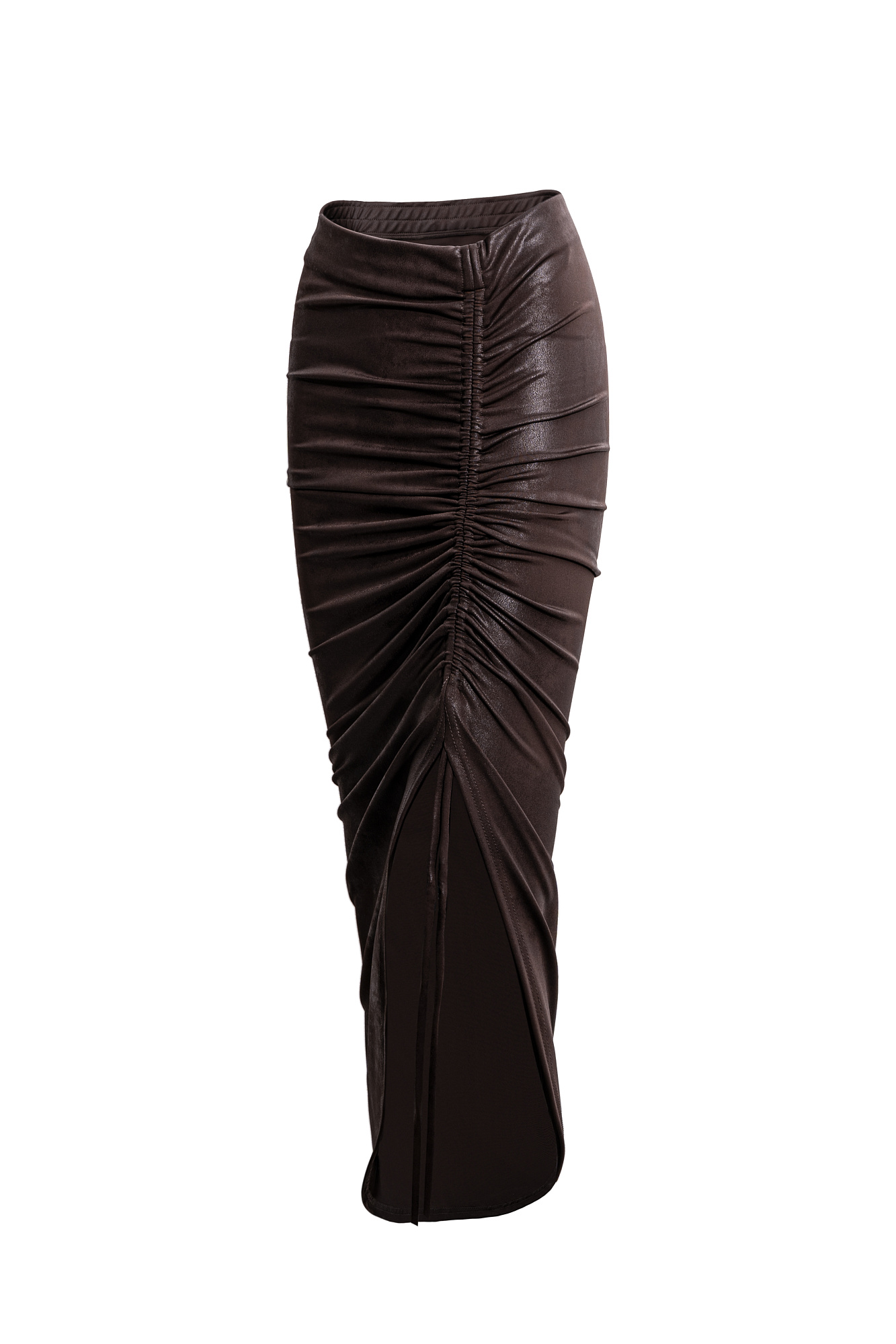 Юбка из нейлона длины миди на кулиске. Модель с асимметричным низом и сложной драпировкой. Дополнить образ можно топом в таком же стиле.