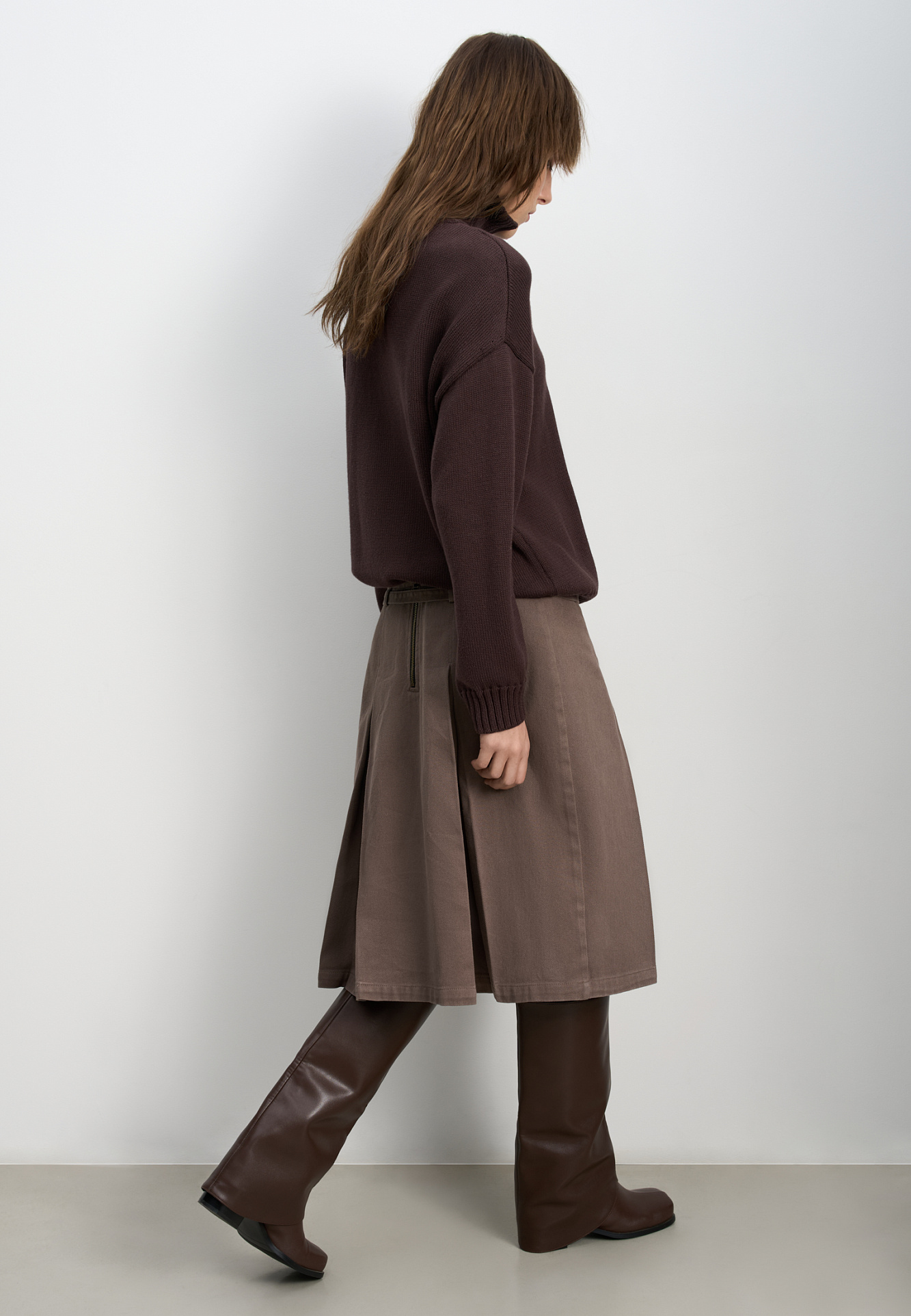 Джинсовая юбка из 100% хлопка длины миди. Модель прямого кроя, с крупными встречными складками, двойным поясом со шлевками для ремня, тонким ремешком и застежкой на молнию сбоку.