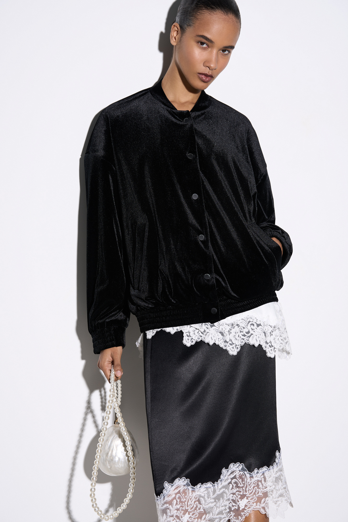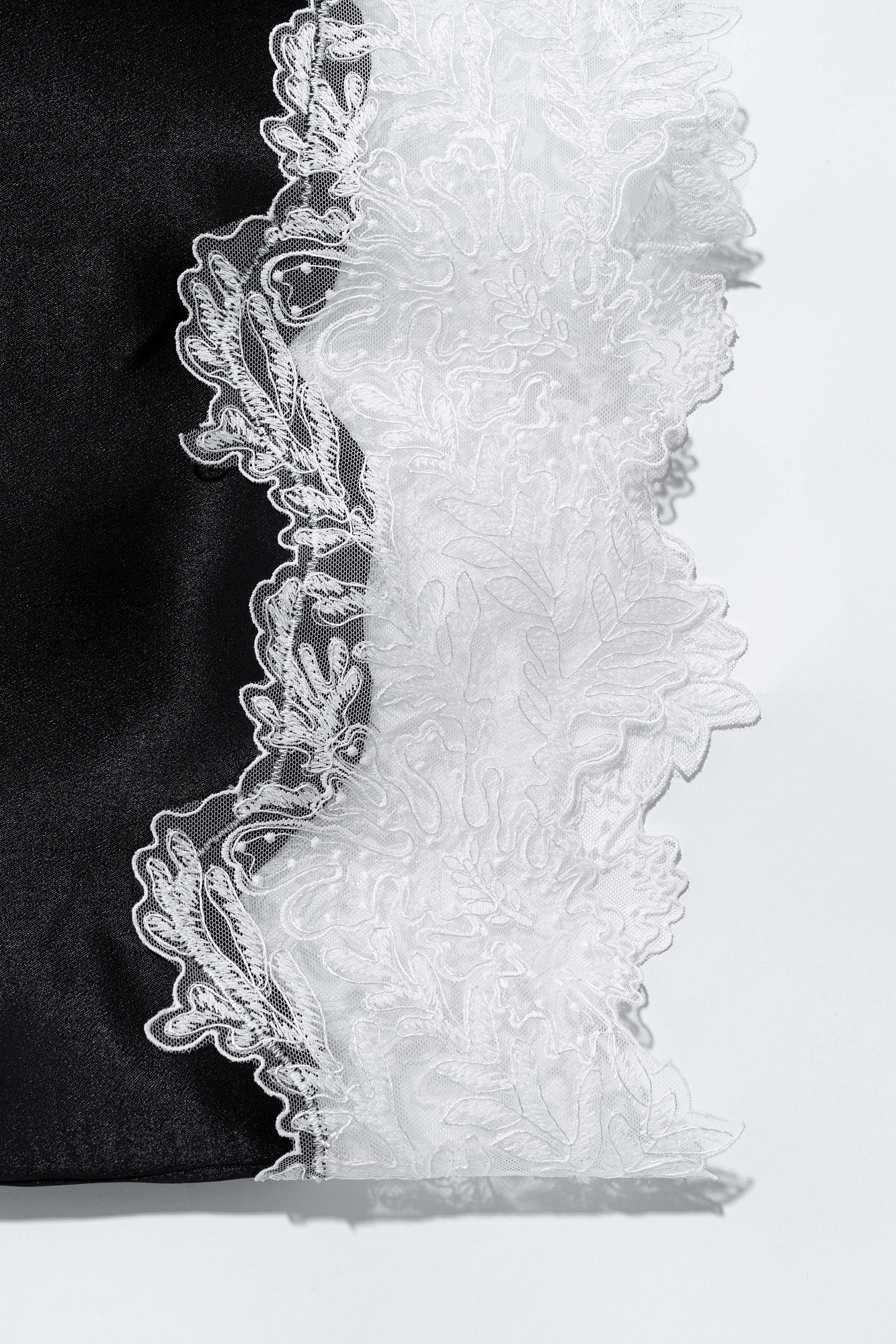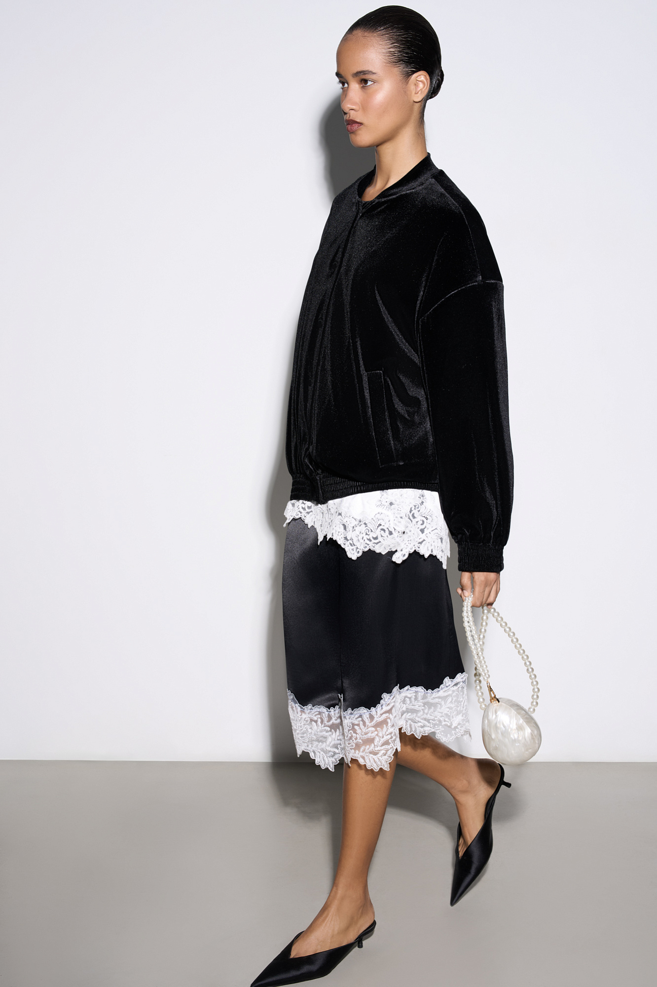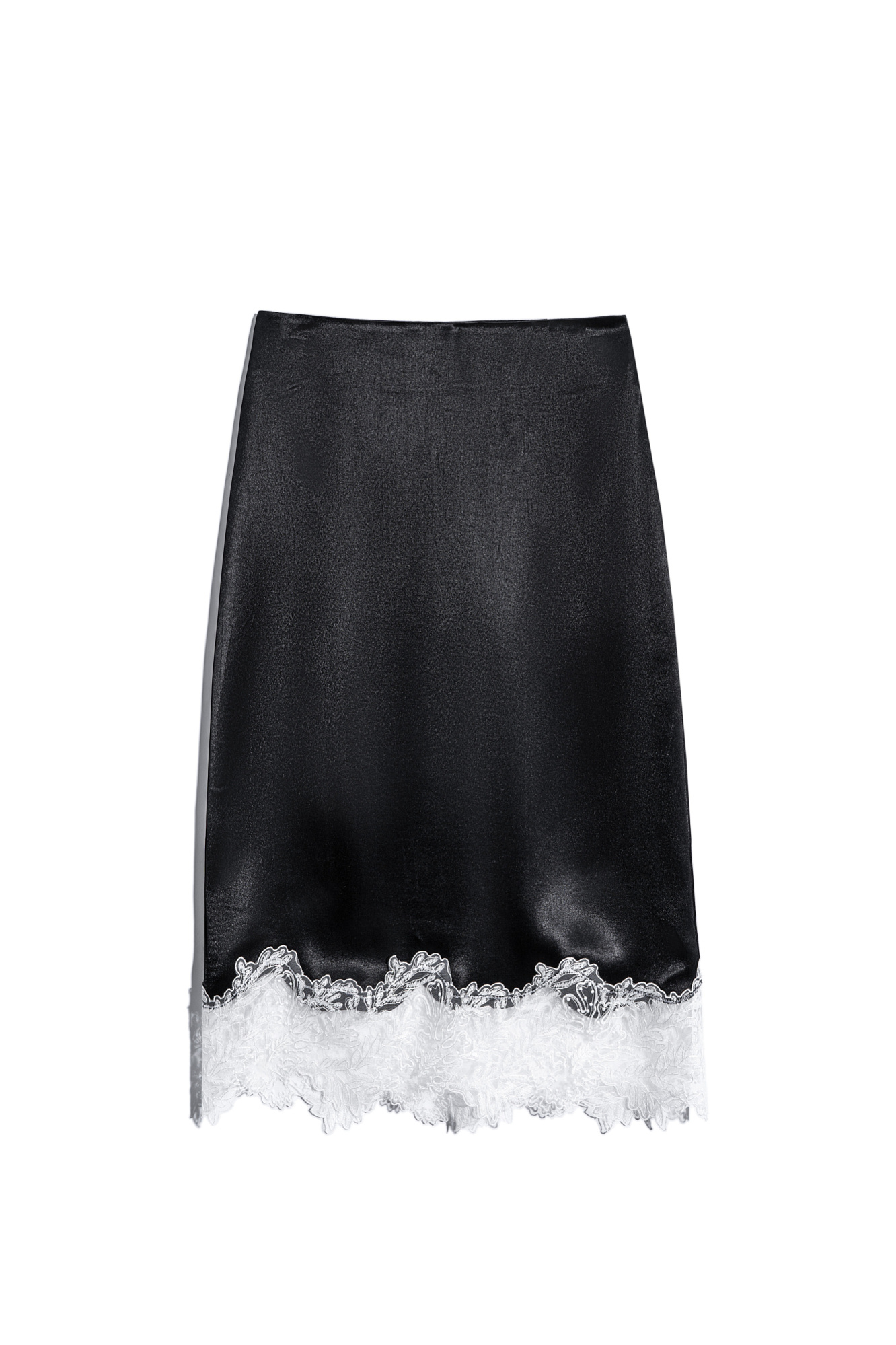 Юбка длины миди из атласной вискозы. Подол изделия декорирован тонким кружевом контрастного цвета. Застежка на потайную молнию.