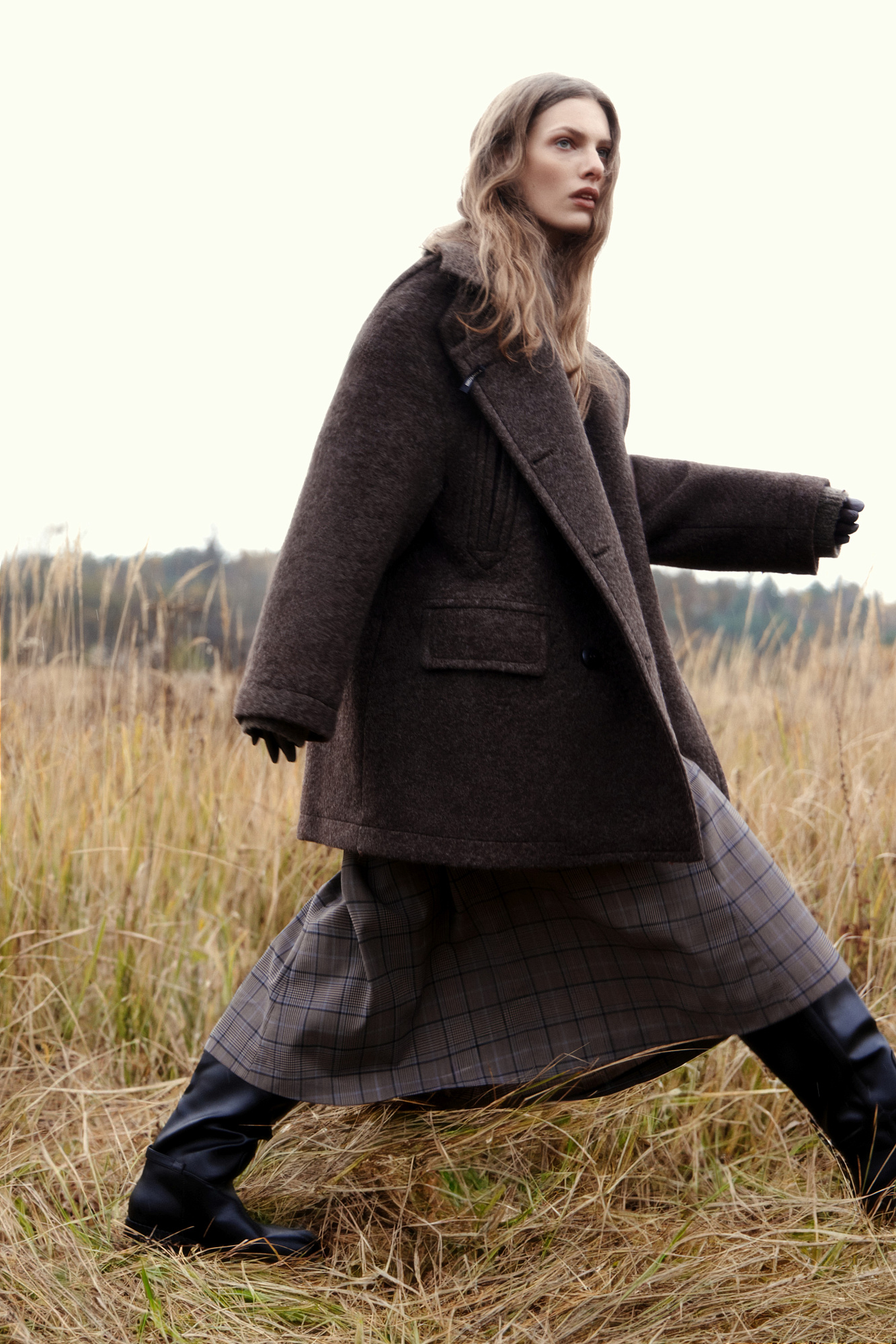 Юбка длины миди из шерсти в клетку. Модель А-силуэта с крупными косыми складками спереди. Застежка на молнию сзади. Изделие без подкладки.