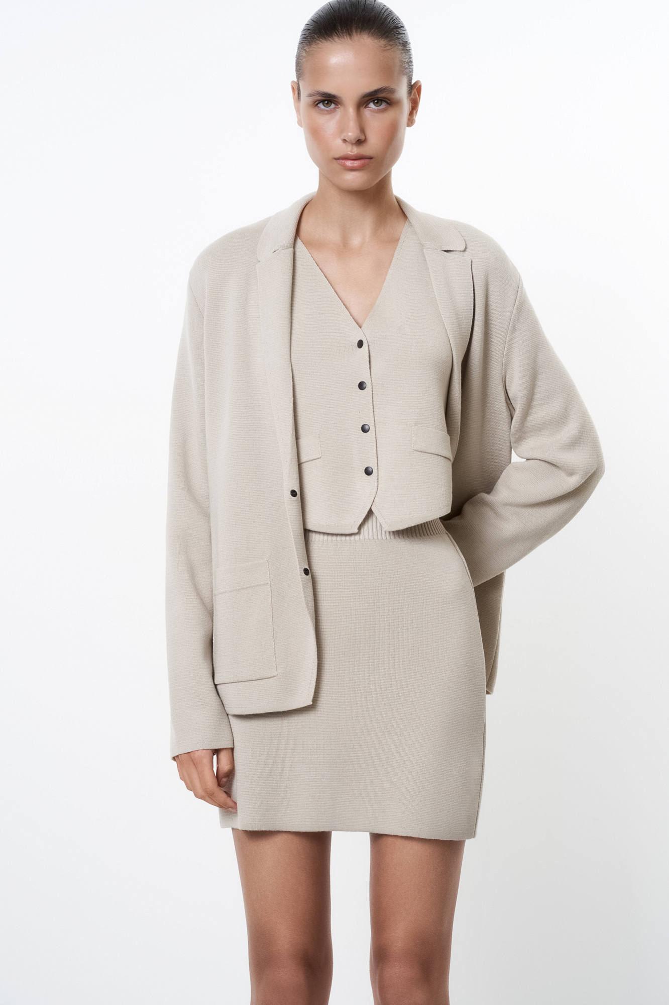 Трикотажная юбка длины мини из шерсти мериноса. Модель с боковой планкой на кнопках, небольшим вырезом сбоку, накладными карманами сзади и широким эластичным поясом на резинке. Дополнить образ можно жилетом, жакетом или бомбером.