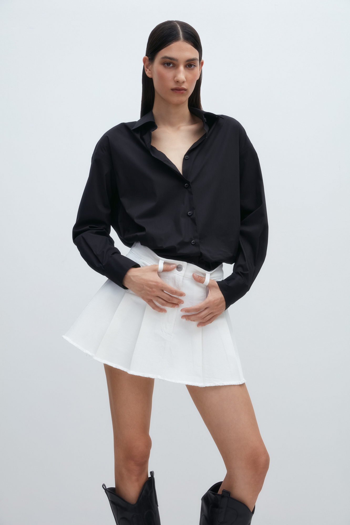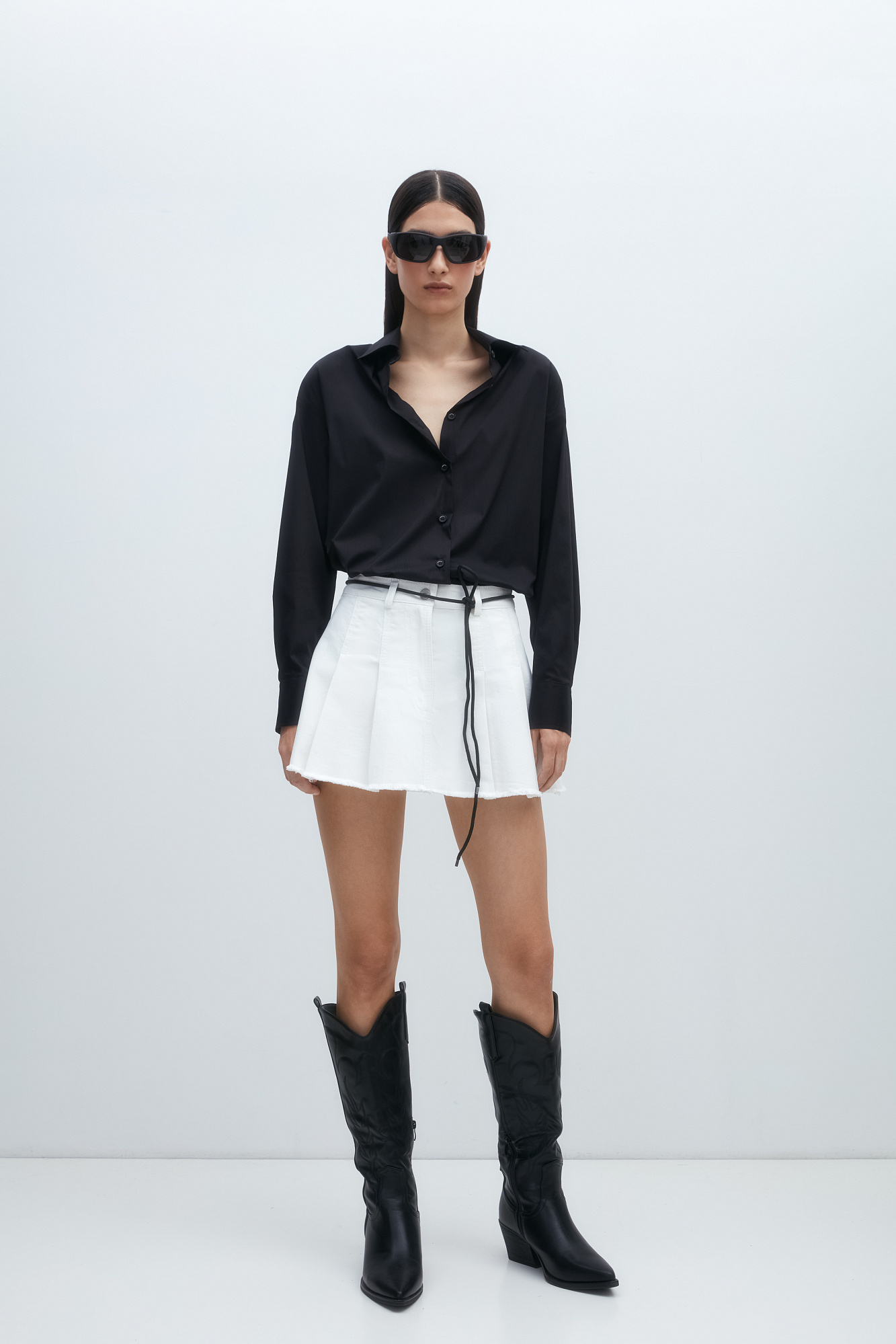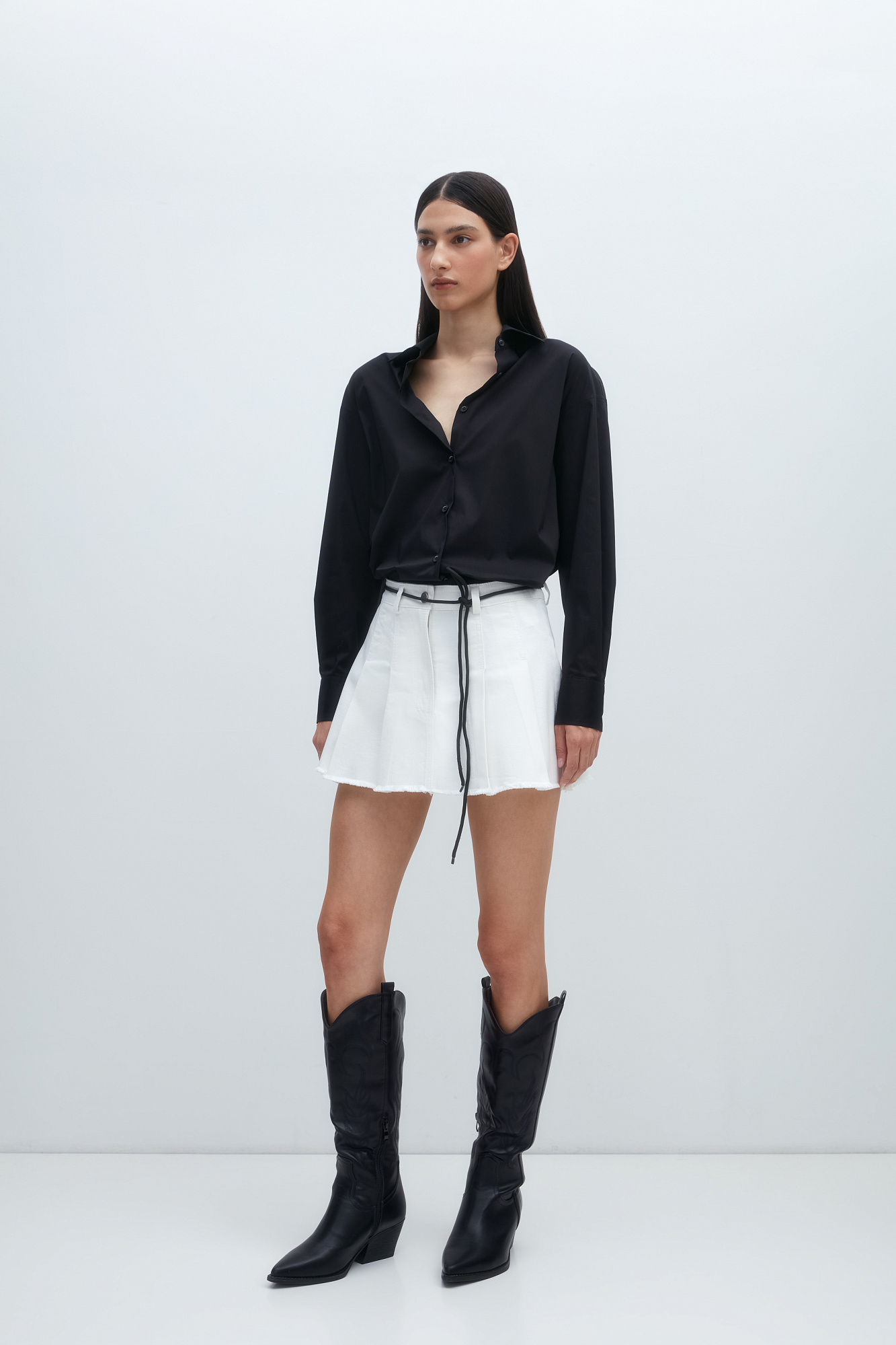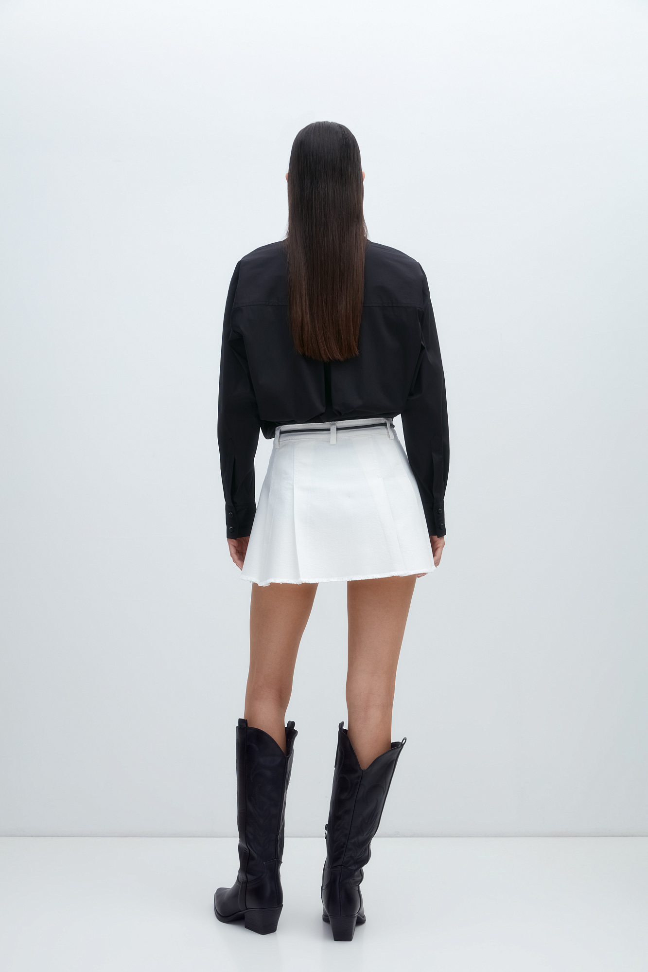 Джинсовая юбка длины мини в складку из хлопка. Потайная застежка на молнию и пуговицу. Шлевки на поясе для ремня.