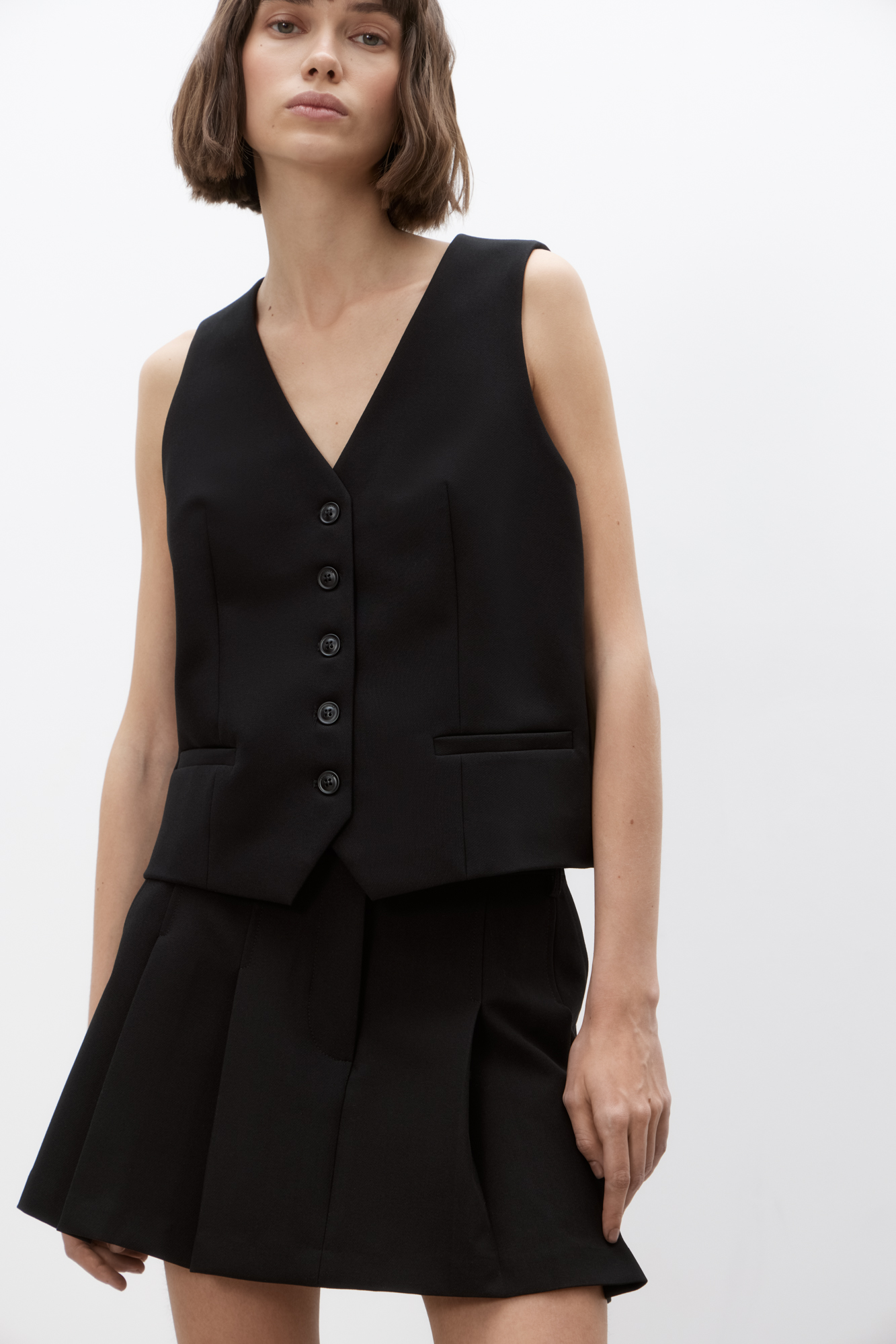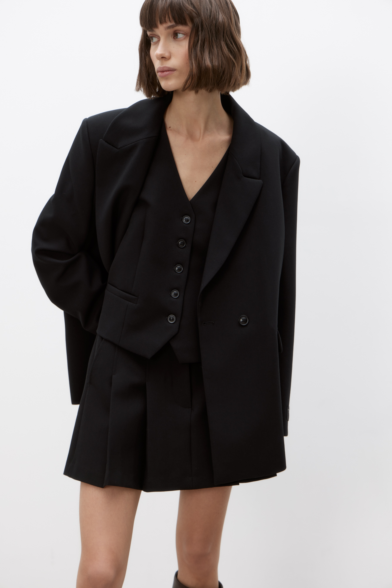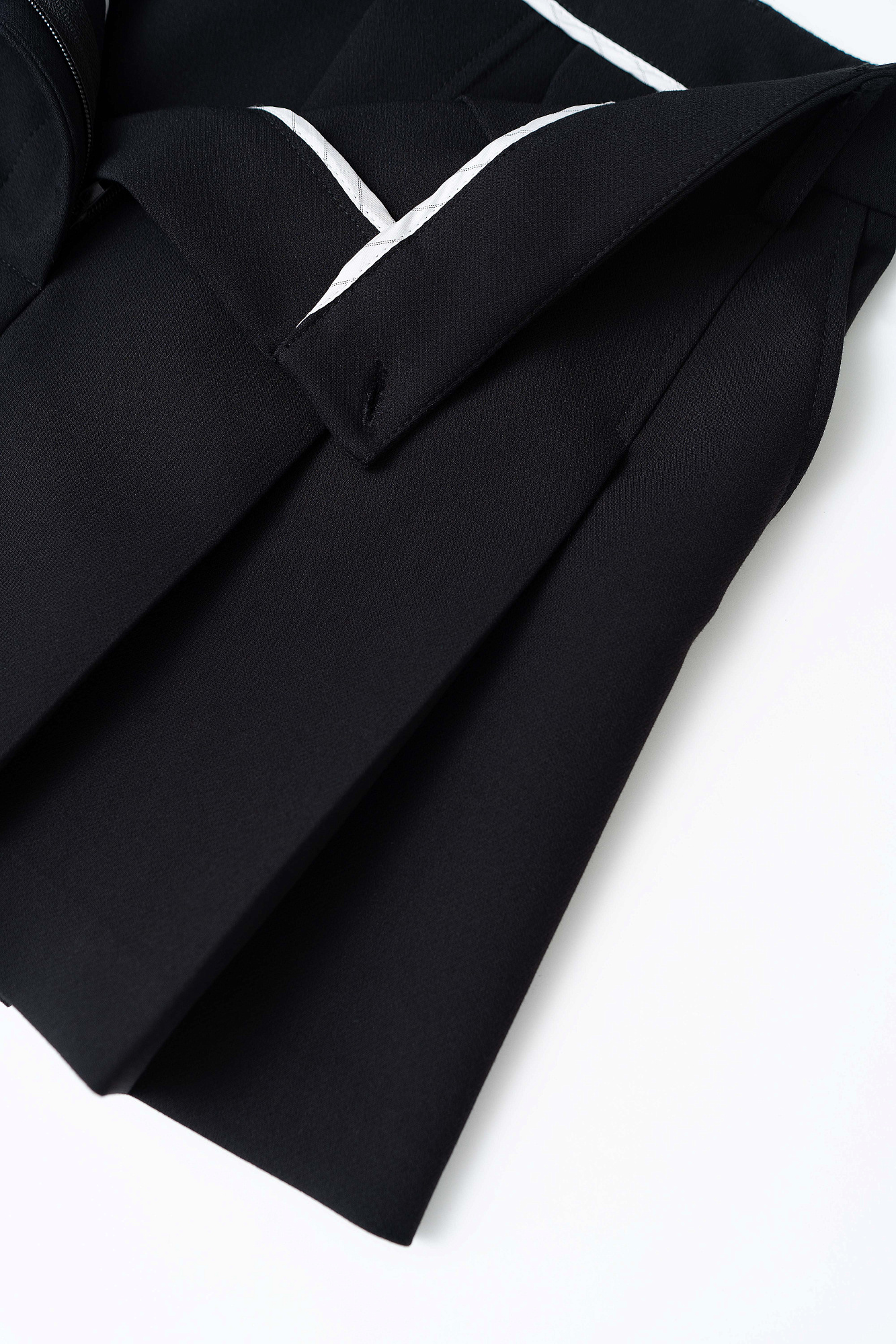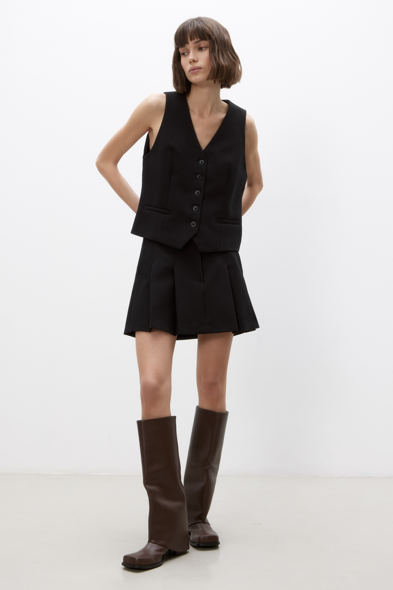 Юбка длины мини из поливискозы. Модель с крупными складками, боковыми карманами и шлевками на поясе для ремня. Застежка на молнию, крючок и внутреннюю пуговицу.