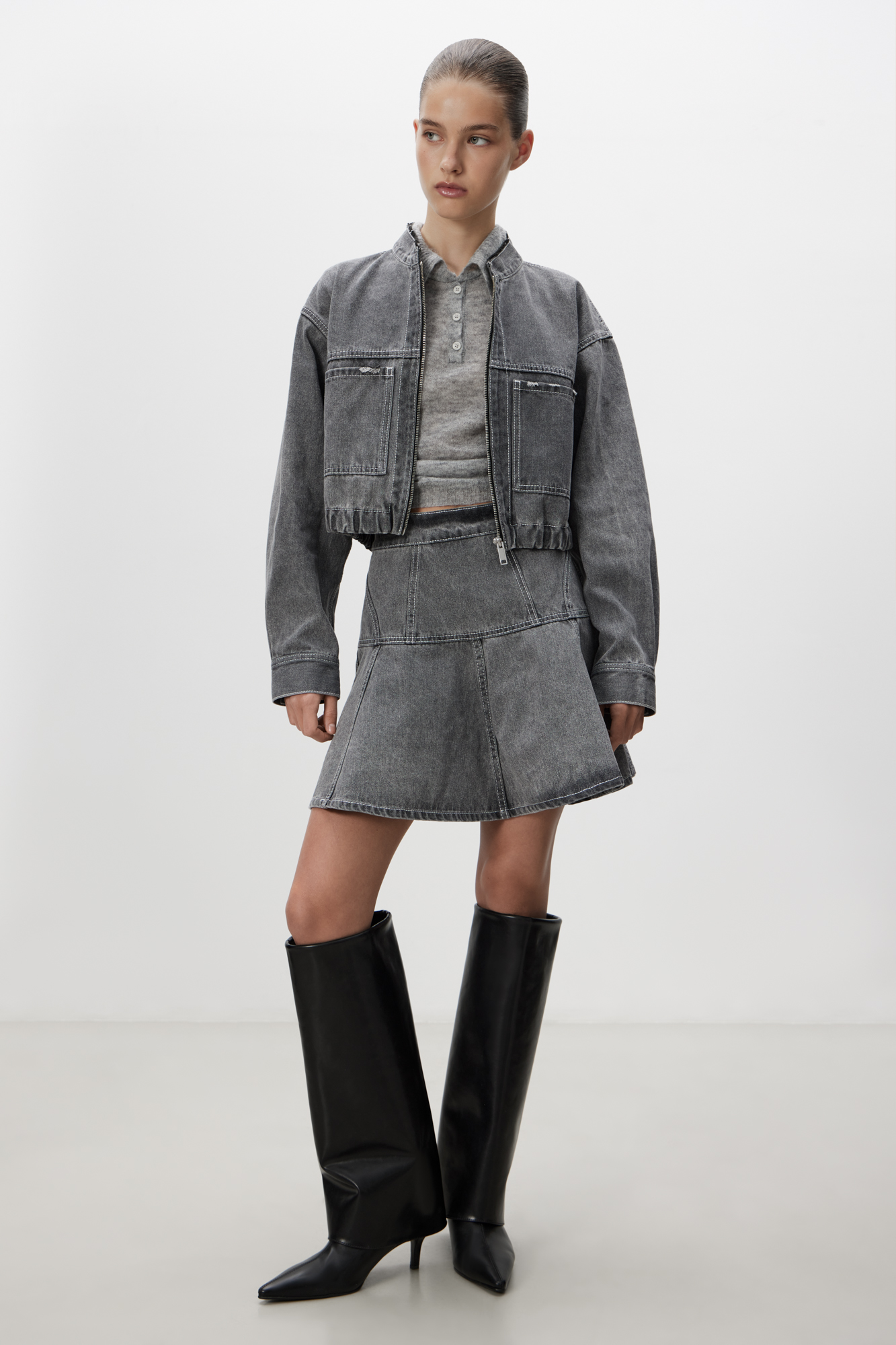 Джинсовая юбка длины мини с брендированным ярлыком на поясе и застежкой на молнию сзади. Дополнить образ можно бомбером.