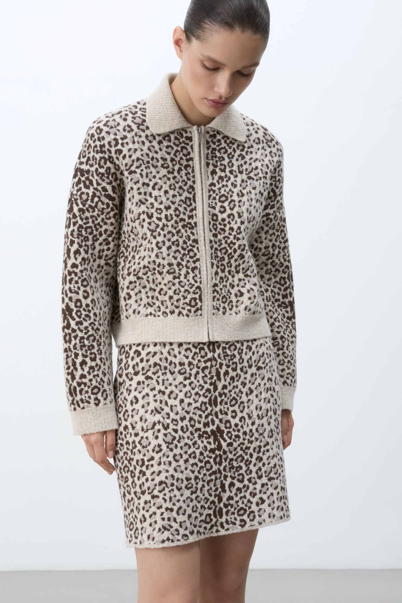 Юбка длины мини с жаккардовым анималистическим дизайном. Пояс на резинке. Дополнить образ можно жакетом в таком же стиле