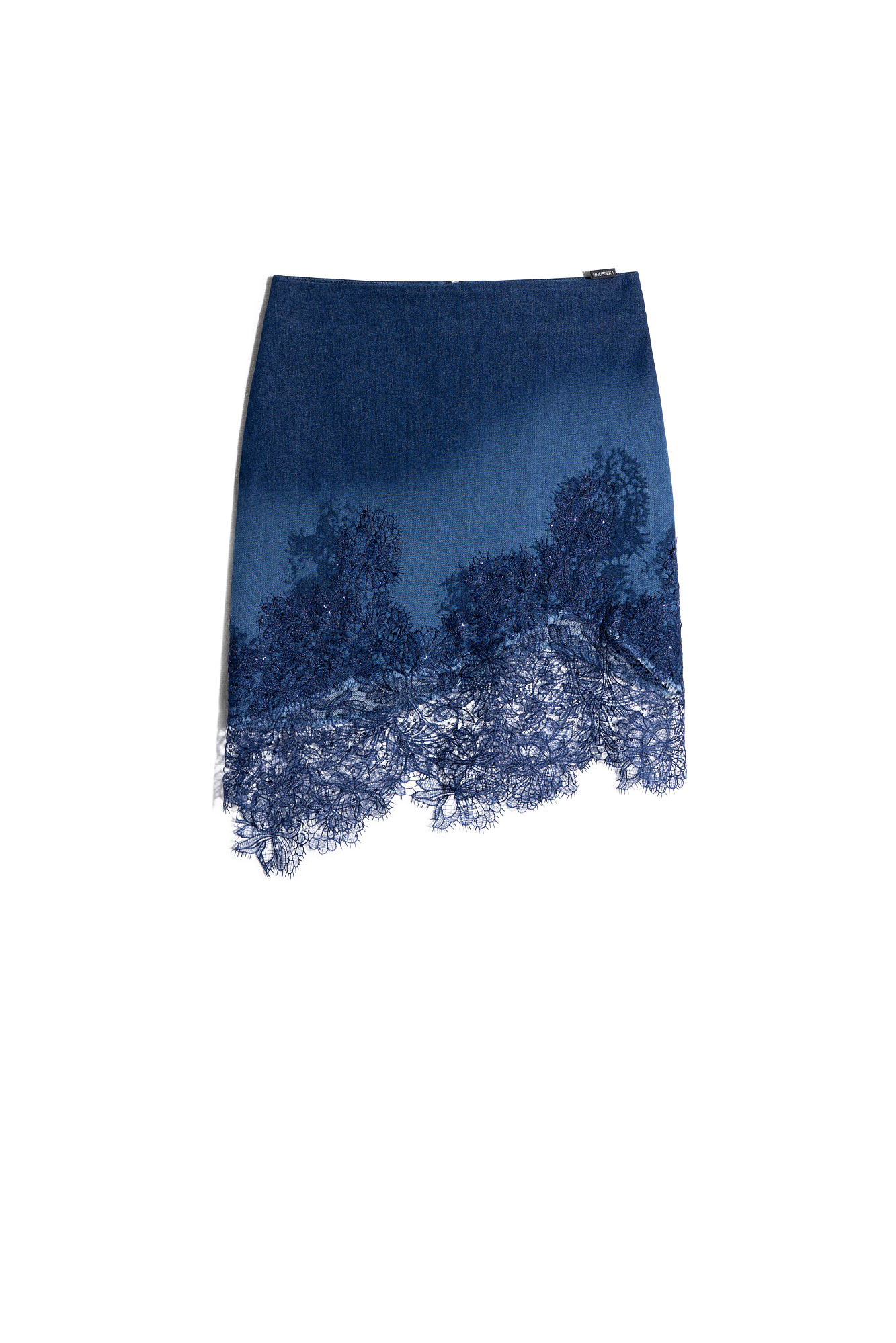 Джинсовая юбка длины мини с градиентным принтом. Модель приталенного силуэта с асимметричным низом, декорированным кружевом и пайетками. Застежка на молнию.