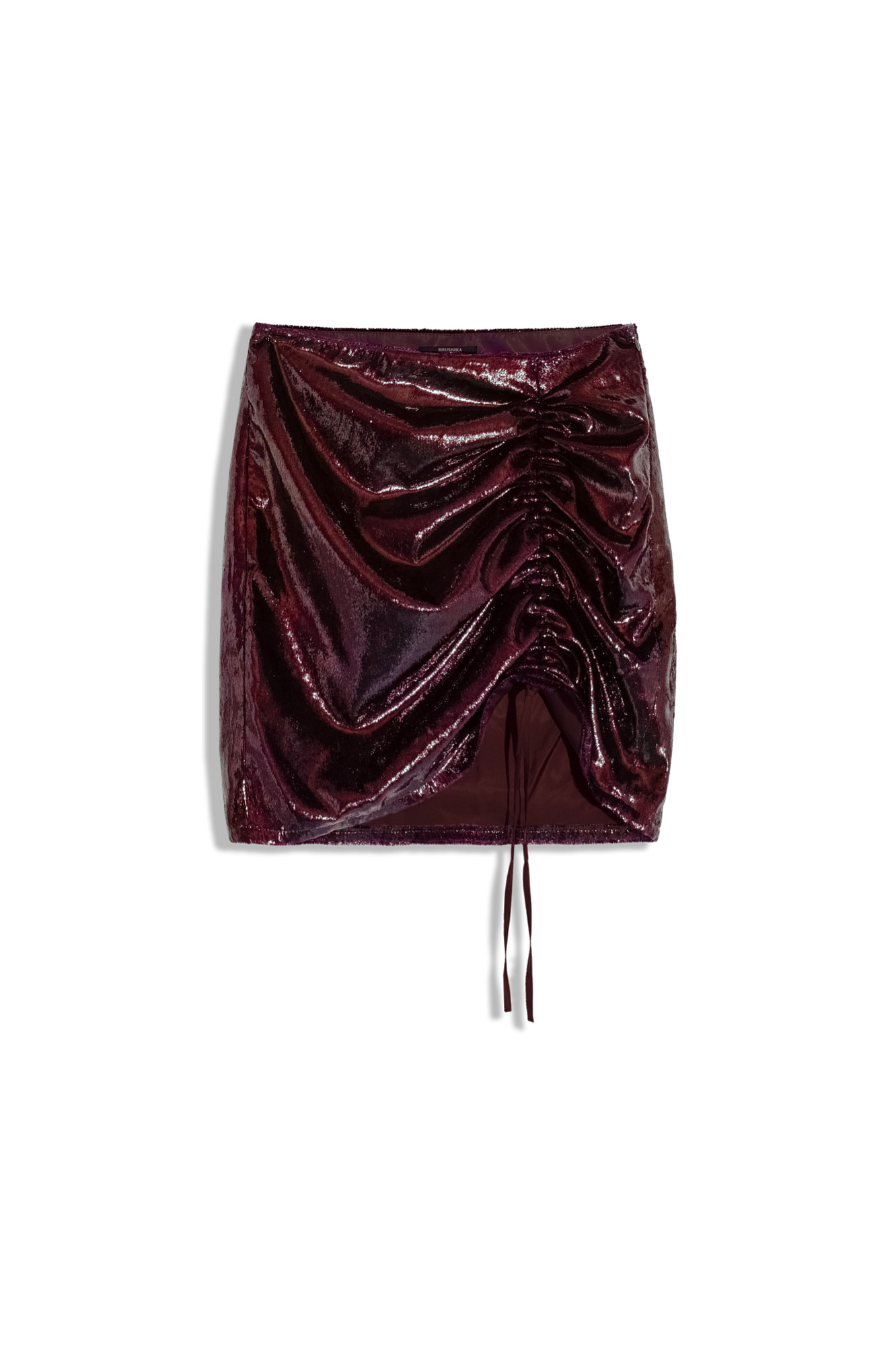 Юбка длины мини из блестящей ткани. Модель на кулиске. Застежка сбоку. Изделие на подкладке.