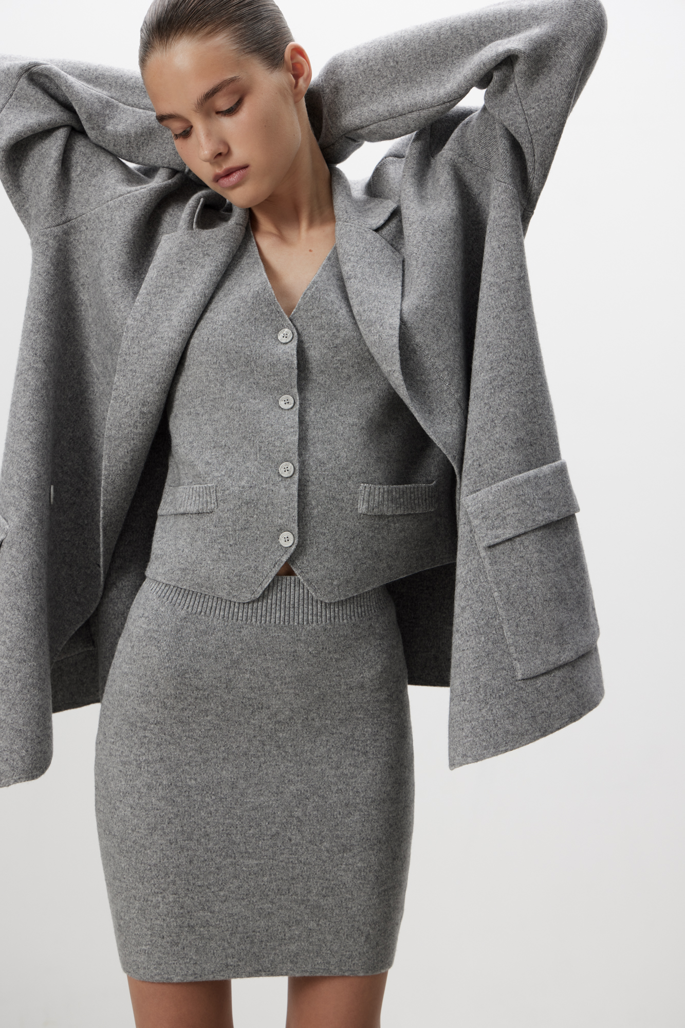 Трикотажная юбка длины мини из смесовой шерсти с добавлением кашемира. Модель приталенногоо силуэта с эластичным поясом в рубчик.