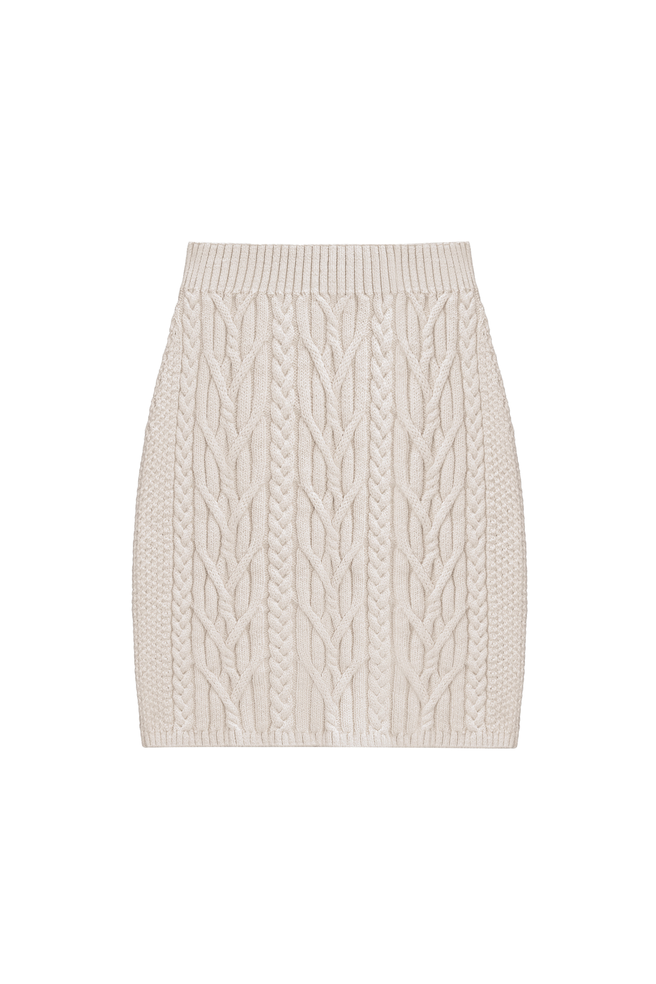 Трикотажная юбка длины мини из вискозы и хлопка. Модель с широким эластичным поясом. Изделие декорировано фактурной вязкой в виде кос разной толщины. Края выполнены в рубчик.