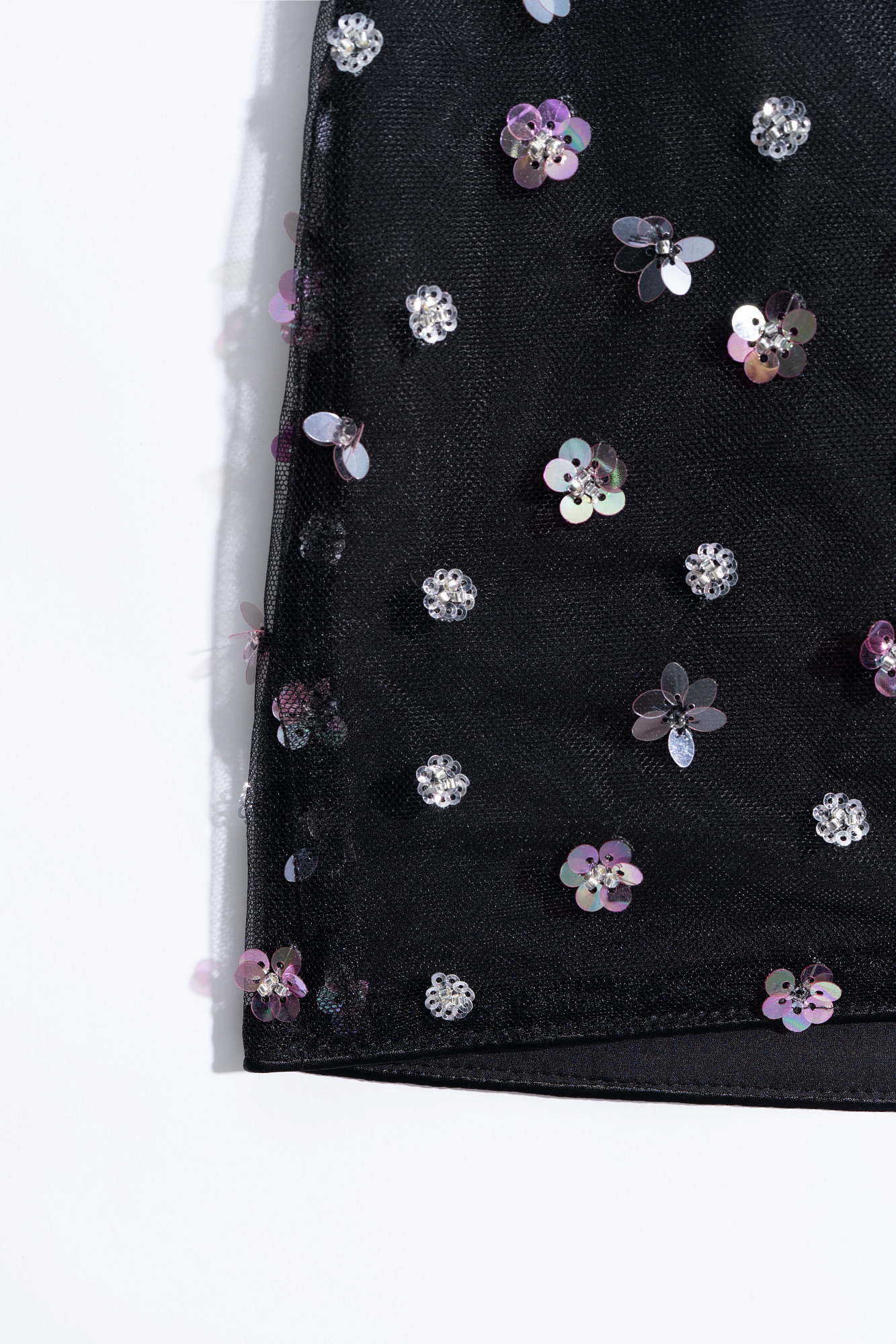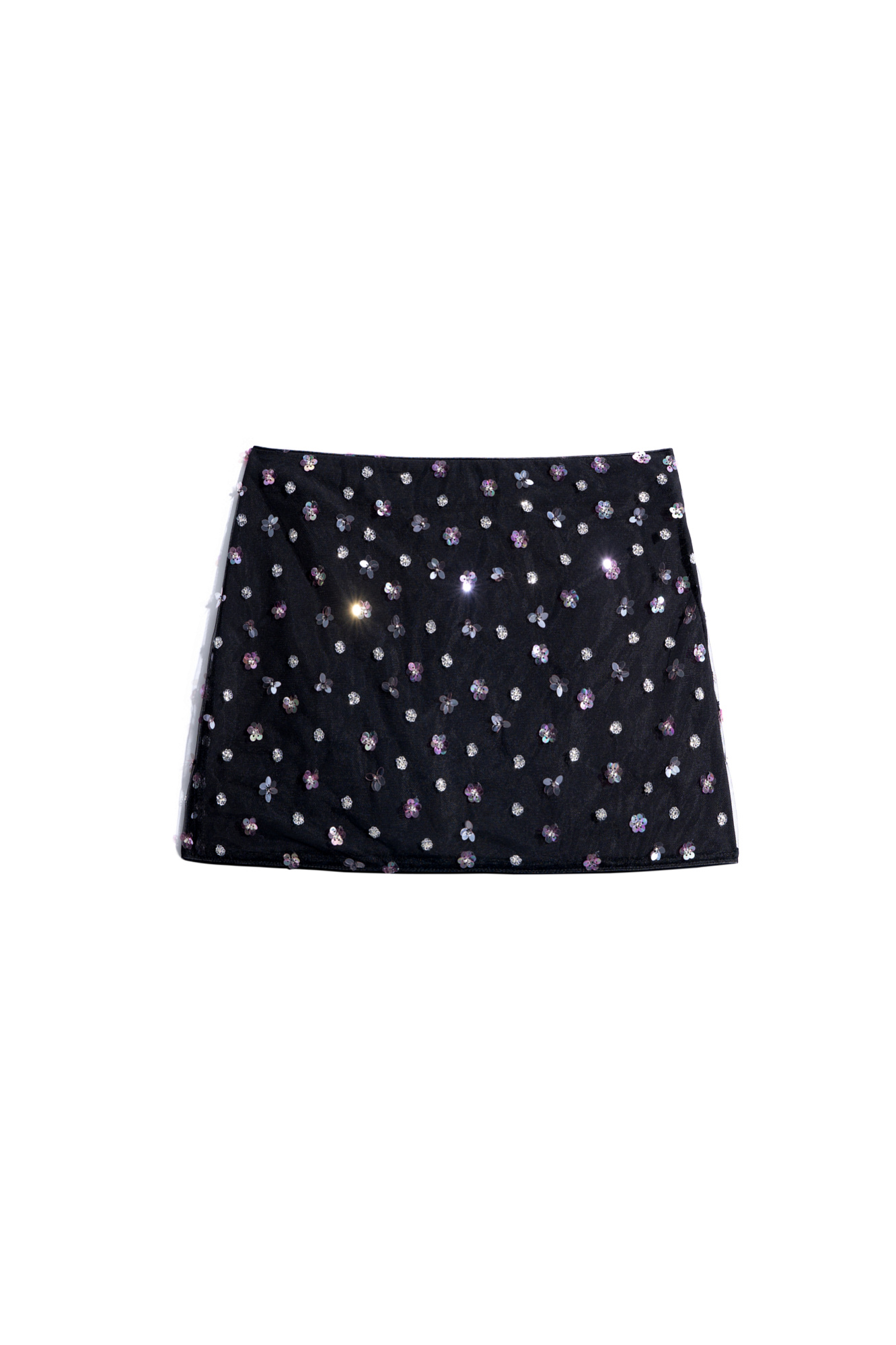 Юбка длины мини, расшитая пайетками и бисером. Застежка на потайную молнию. Изделие на подкладке.