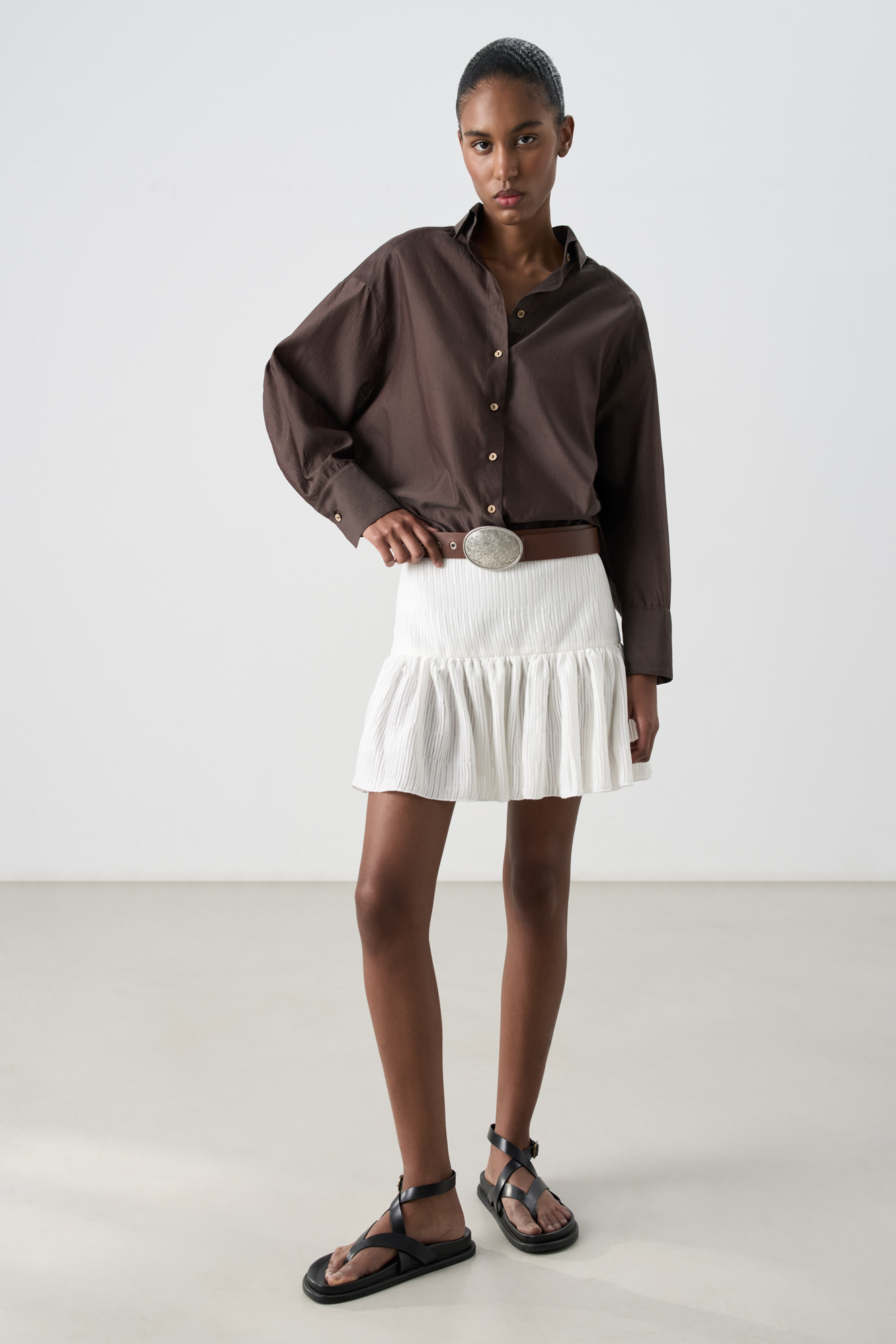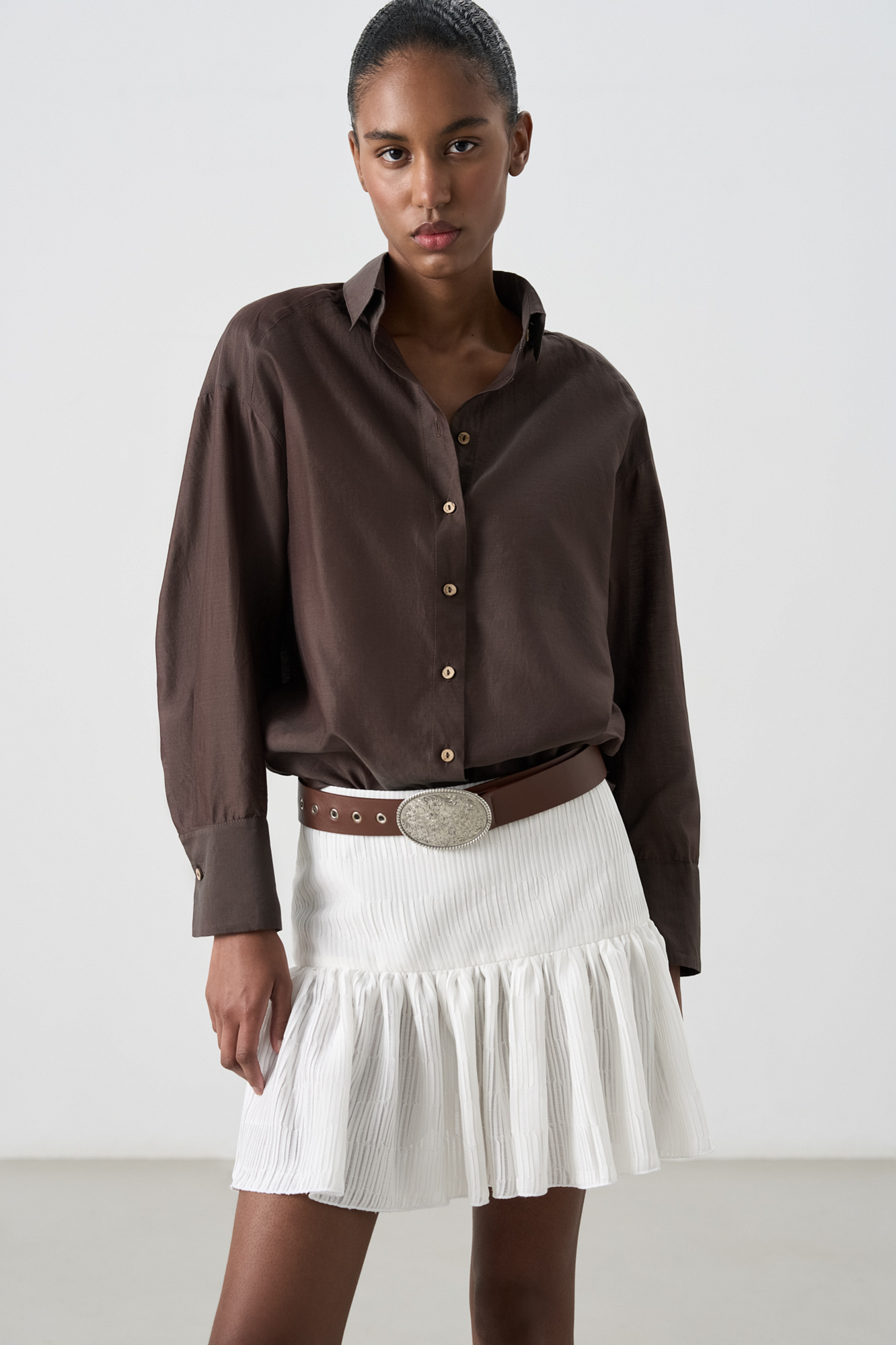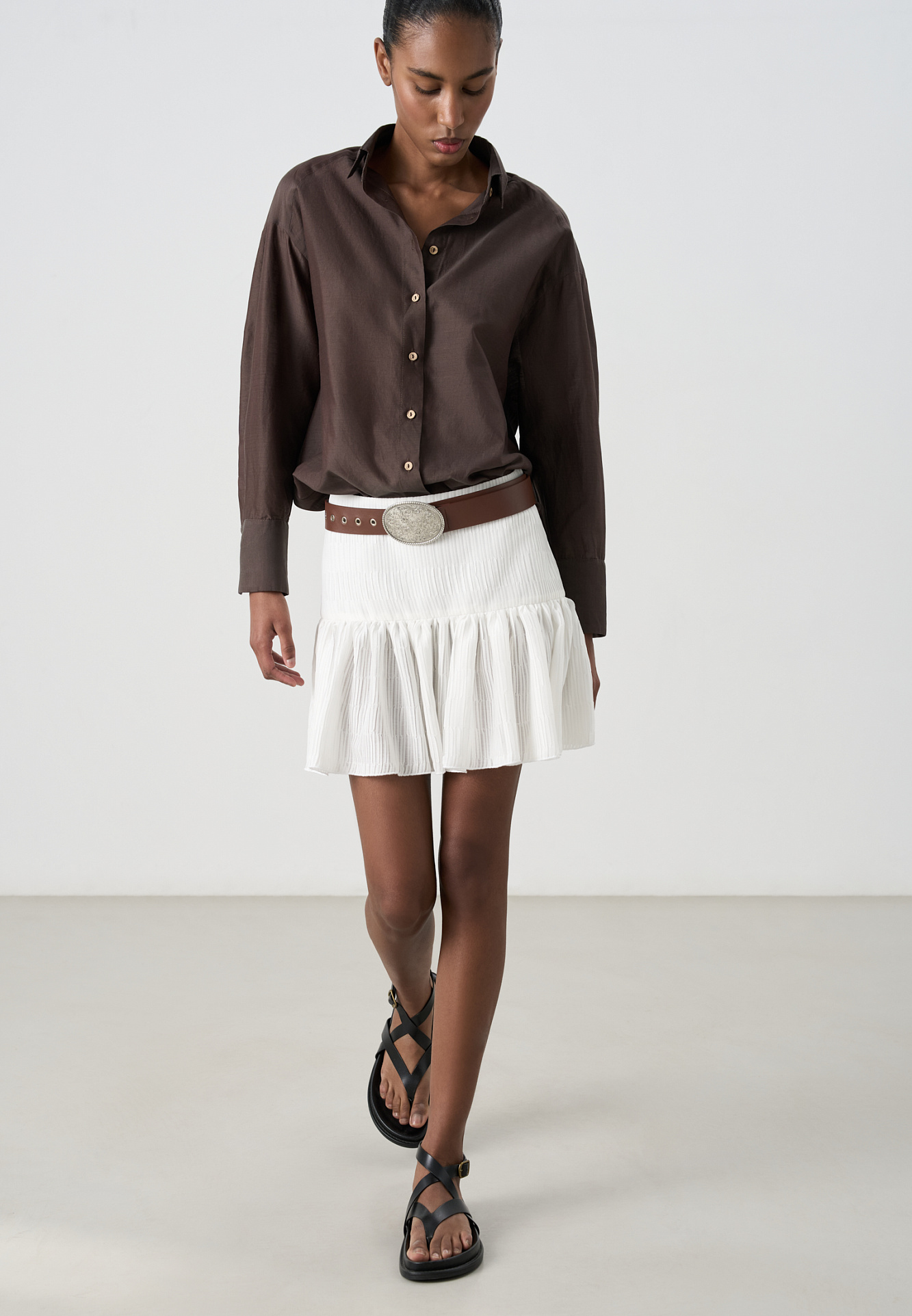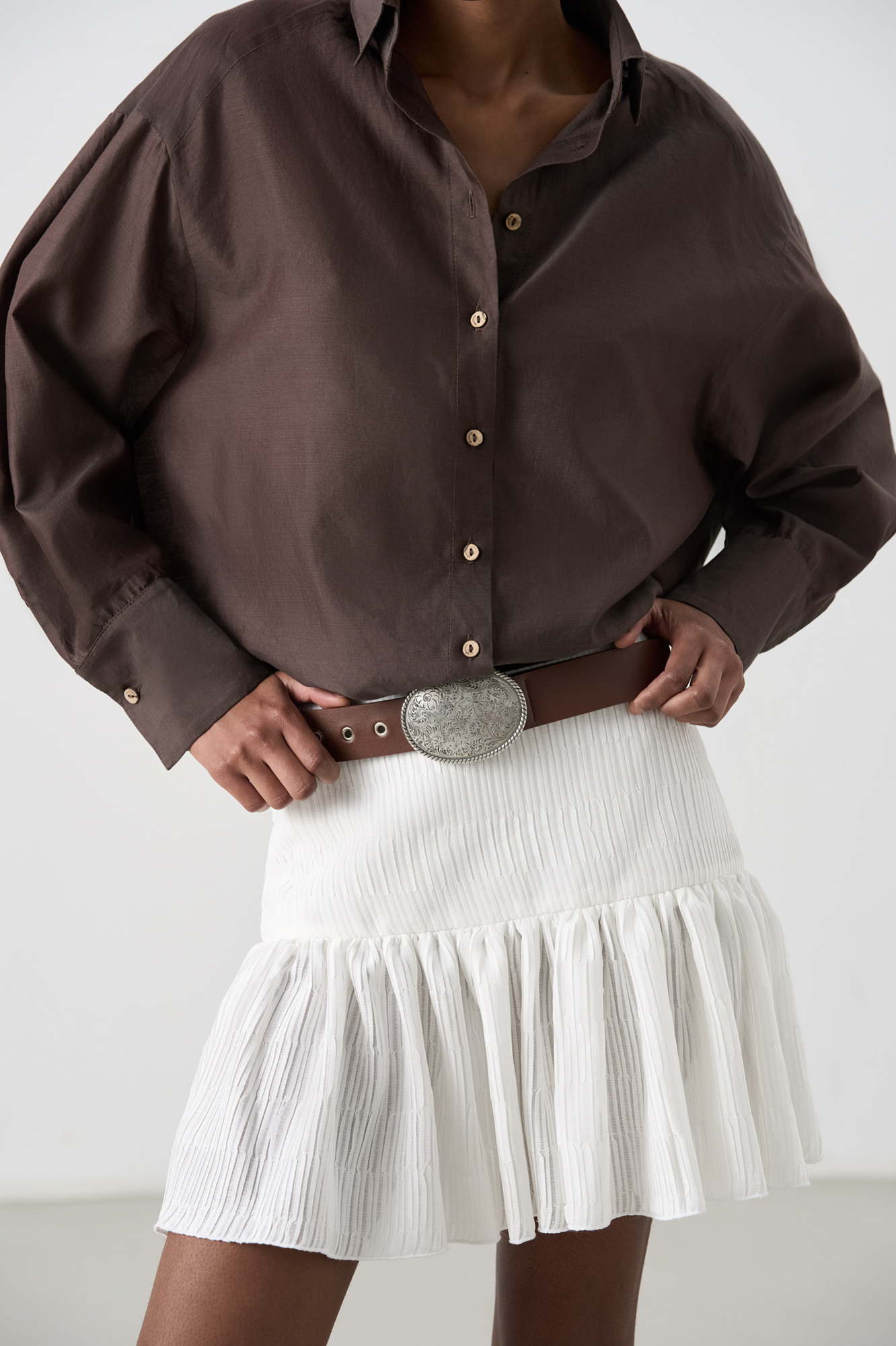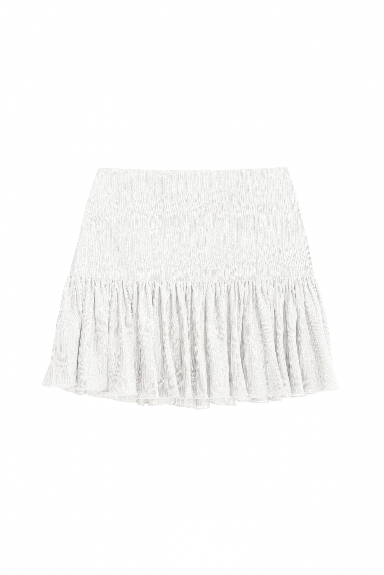 Шифоновая юбка длины мини из текстурированной ткани. Модель приталенного силуэта с кокеткой.
