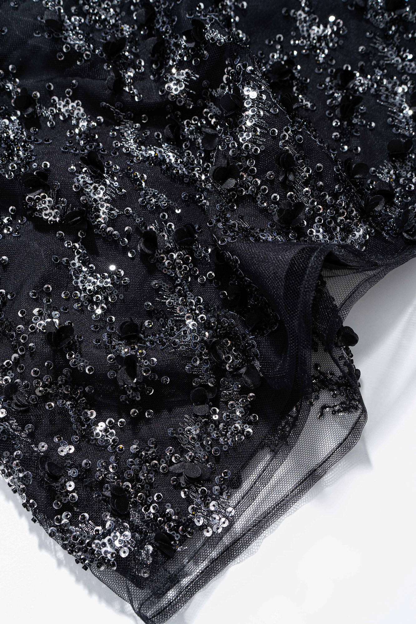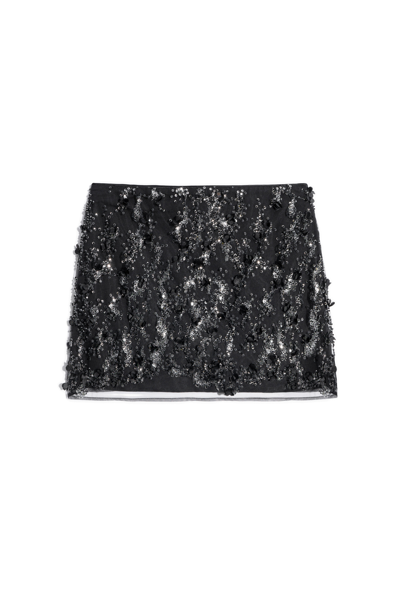 Юбка длины мини с цветочным орнаментом, вышитым пайетками. Застежка на потайную молнию. Изделие на подкладке.