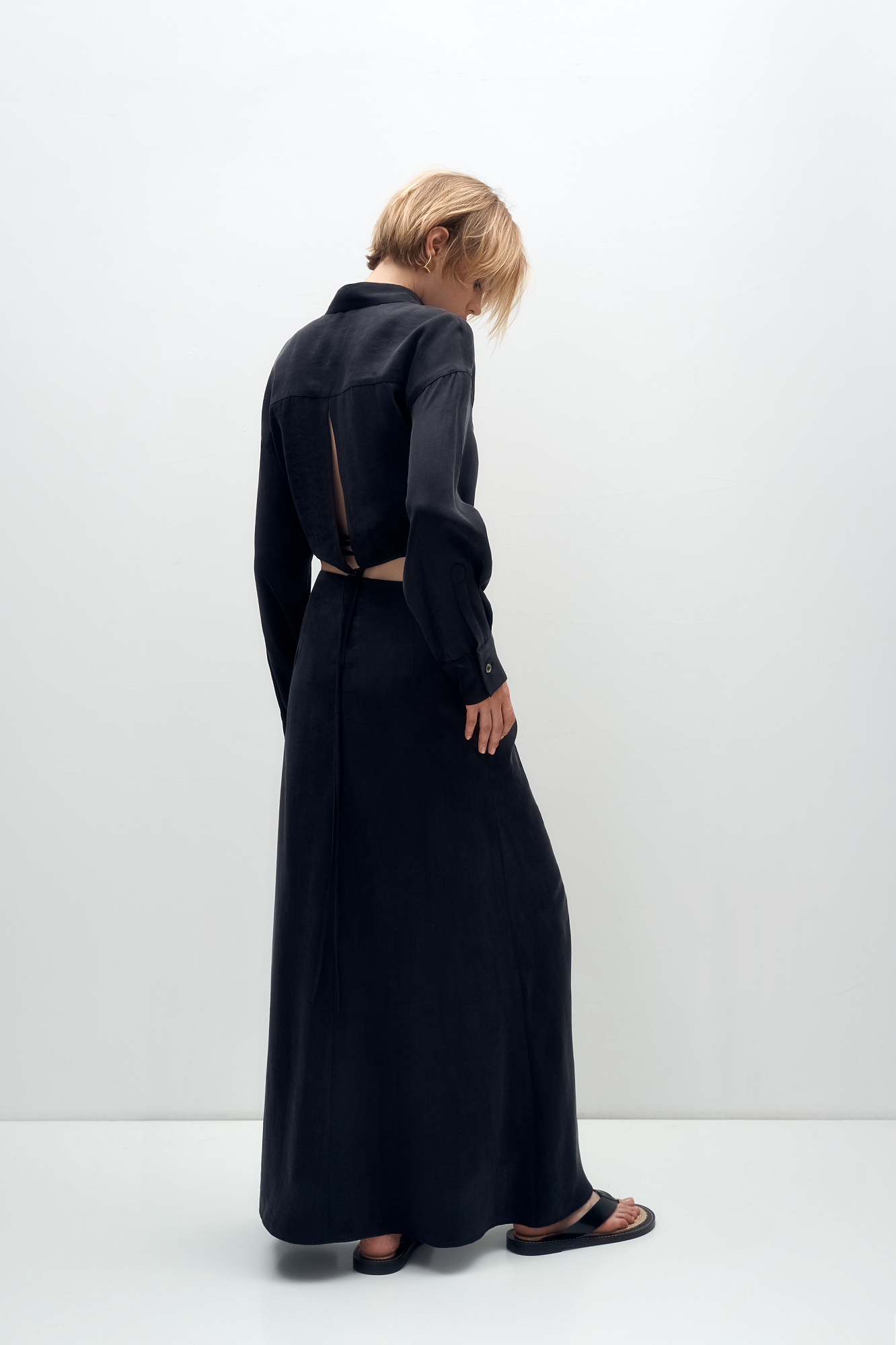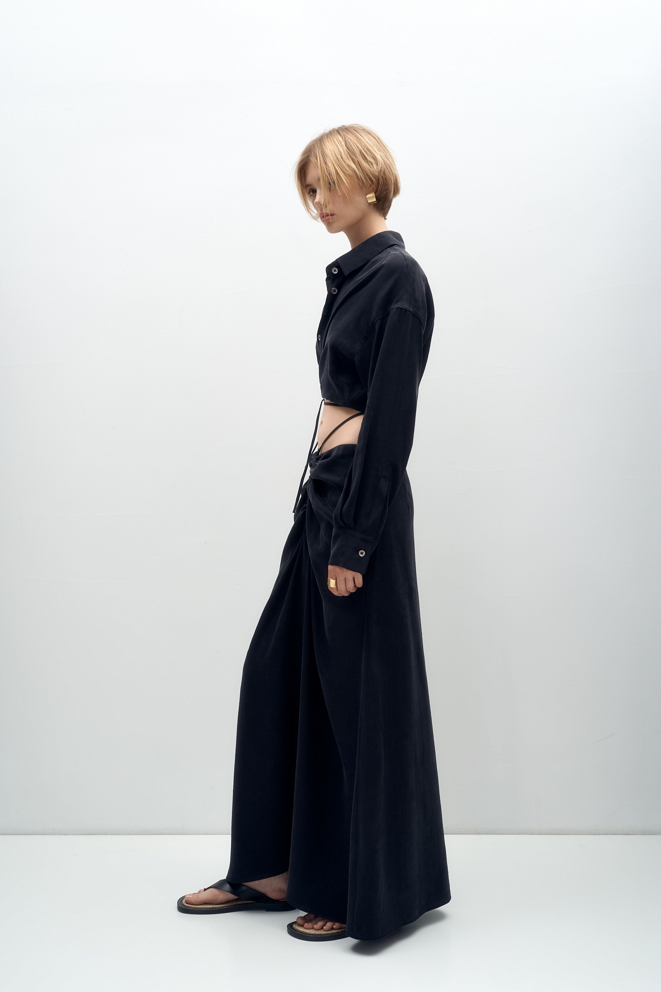 Юбка из 100% купры с драппировкой и кулиской по середине. Дополнить образ можно рубашкой из такого же материала.