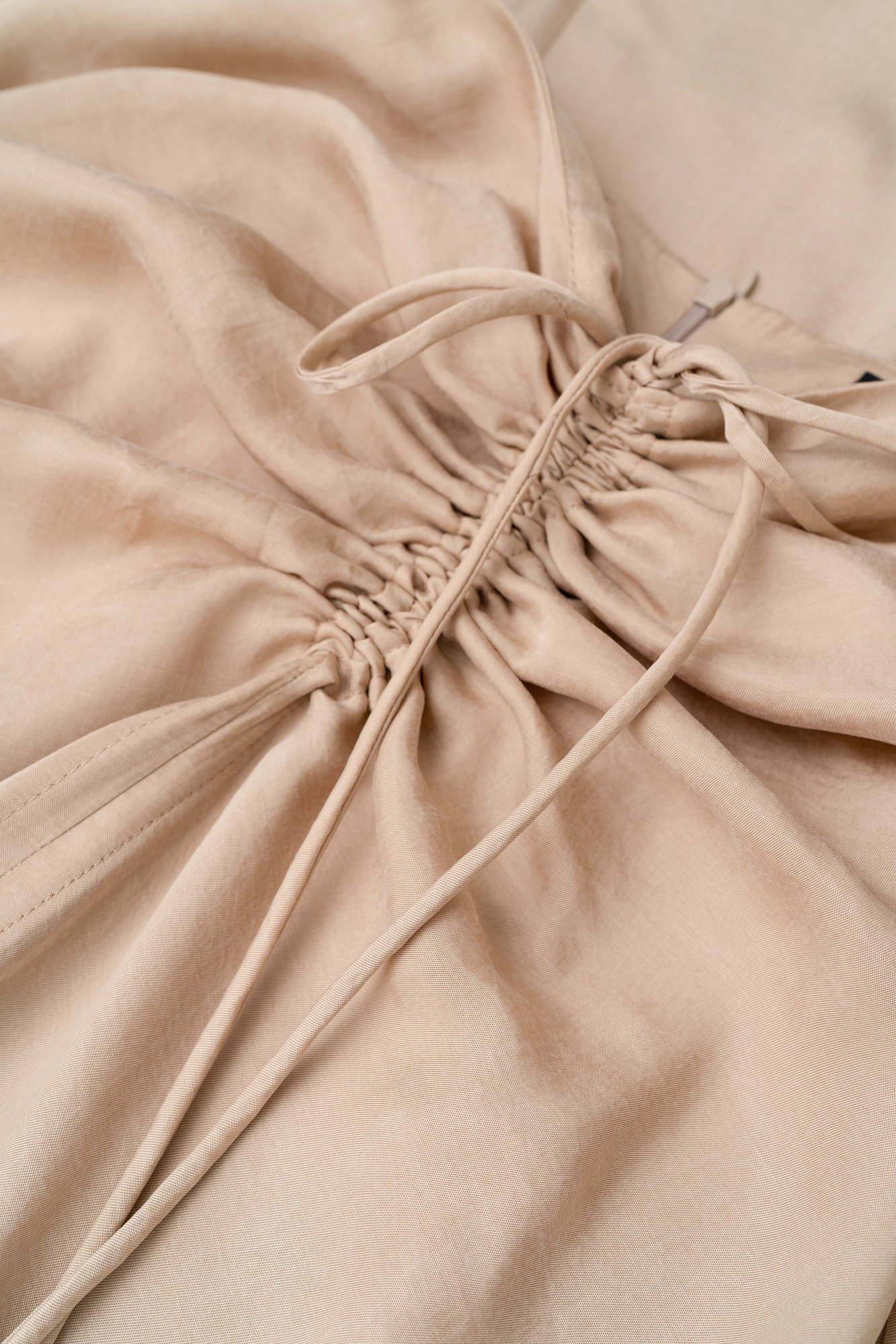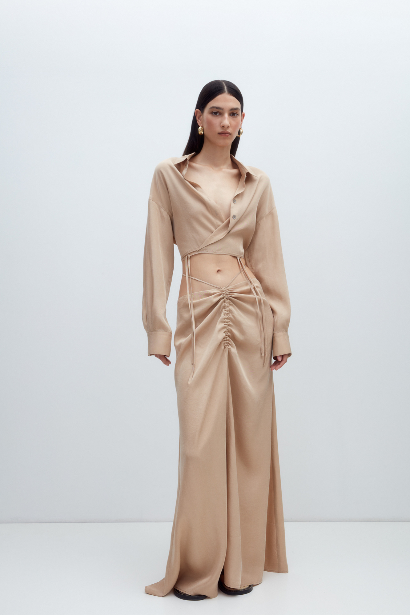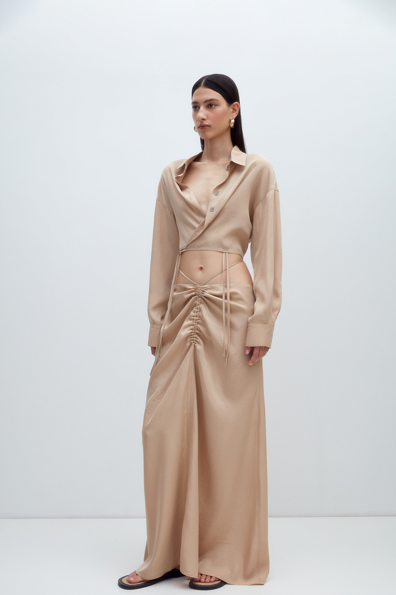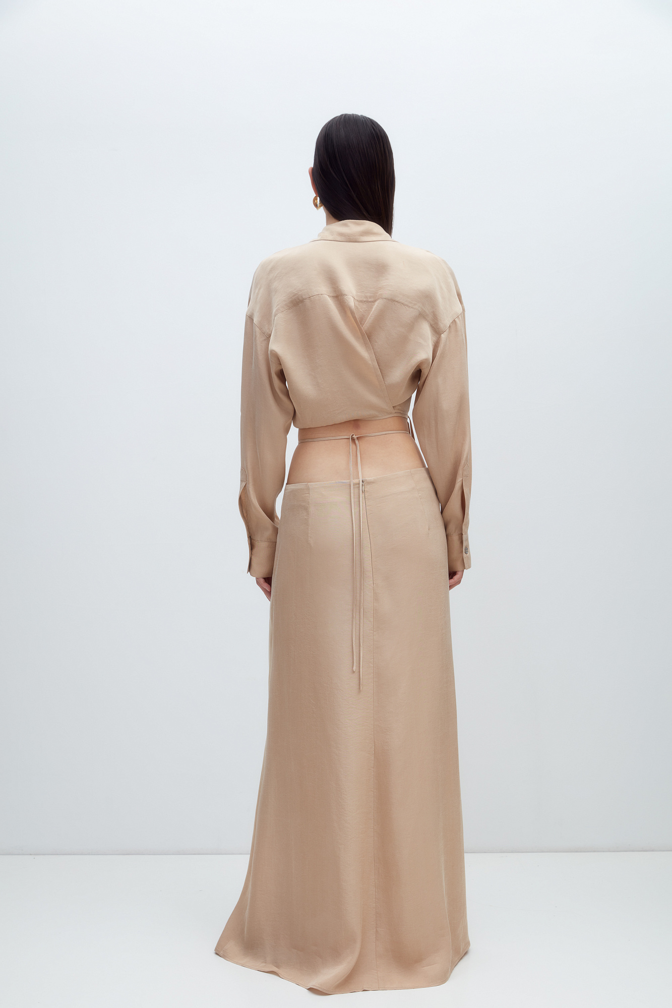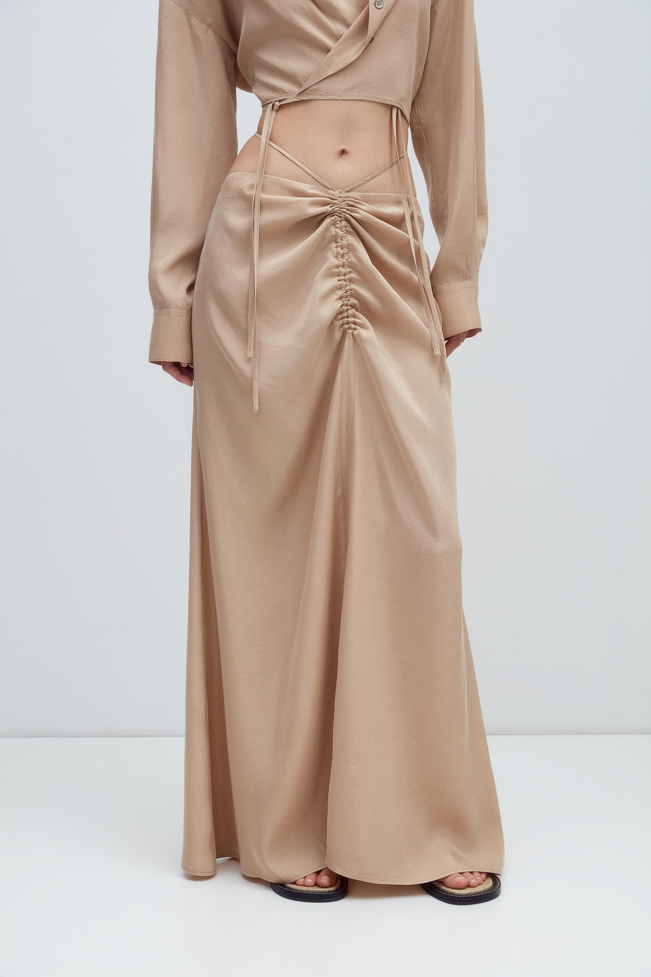 Юбка из 100% купры с драппировкой и кулиской по середине. Дополнить образ можно рубашкой из такого же материала.
