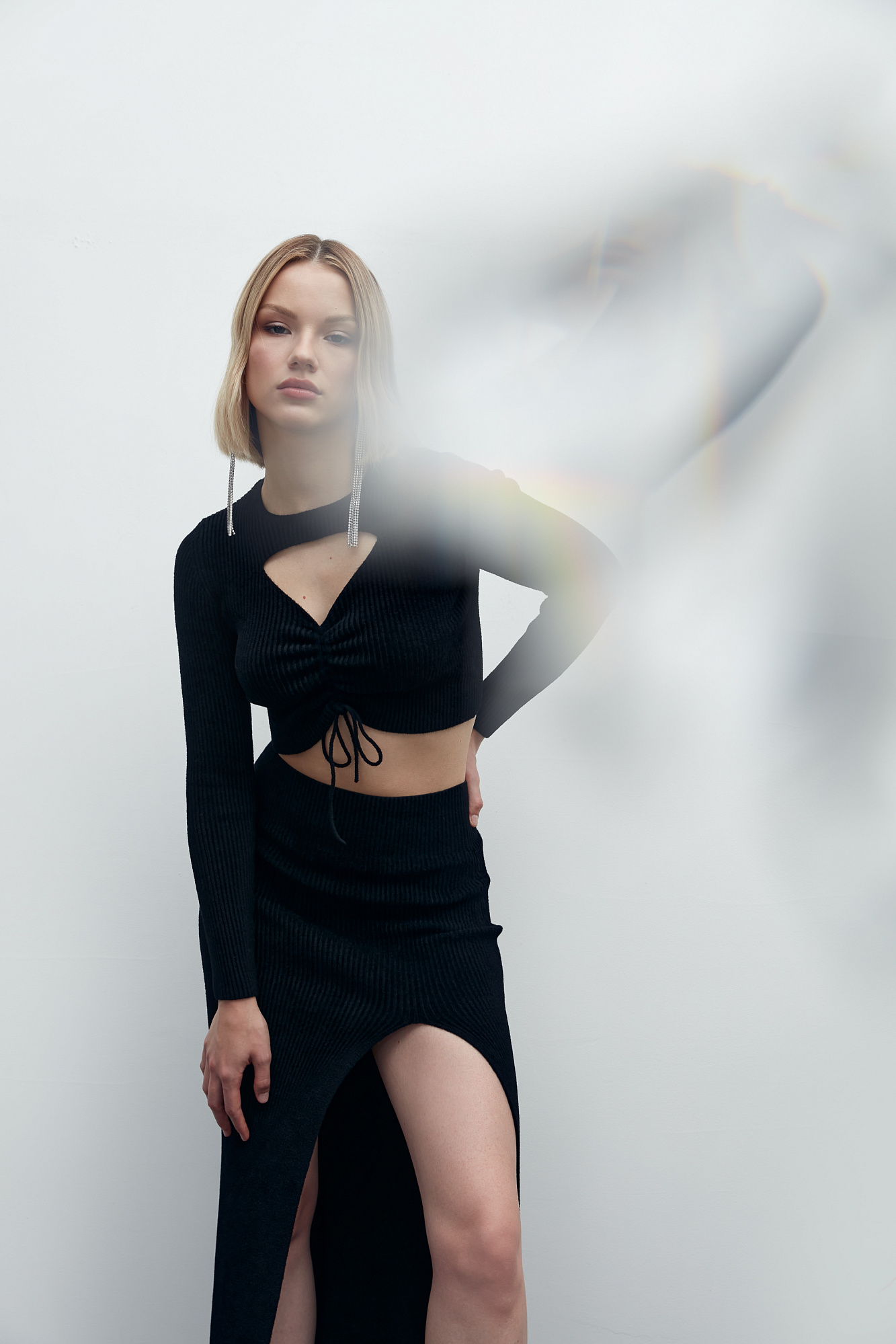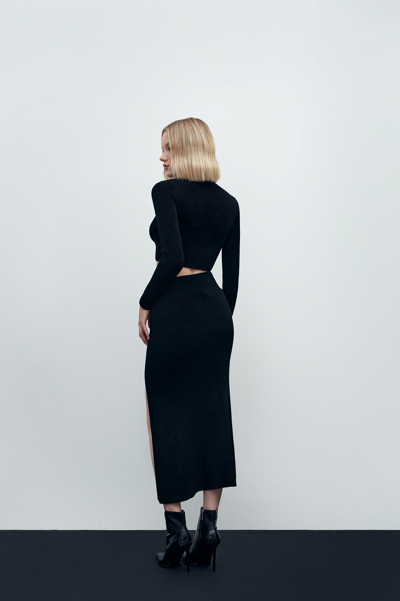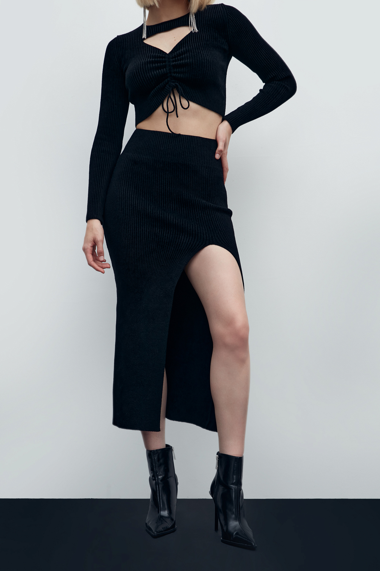 Трикотажная юбка длины миди из вискозы в рубчик. Модель приталенного силуэта с широким эластичным поясом и высоким разрезом спереди.