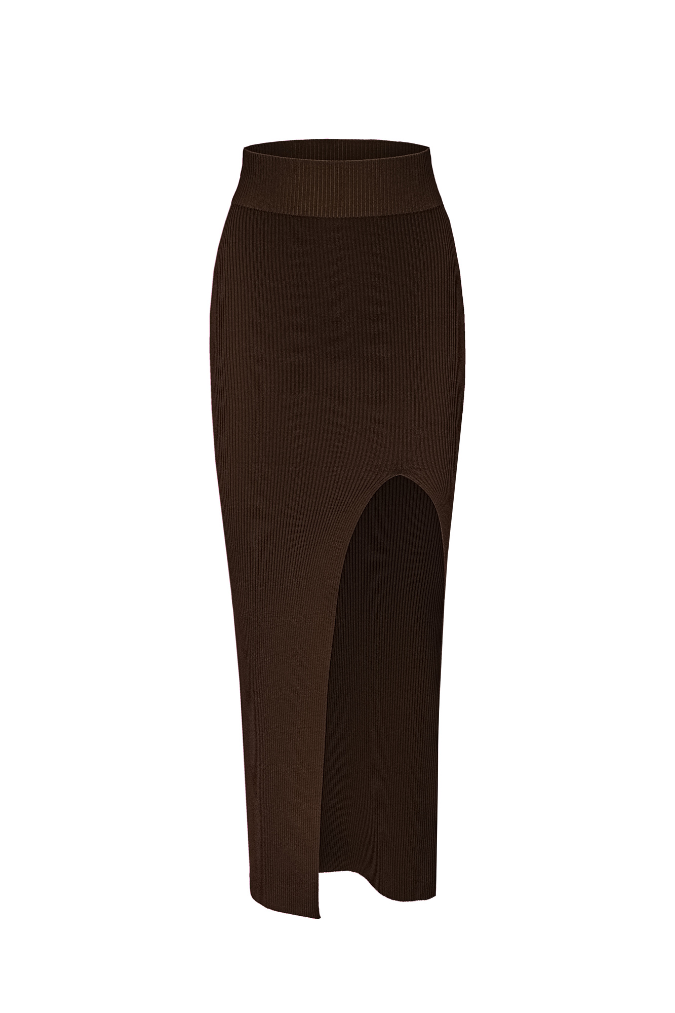 Трикотажная юбка длины макси с широким эластичным поясом и высоким разрезом спереди. Дополнить образ можно топом в том же стиле.