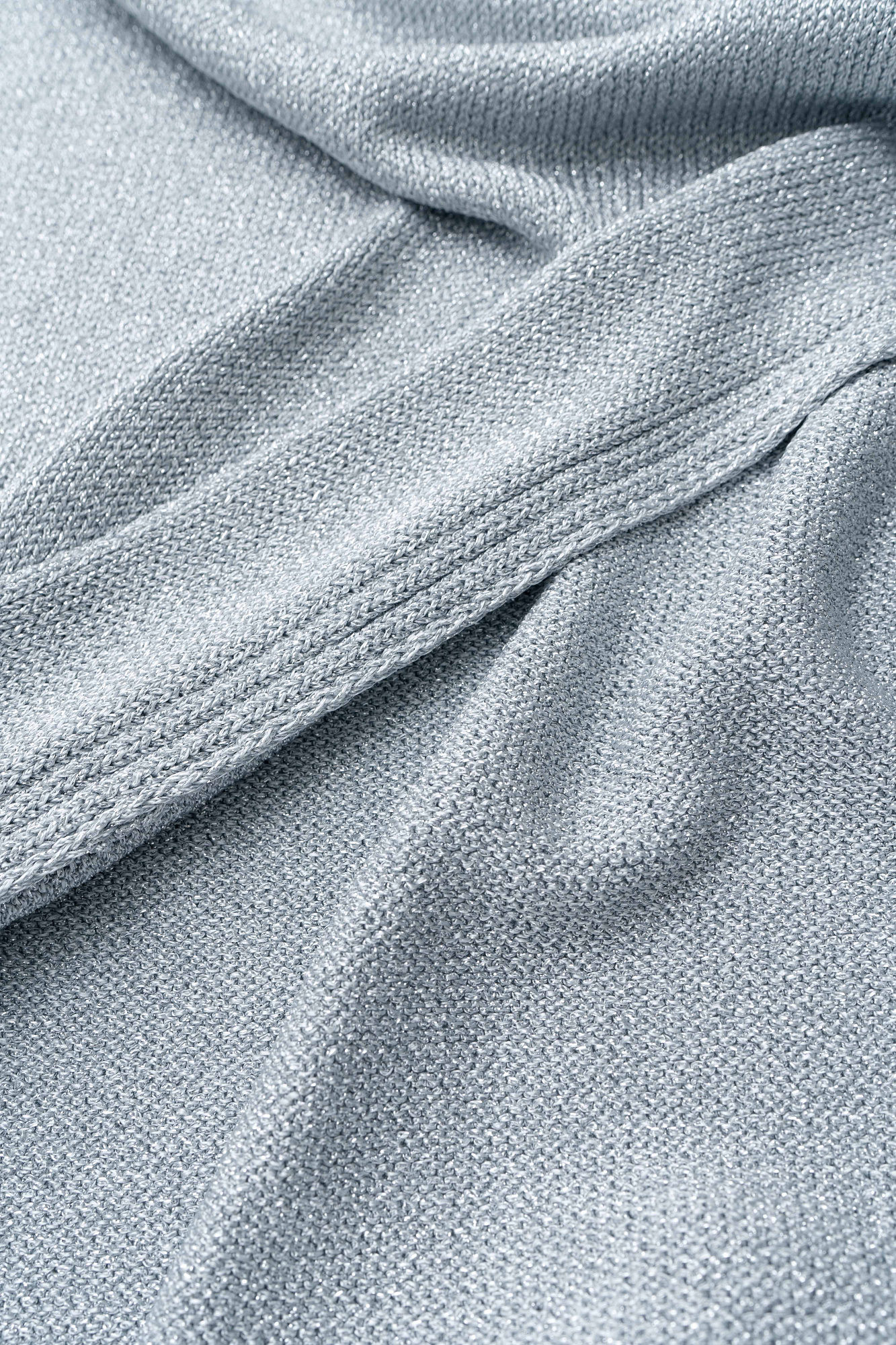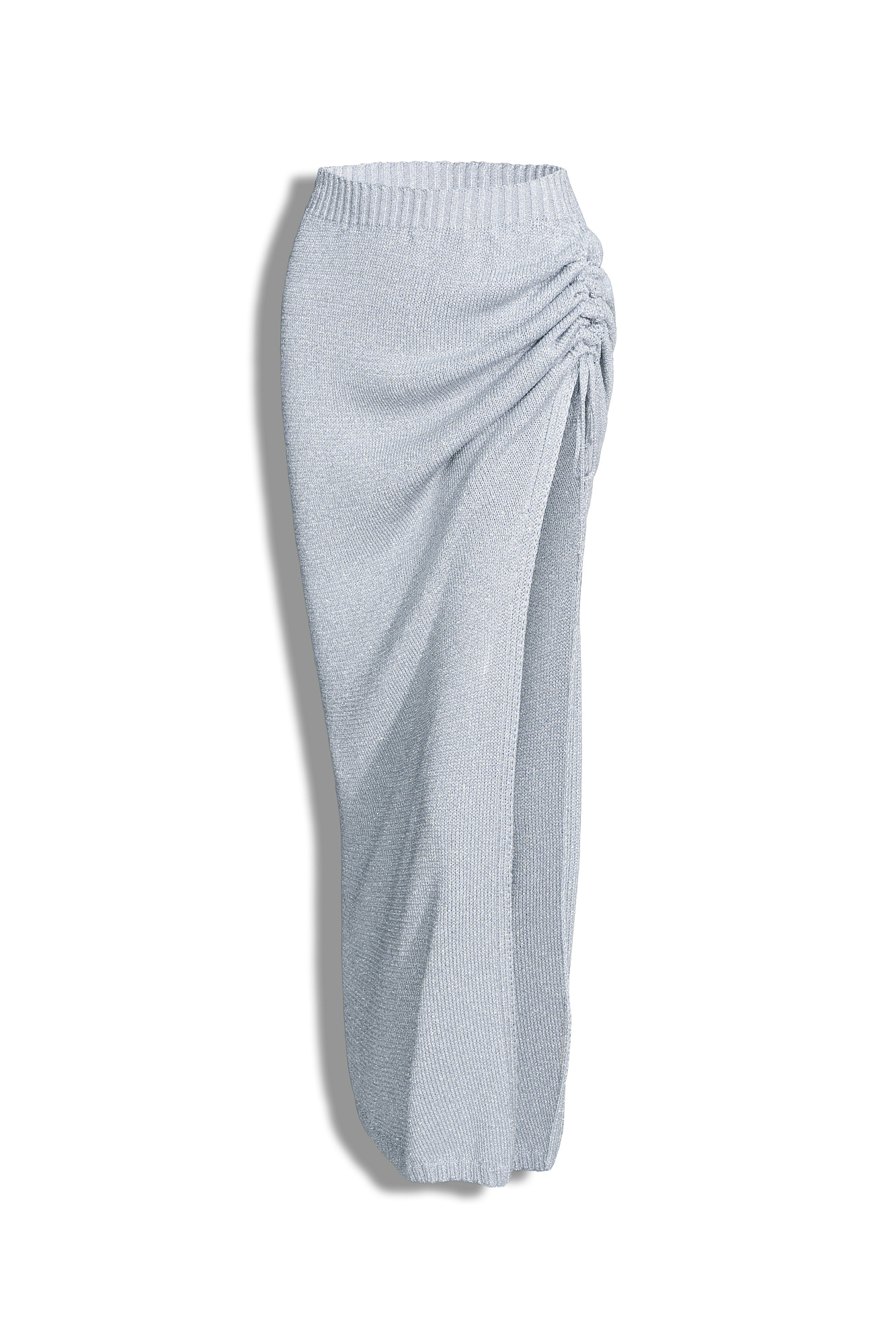 Трикотажная юбка длины макси из вискозы с люрексом. Модель облегающего силуэта, с эластичным поясом в рубчик и разрезом от бедра с кулиской. Дополнить образ можно топом в таком же стиле.