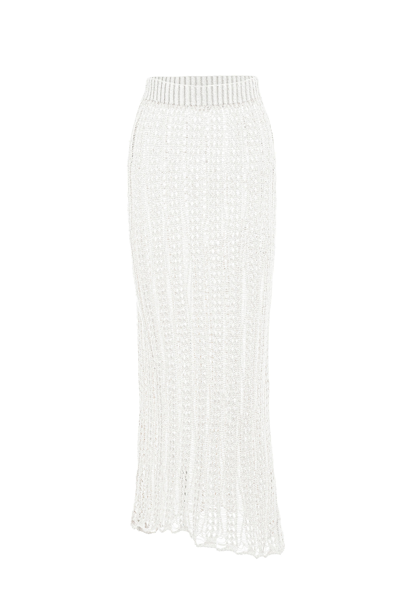 Полупрозрачная ажурная юбка. Модель приталенного силуэта длины миди с эластичным поясом в рубчик. Дополнить образ можно джемпером в таком же стиле.