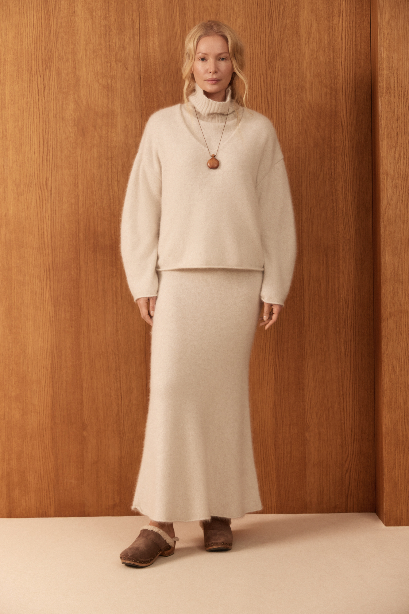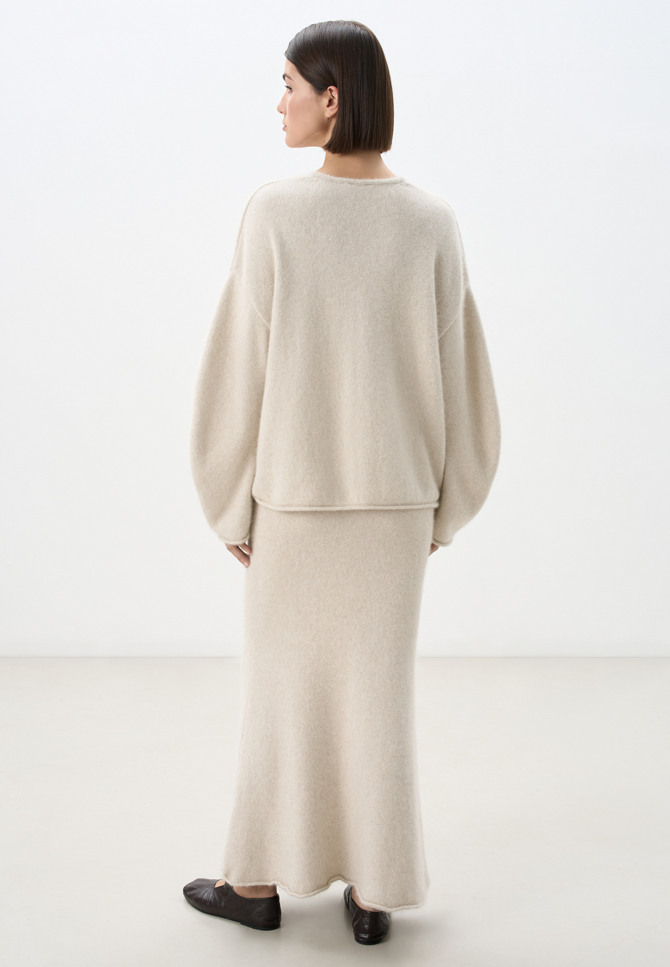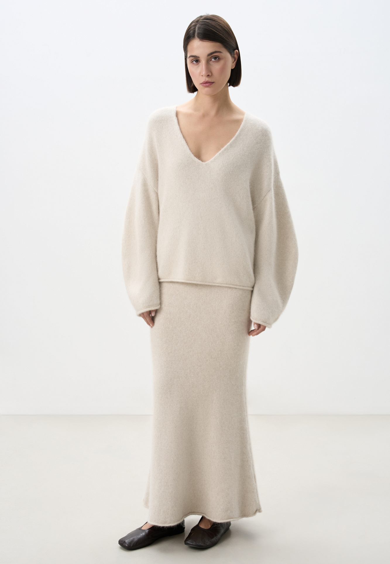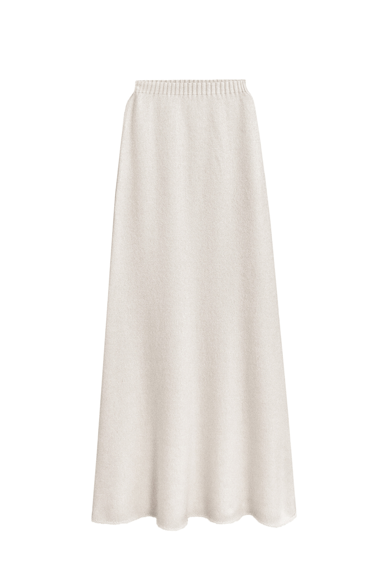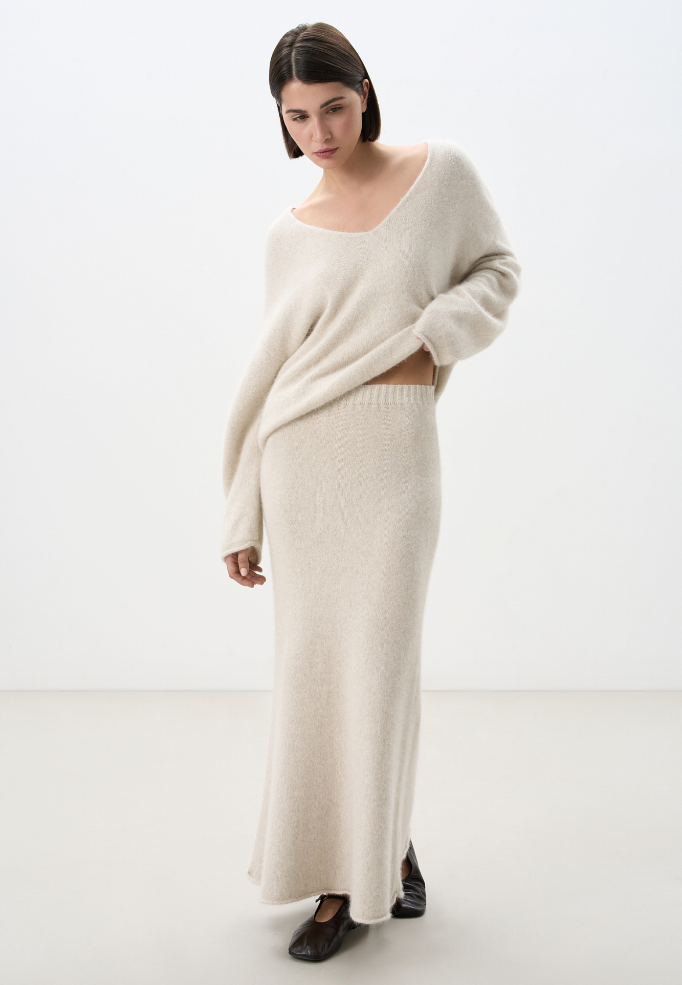Трикотажная юбка длины макси из пуха лисы. Модель А-силуэта, с эластичным поясом на резинке и валиком по низу подола. Дополнить образ можно джемпером в таком же стиле.