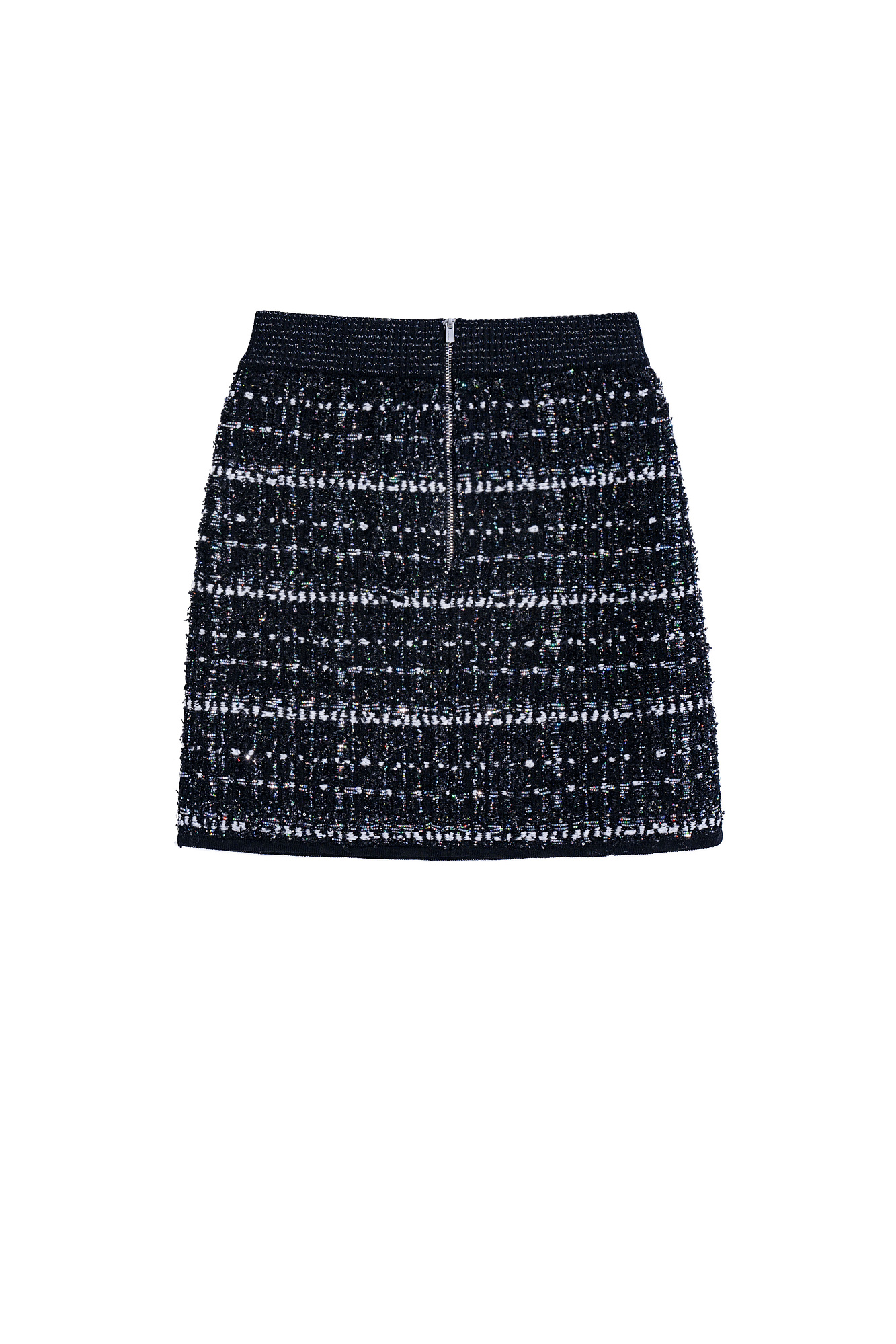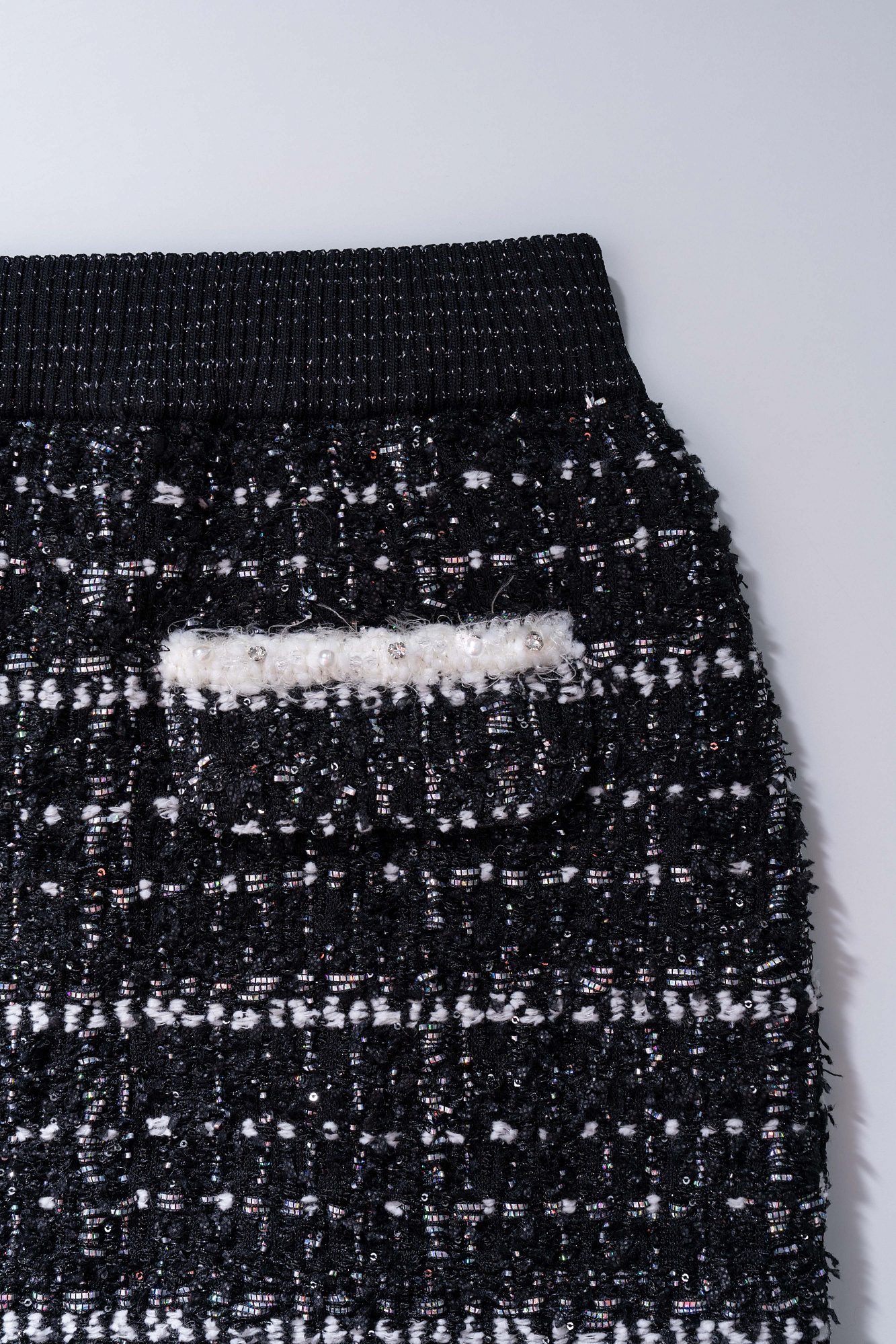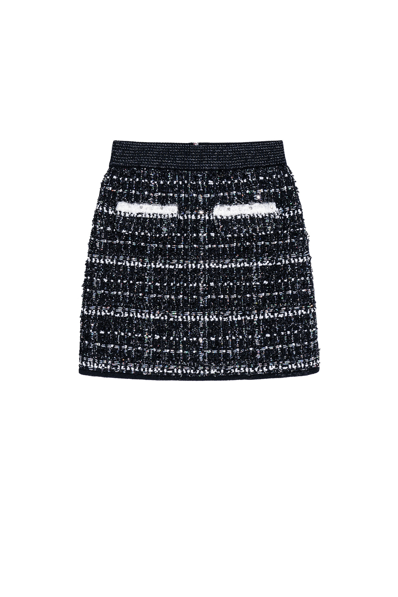 Трикотажна юбка длины мини. Модель выполнена из фактурного твида с имитацией накладных карманов и застежкой на молнию. Изделие декорировано люрексом, пайетками и бусинами. Эластичный пояс на резинке