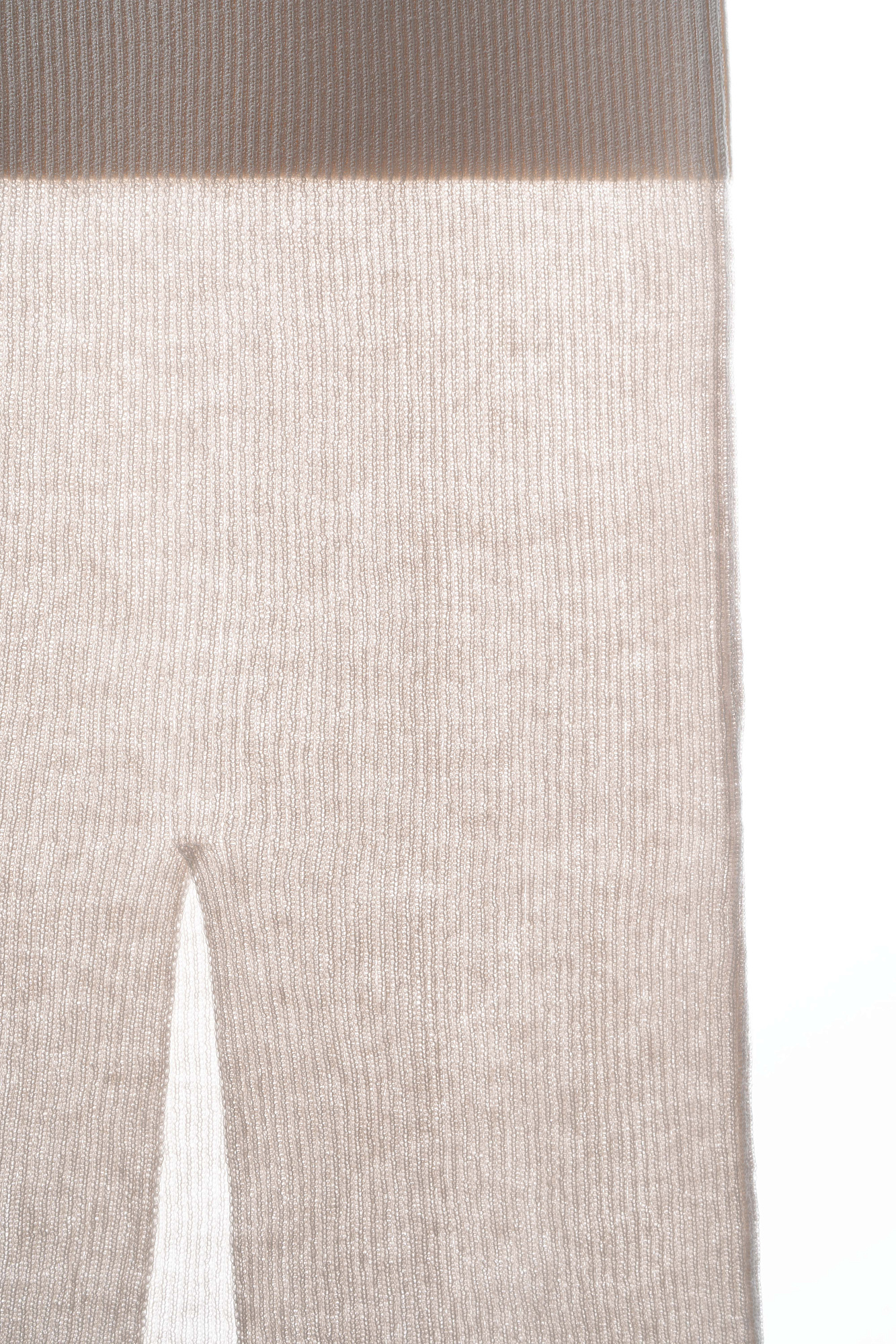 Трикотажная юбка длины миди из тонкого хлопка с добавлением вискозы. Изделие выполнено в комбинированной вязке, сочетая более плотную и полупрозрачную текстуры. Модель приталенного силуэта, с широким эластичным поясом и разрезом сзади.