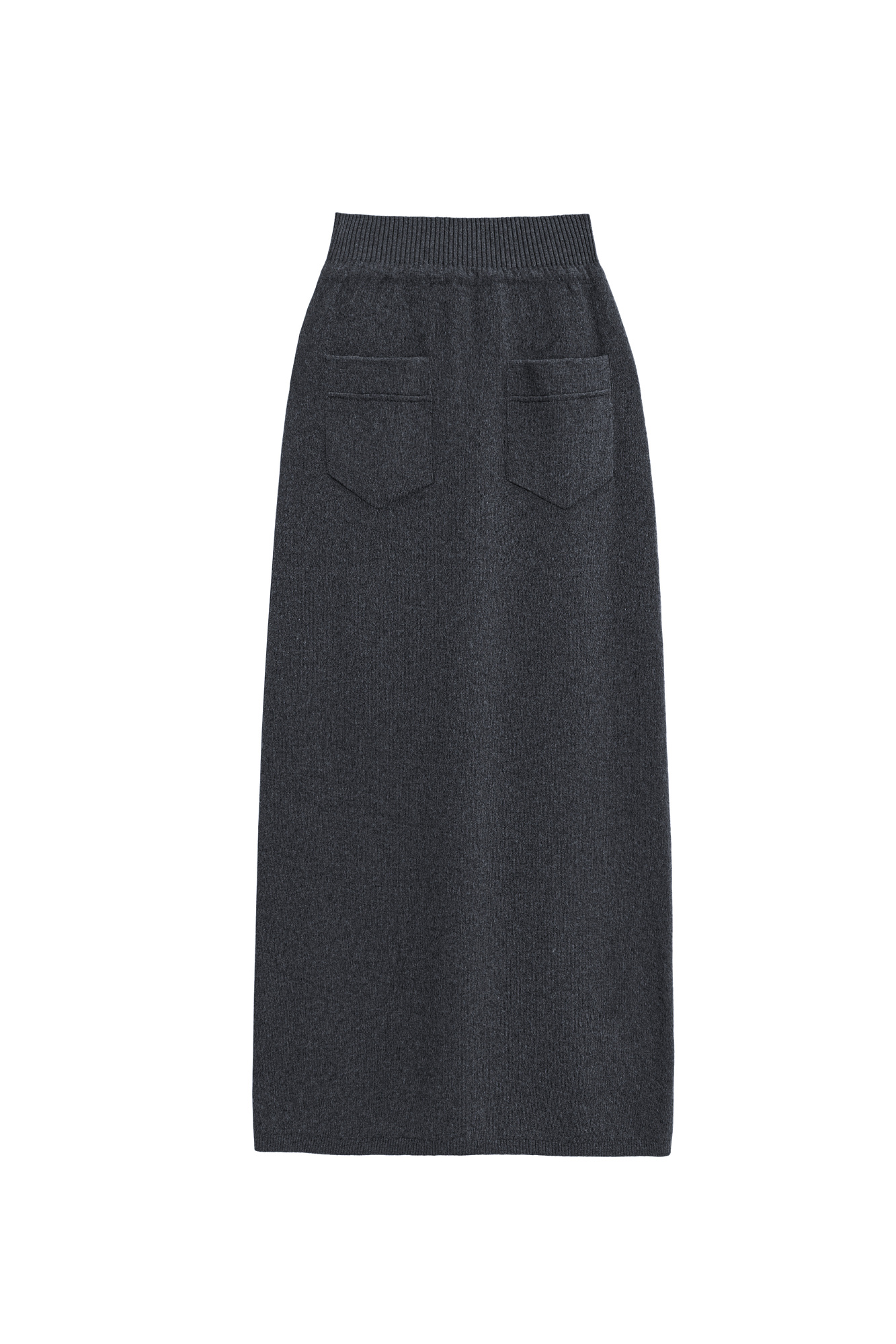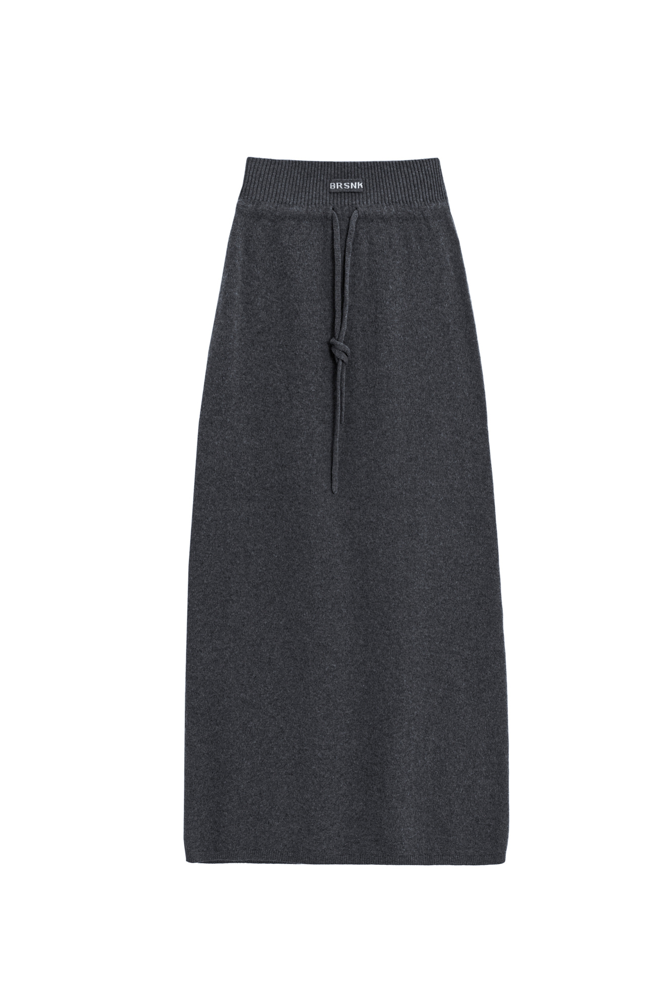 Трикотажная юбка длины макси из кашемира и шерсти. Модель по фигуре, с широким эластичным поясом в рубчик, дополненным кулиской и двумя накладными карманами сзади. Изделие декорировано вывязанным логотипом.