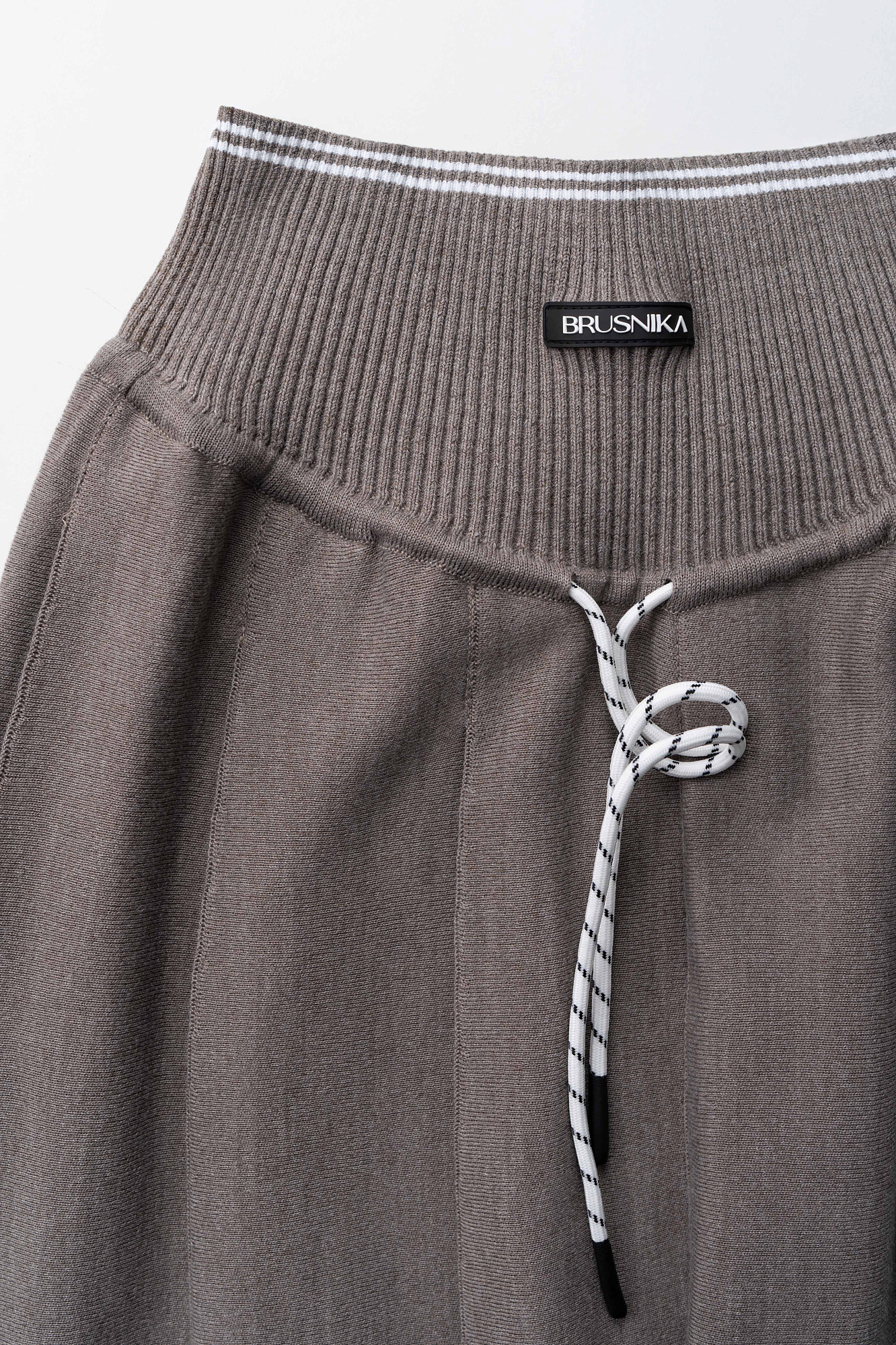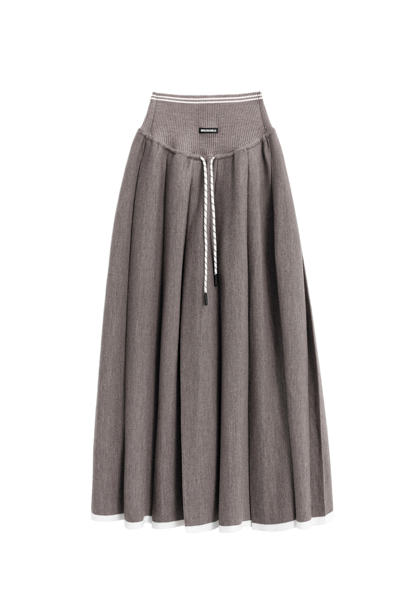 Трикотажная юбка плиссе длины миди из шерсти. Модель А-силуэта с широкими складками на кокетке дополненной шнурком. Кокетка выполнена в рубчик и декорирована лампасом контрастного цвета и брендированным ярлыком спереди.