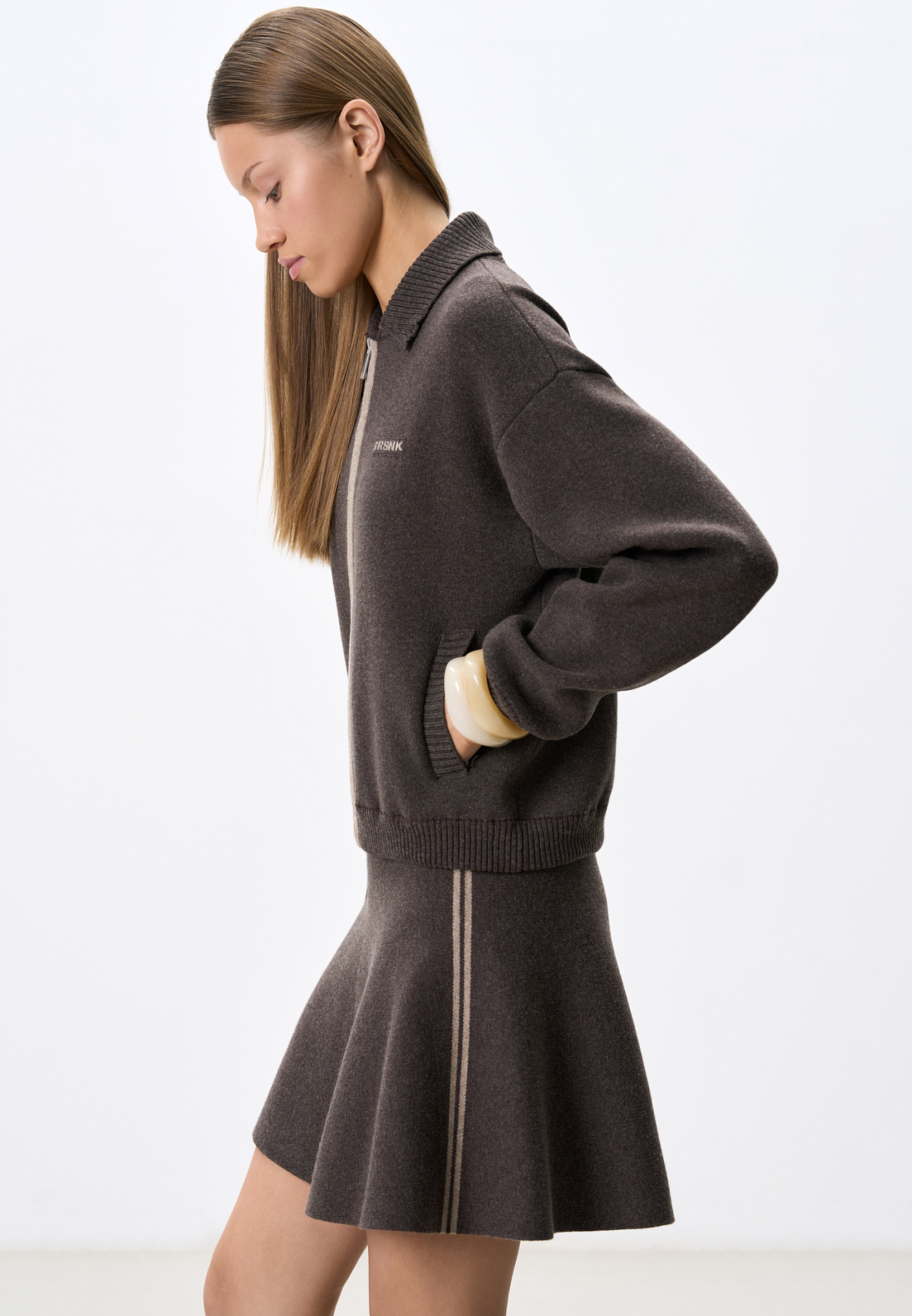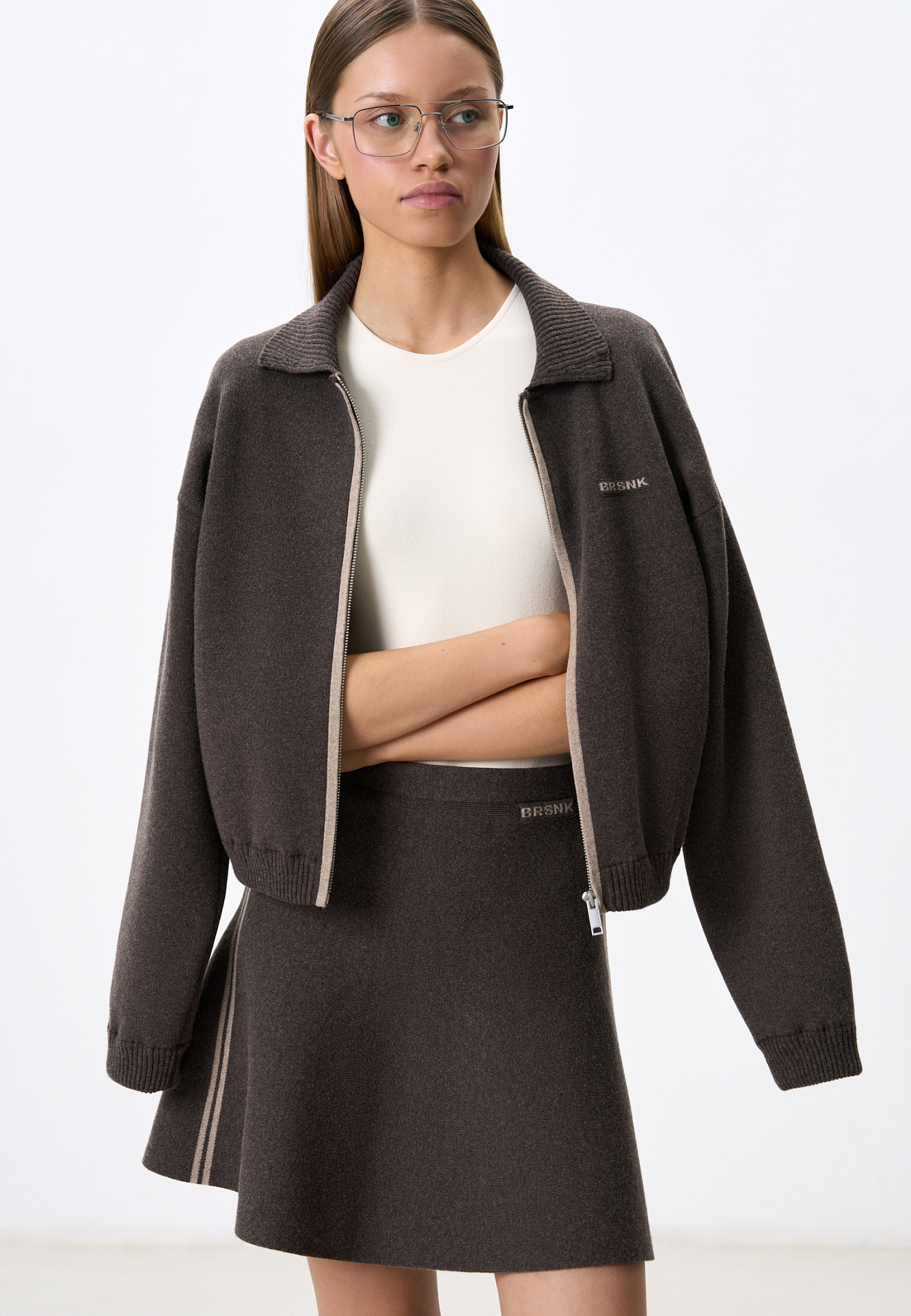 Трикотажная юбка длины мини из кашемира и шерсти. Модель полусолнце, с эластичным поясом на резинке, тонкими лампасами контрастного цвета и брендированным жаккардом. Дополнить образ можно бомбером в таком же стиле.