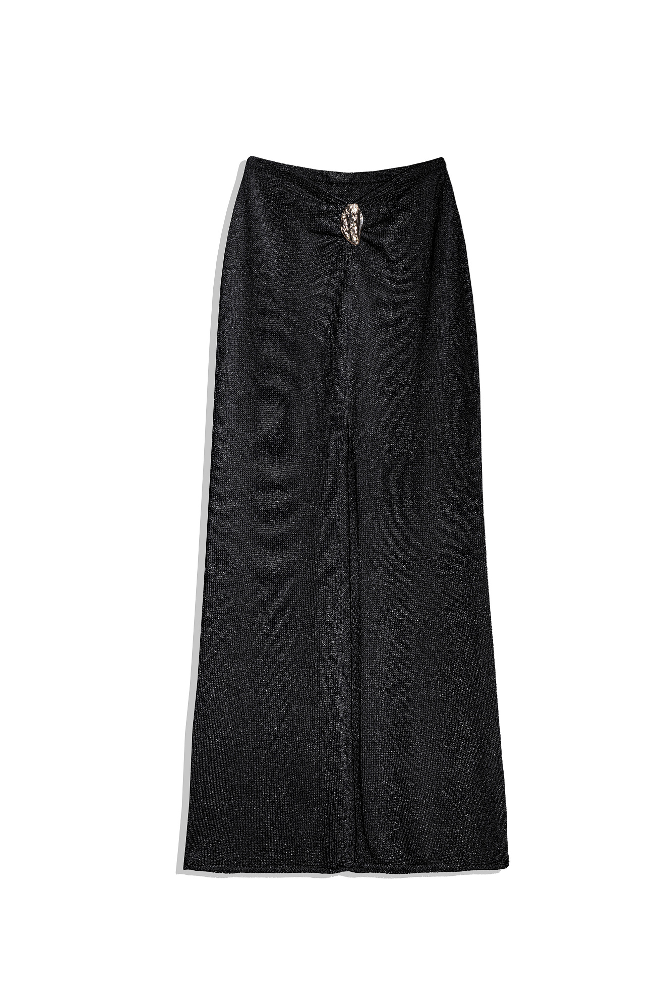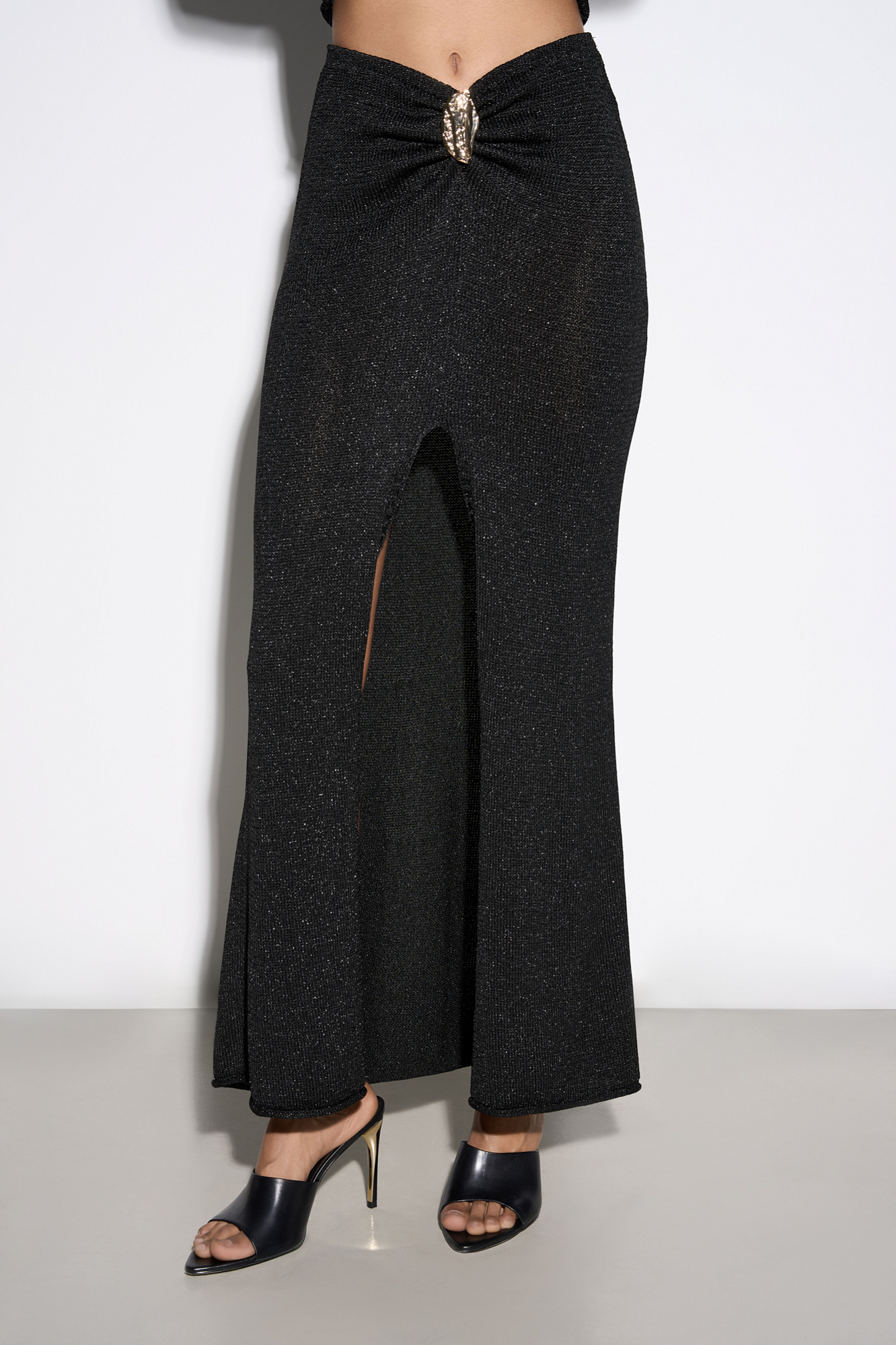 Трикотажная юбка длины макси из вискозы с люрексом. Модель с высоким разрезом спереди, валиком на подоле и акцентным элементом на поясе.