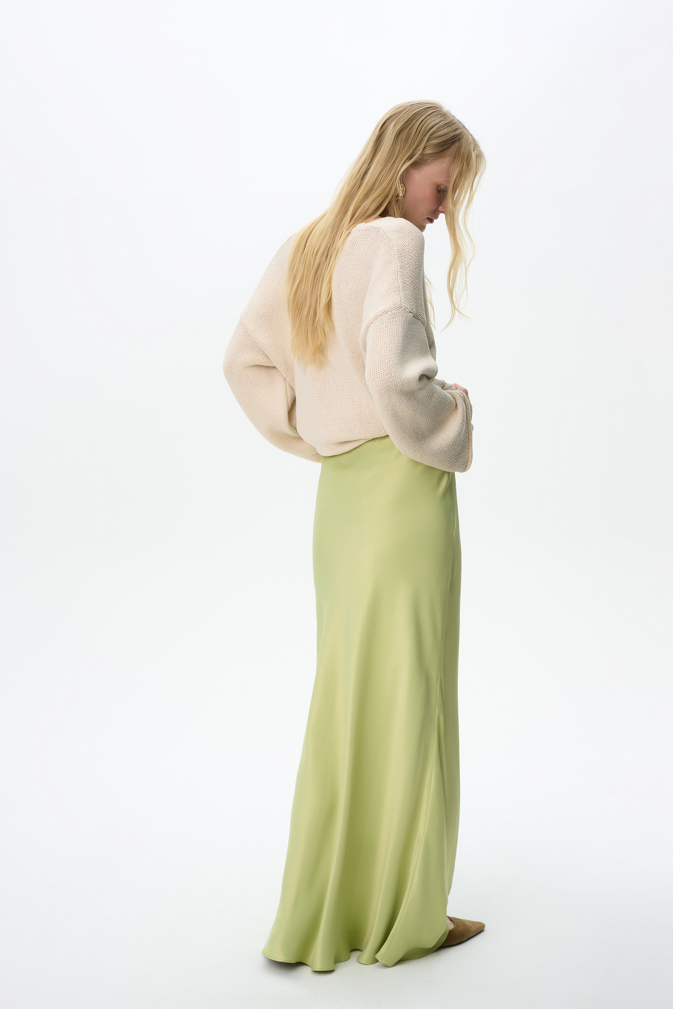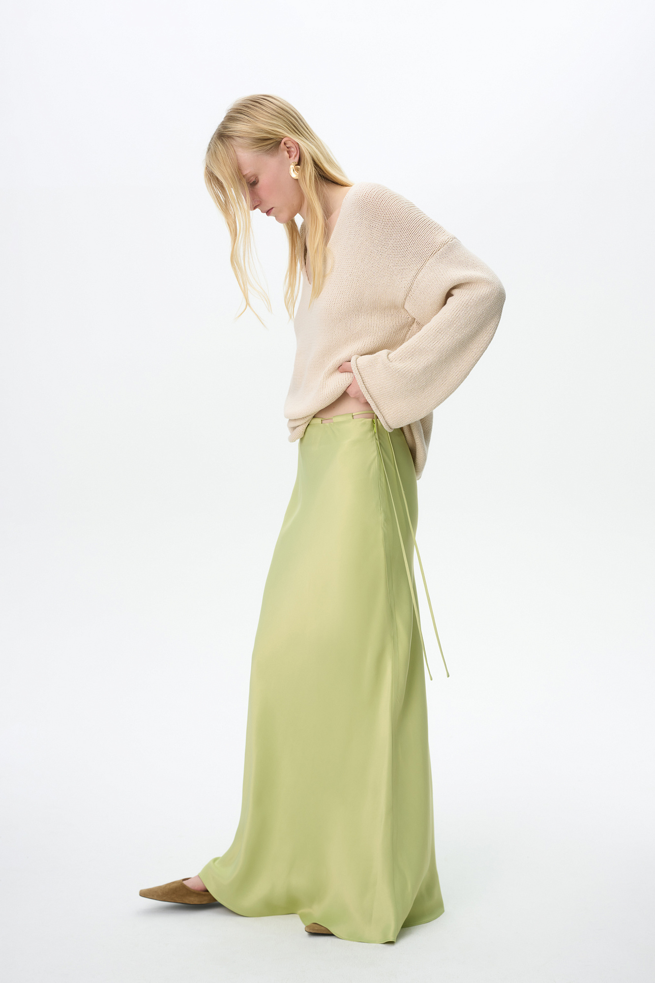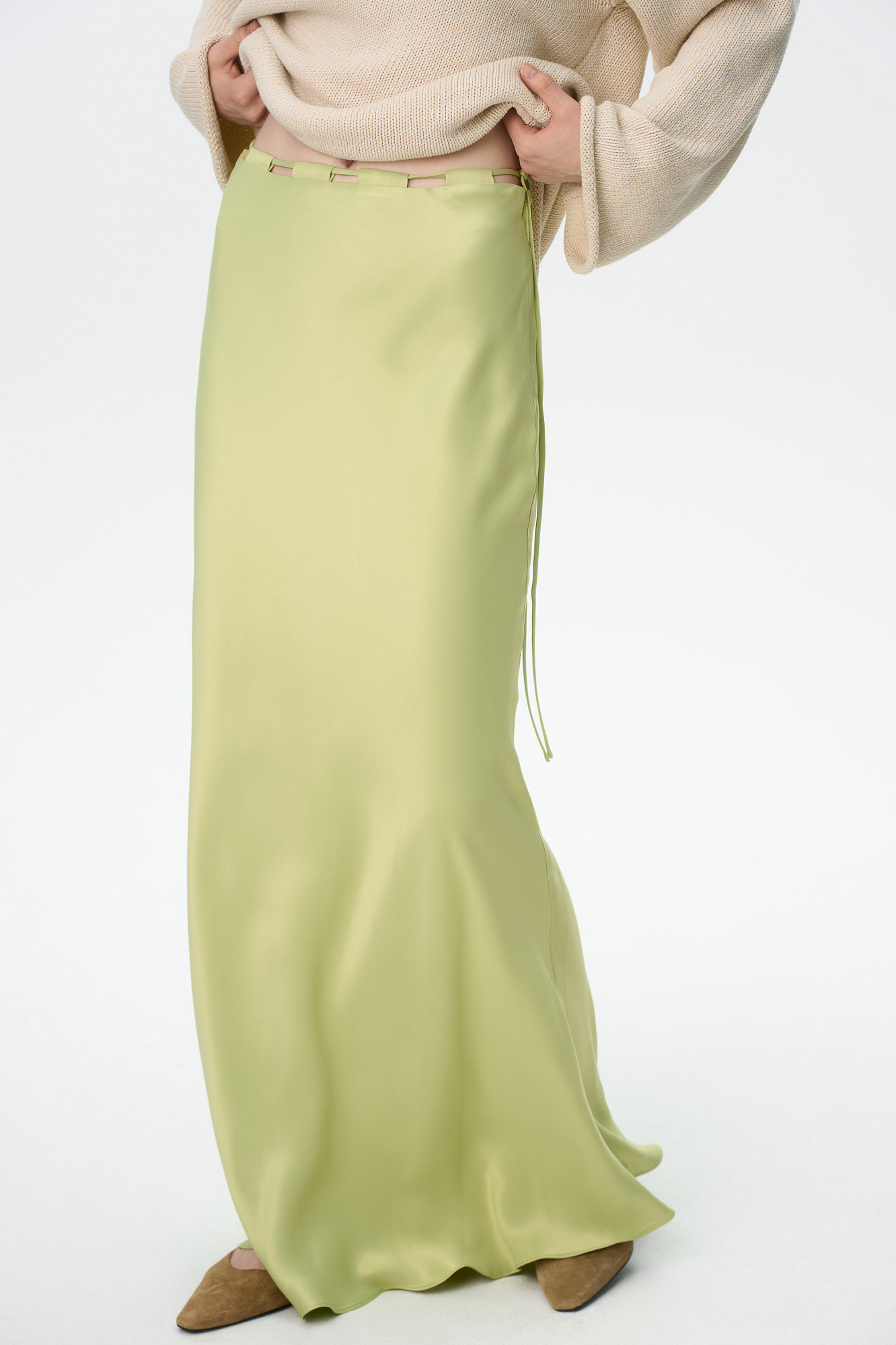 Атласная макси юбка. Модель приталенного силуэта с регулируемой кулиской на поясе.