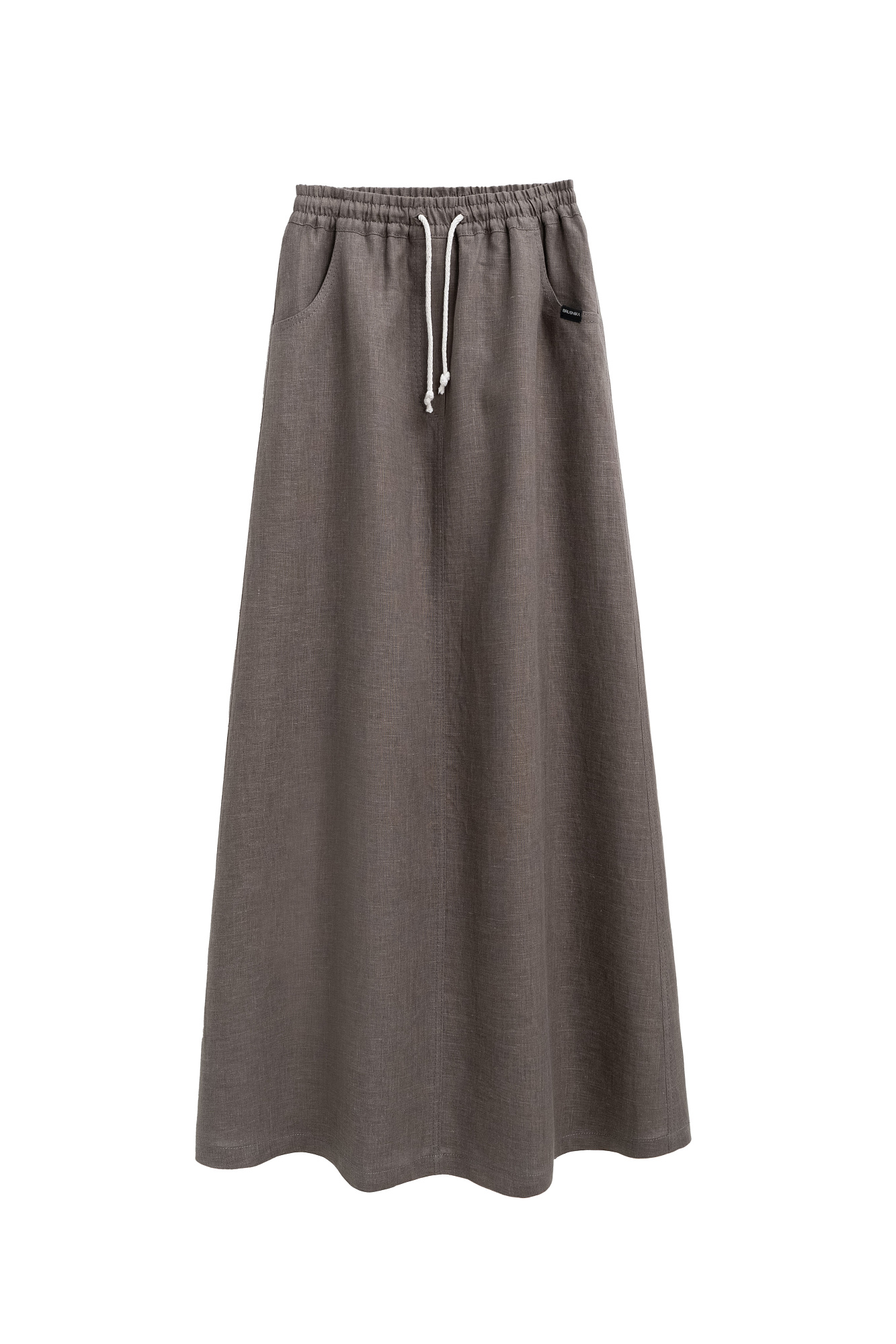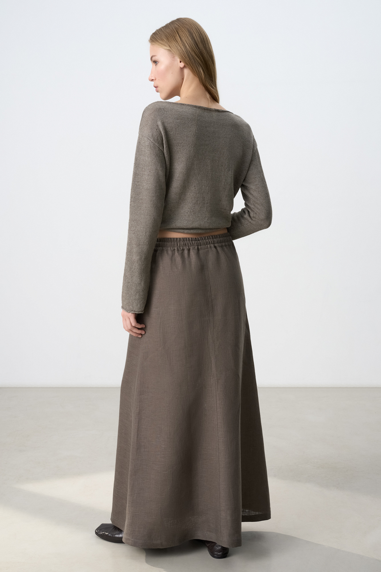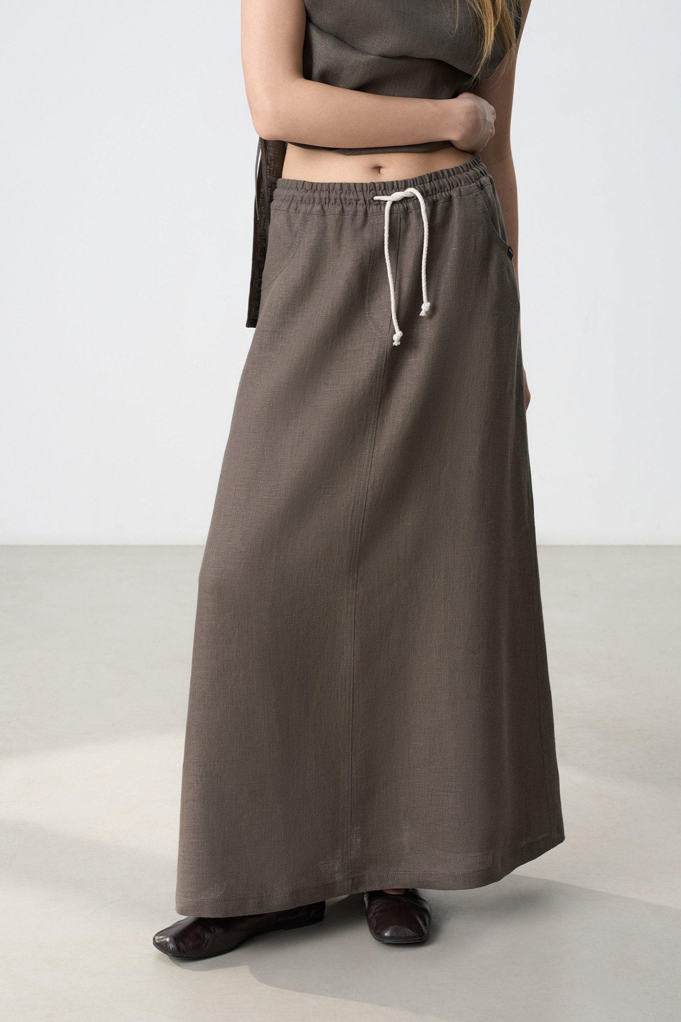 Юбка длины макси из 100% льна. Модель свободного силуэта с эластичным поясом на кулиске и боковыми карманами. Дополнить образ можно топом в том же стиле.