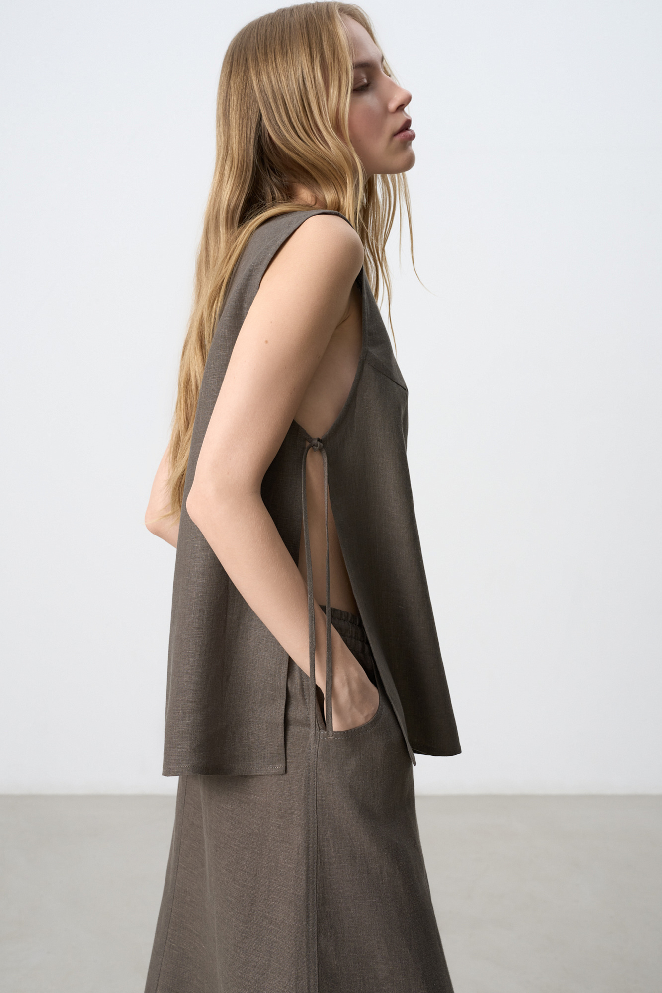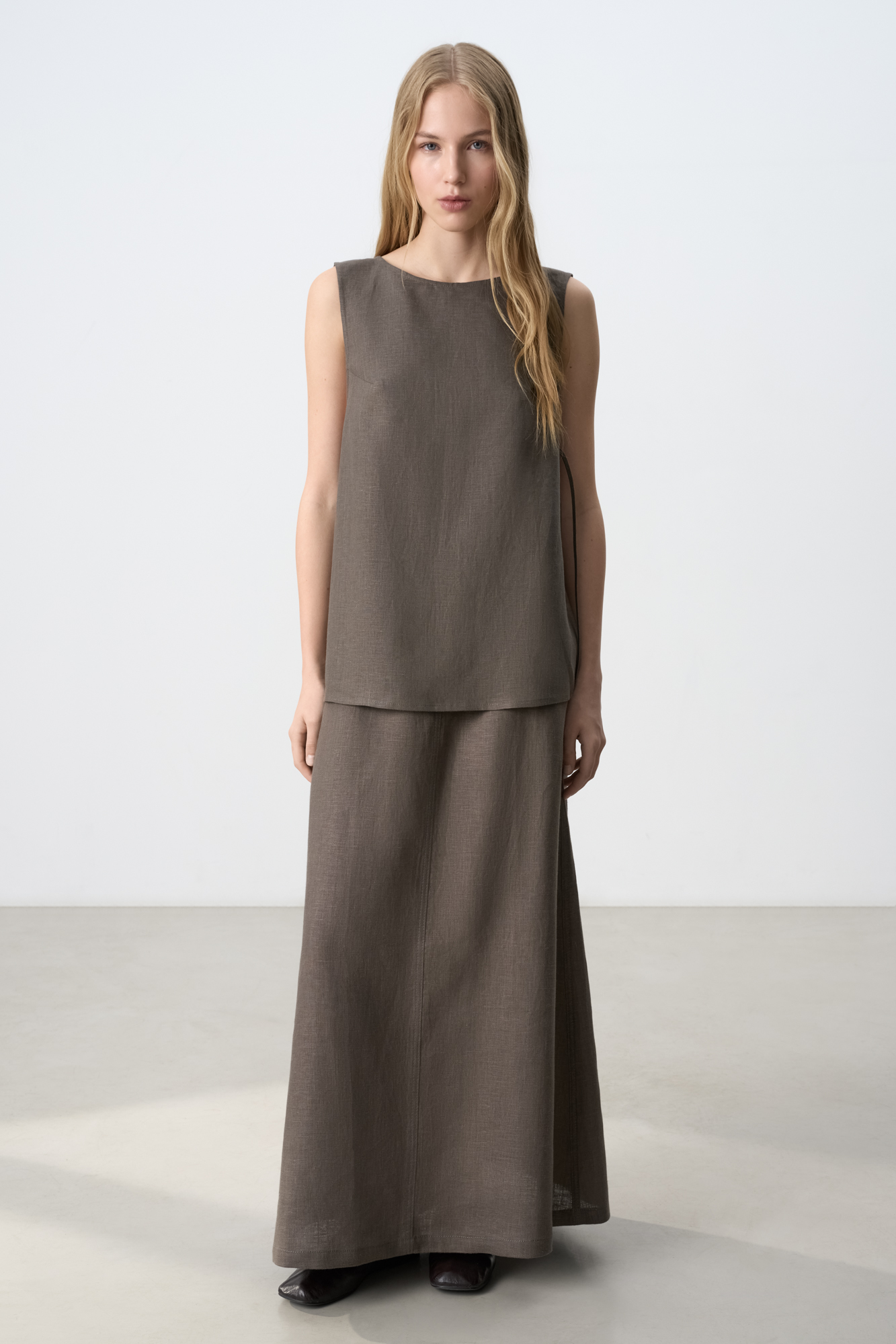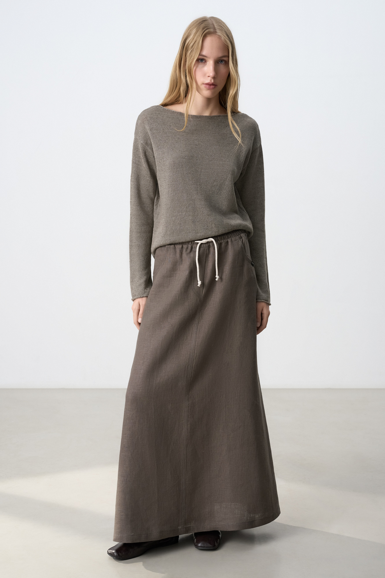 Юбка длины макси из 100% льна. Модель свободного силуэта с эластичным поясом на кулиске и боковыми карманами. Дополнить образ можно топом в том же стиле.