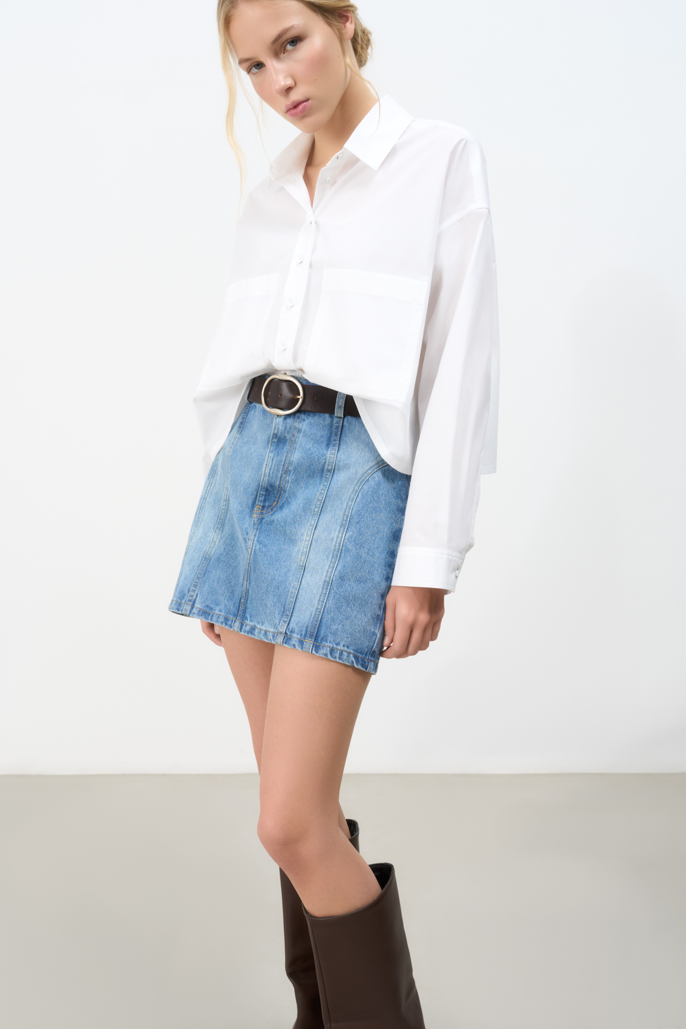 Джинсовая юбка с рельефными швами. Модель приталенного силуэта длины мини. Дополнить образ можно топом в таком же стиле.