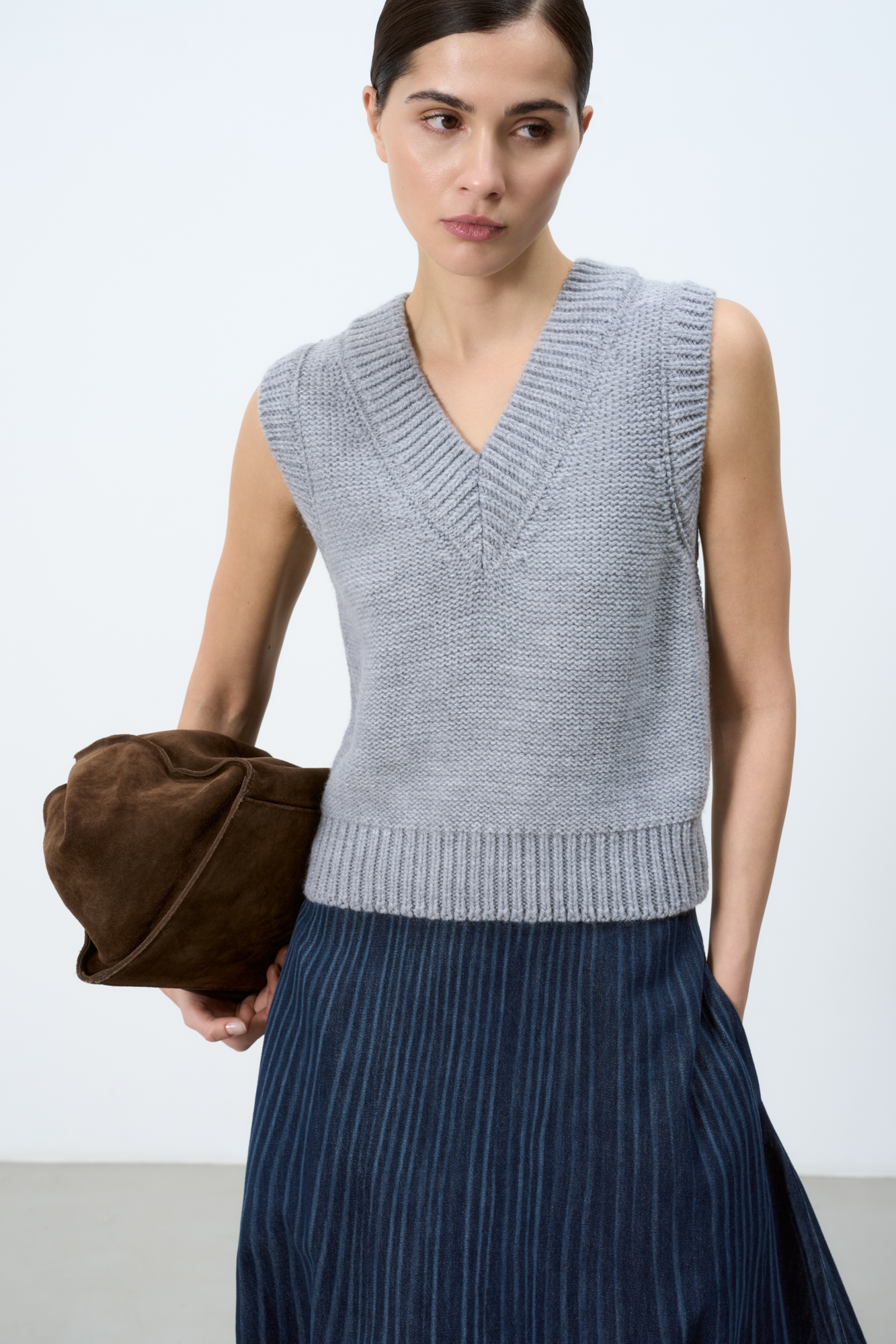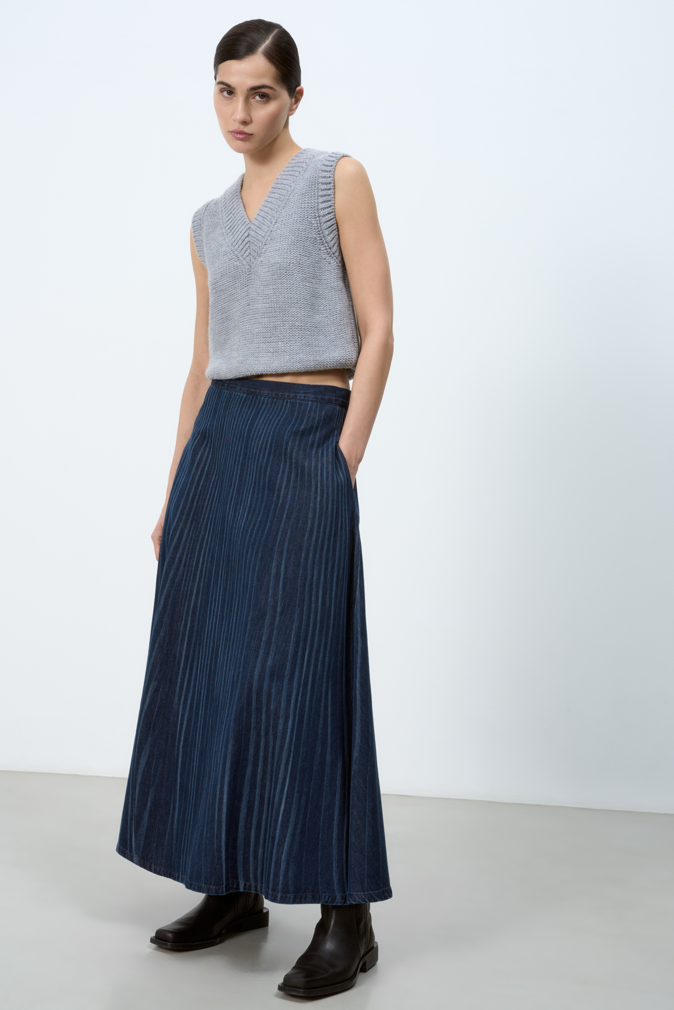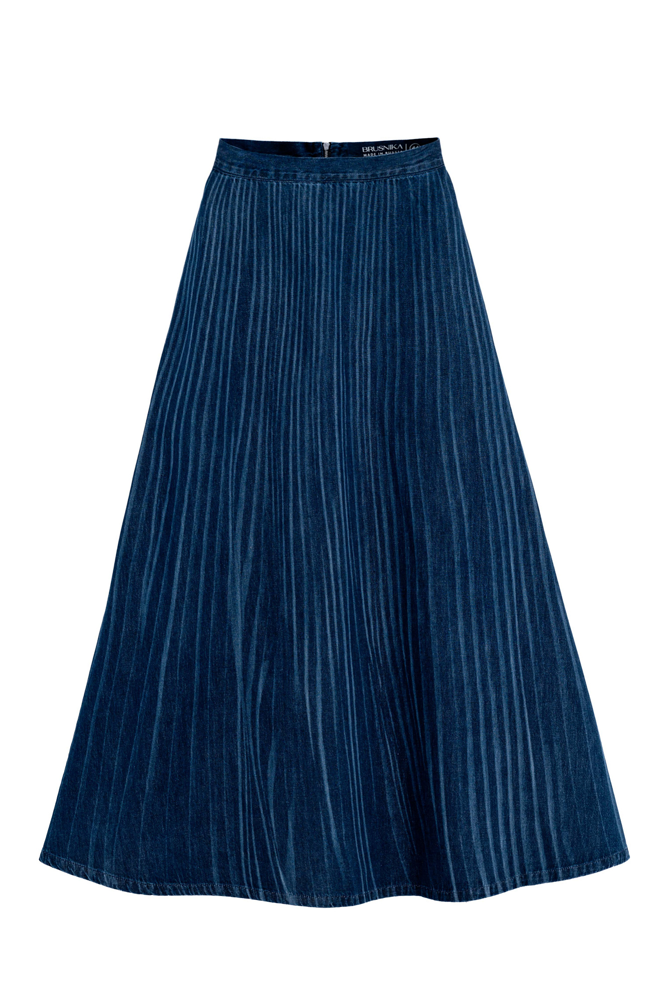 Джинсовая юбка с принтом, имитирующим складку. Модель свободного силуэта длины миди с застежкой на молнию и боковыми карманами.
